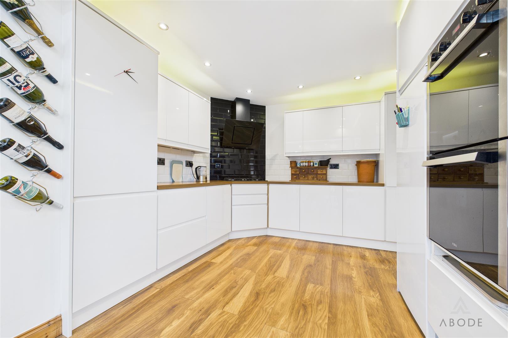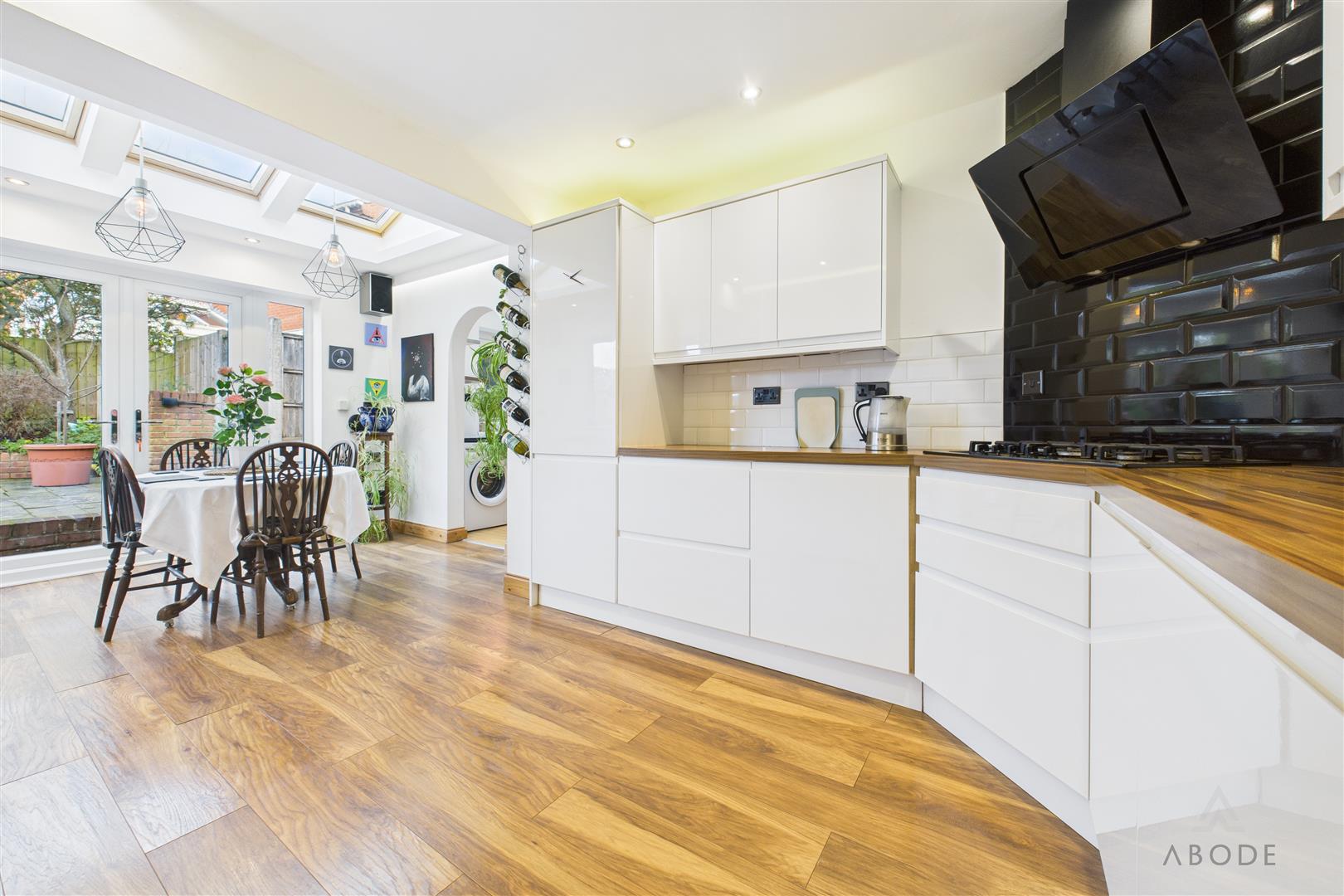 The ground floor features a welcoming entrance hall with parquet flooring and under-stairs storage, a dual-aspect lounge with log-burning fireplace and sliding doors to the rear garden, and a versatile dining room. The stunning open-plan kitchen/diner is filled with natural light and fitted with high-gloss units, wood-block-effect work surfaces, integrated appliances, and stylish LED lighting. A practical utility room offers storage, workspace, and internal access to the integral garage, while a ground-floor WC completes the layout.