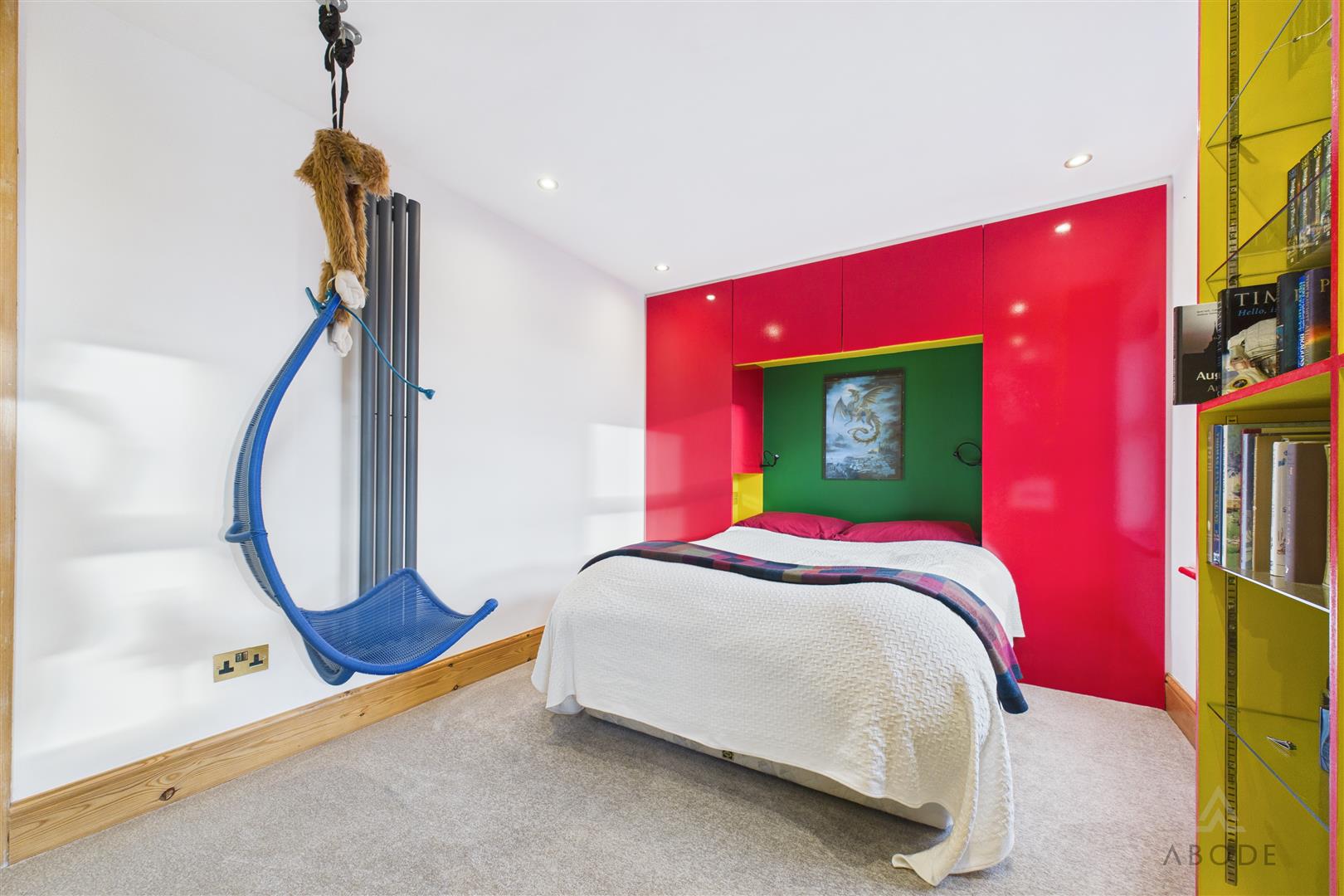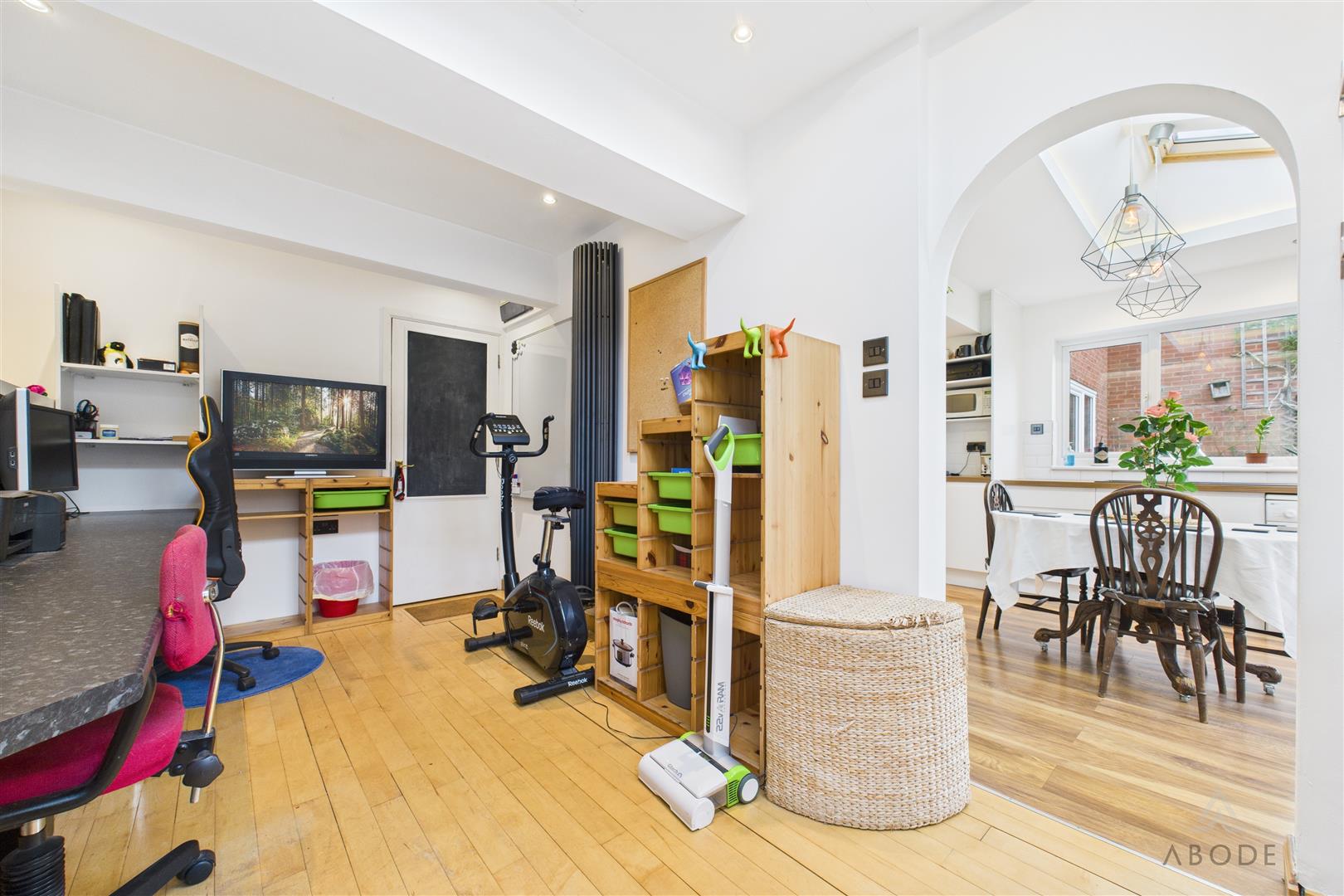 Upstairs, the principal bedroom boasts an en-suite shower room and dual-aspect windows, with two further double bedrooms, a fourth bedroom currently used as a dressing room or study, and a family bathroom.
