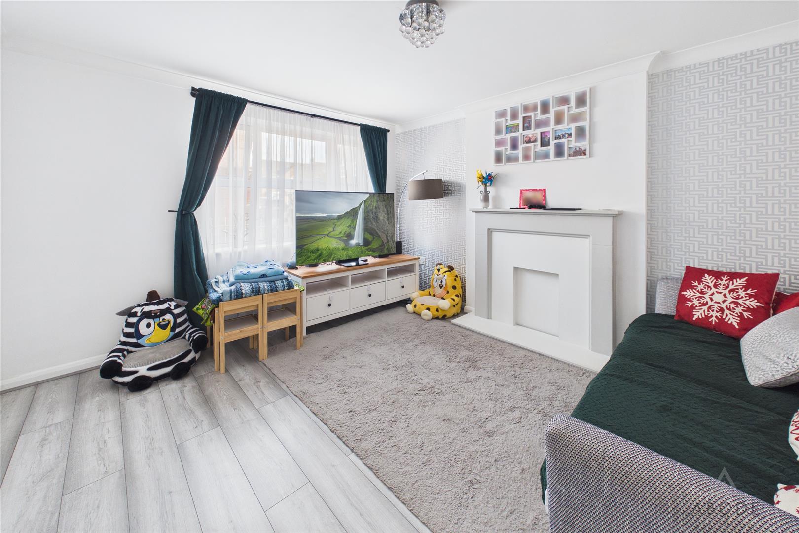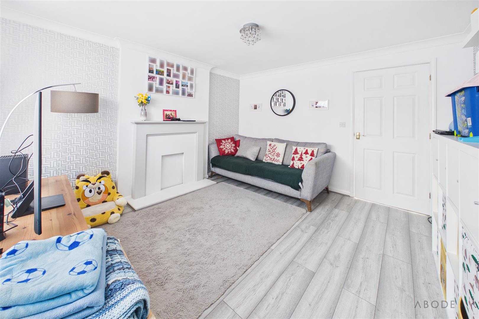 Feature fireplace, radiator, UPVC double glazed window, wood affect flooring and a door to the…