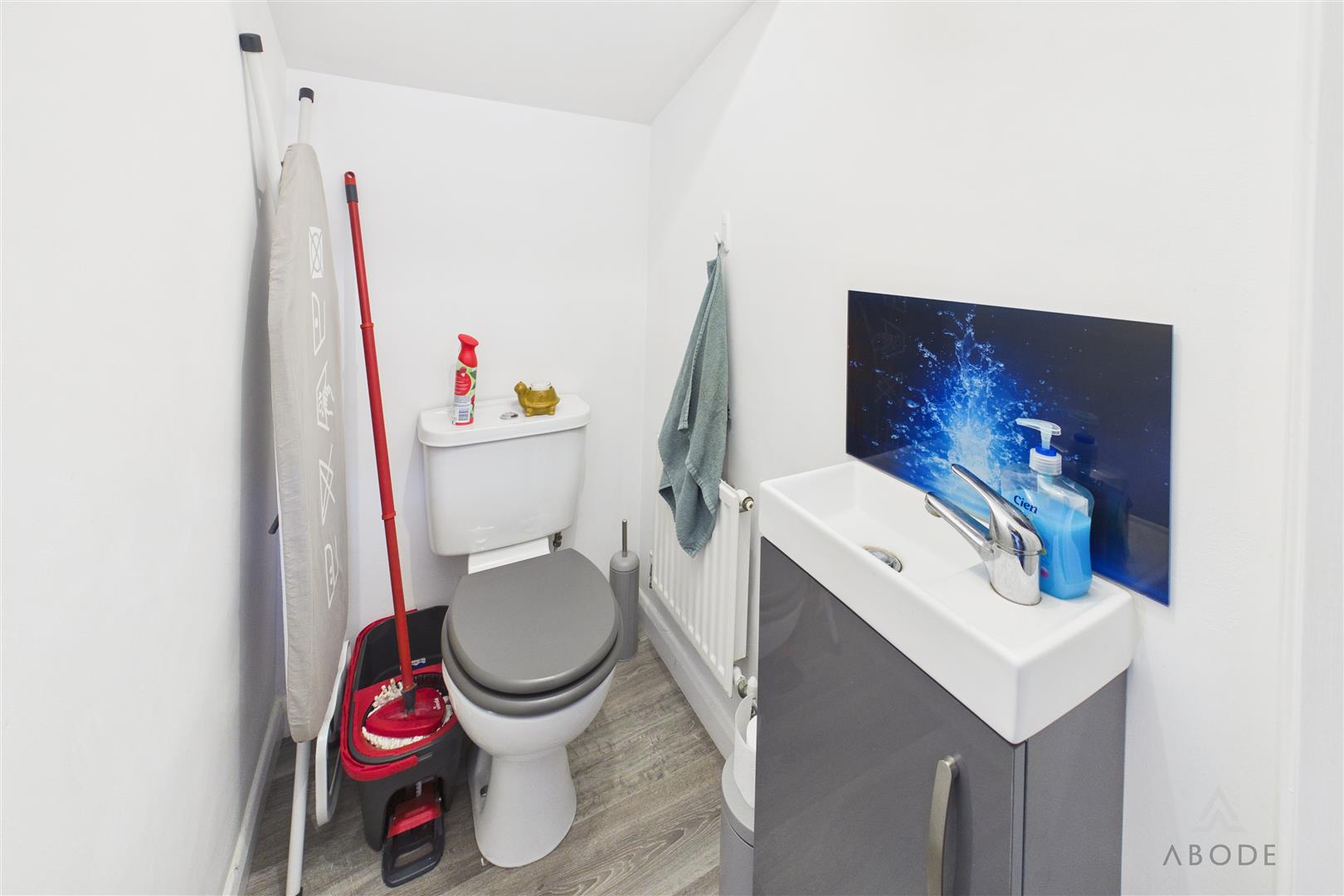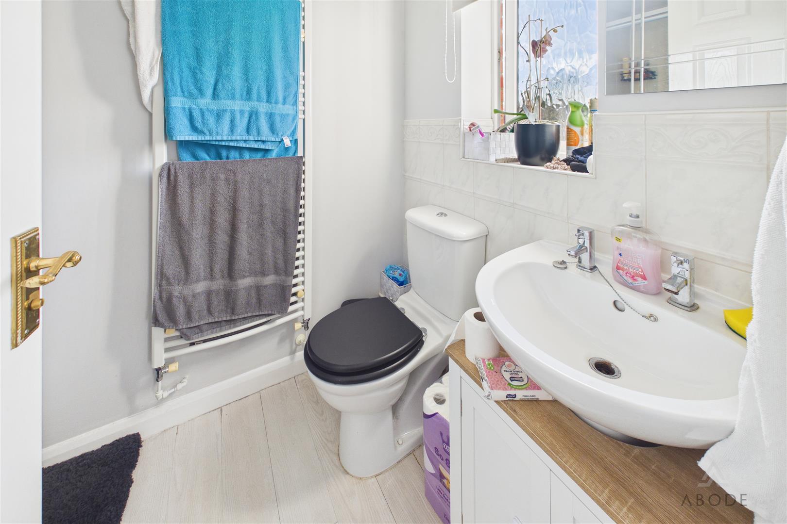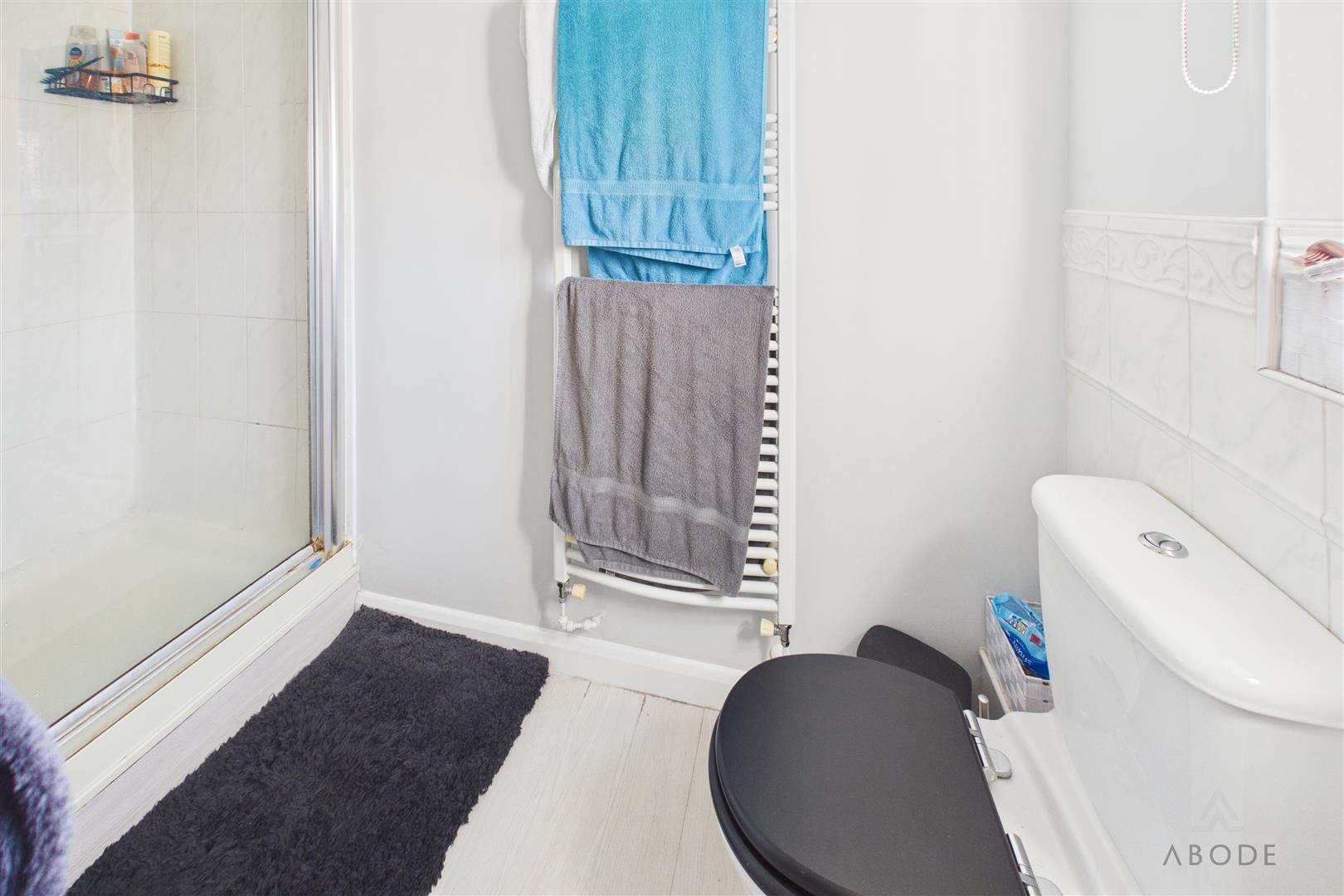 Enclosed shower, low flush WC, wash hand basin, ladder style radiator and a UPVC double glazed window.