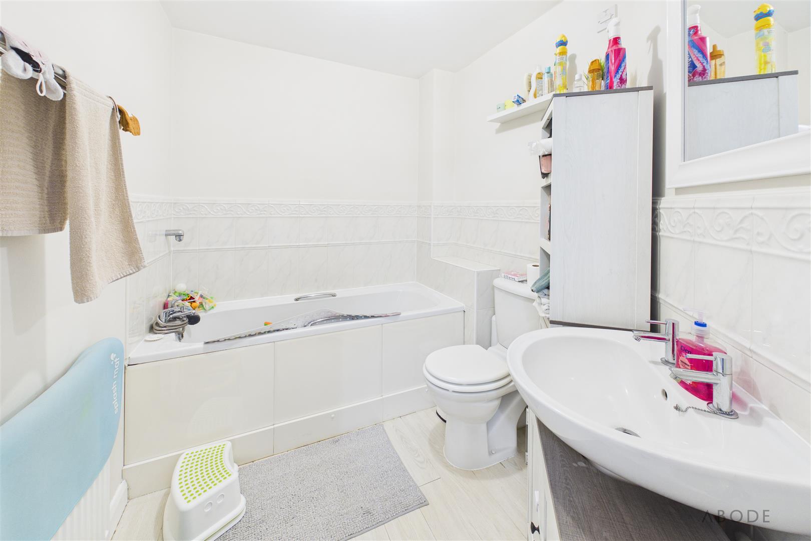 Panel enclosed bath, wash hand basin, low flush WC and a ladder style radiator.