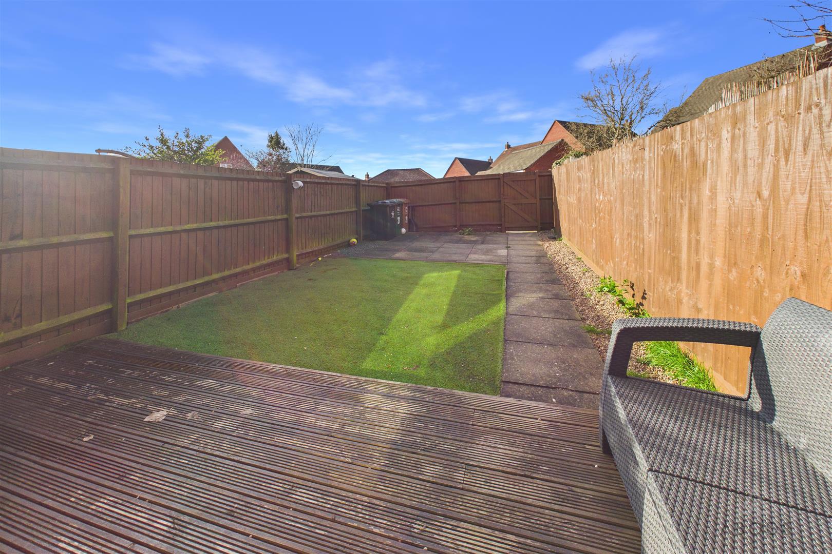 Front fore garden and an enclosed rear garden offered decked and paved seating areas and an artificial lawn, rear gate to the parking and a single garage.