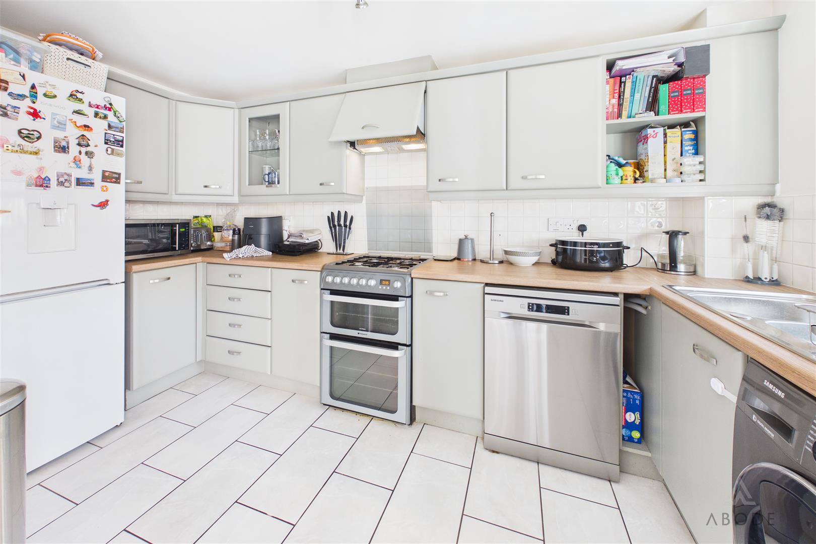 Fitted wall mounted base and drawer units with work surfaces and a sink and drainer unit. Plumbing and space for a dishwasher and washing machine, space for a cooker and fridge freezer, tiled floor and a UPVC double glazed window.