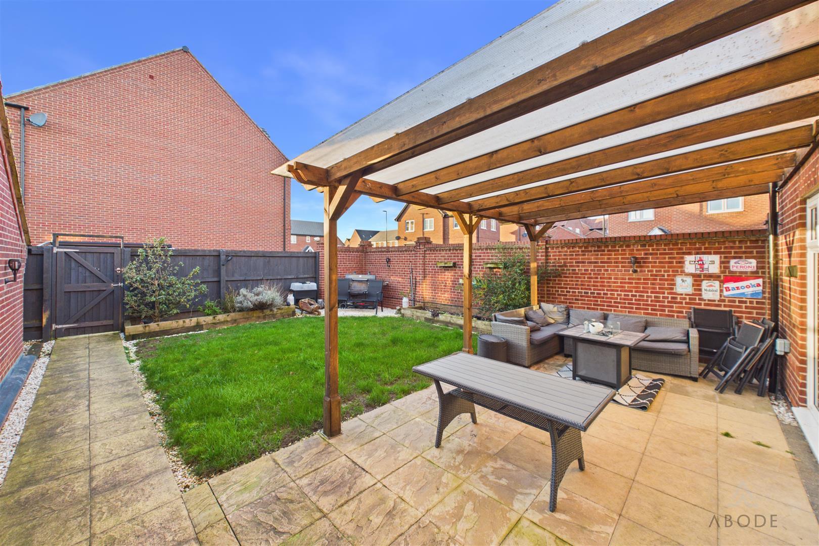 The rear garden is enclosed by attractive brick walling, offering a good degree of privacy. Laid mainly to lawn, it also benefits from a generous patio area and a covered pergola seating space, ideal for outdoor dining and entertaining throughout the warmer months.