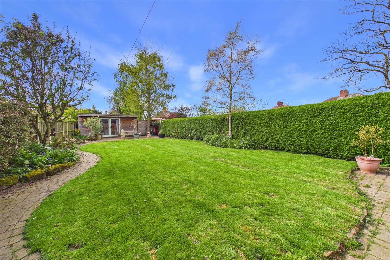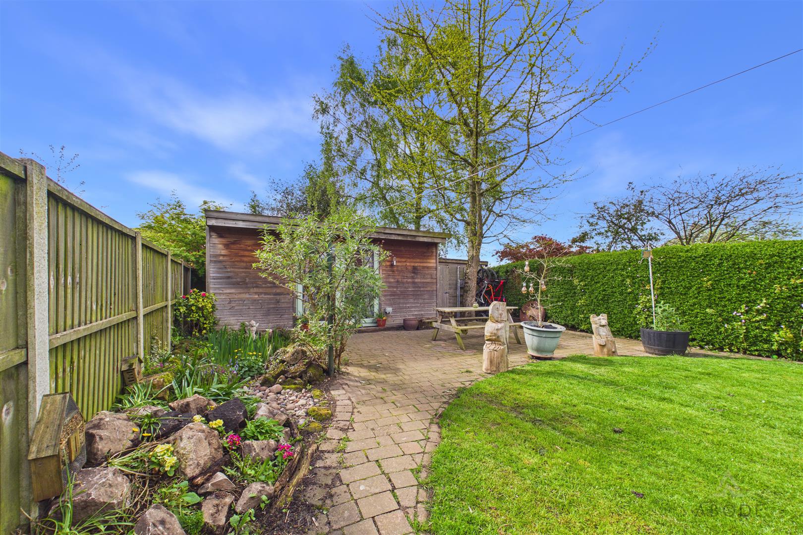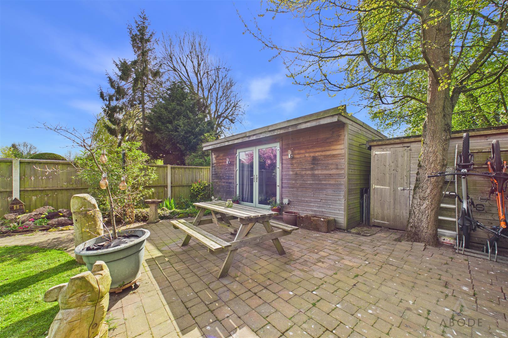 Externally, the property enjoys a particularly generous rear garden, providing an ideal setting for relaxing and socialising. A paved patio area offers space for outdoor seating and leads onto an extensive lawn bordered by established plants and shrubs. At the far end of the garden sits a substantial timber-built garden room, complete with power and double doors, offering excellent flexibility as a home office, gym, studio, or additional living space.