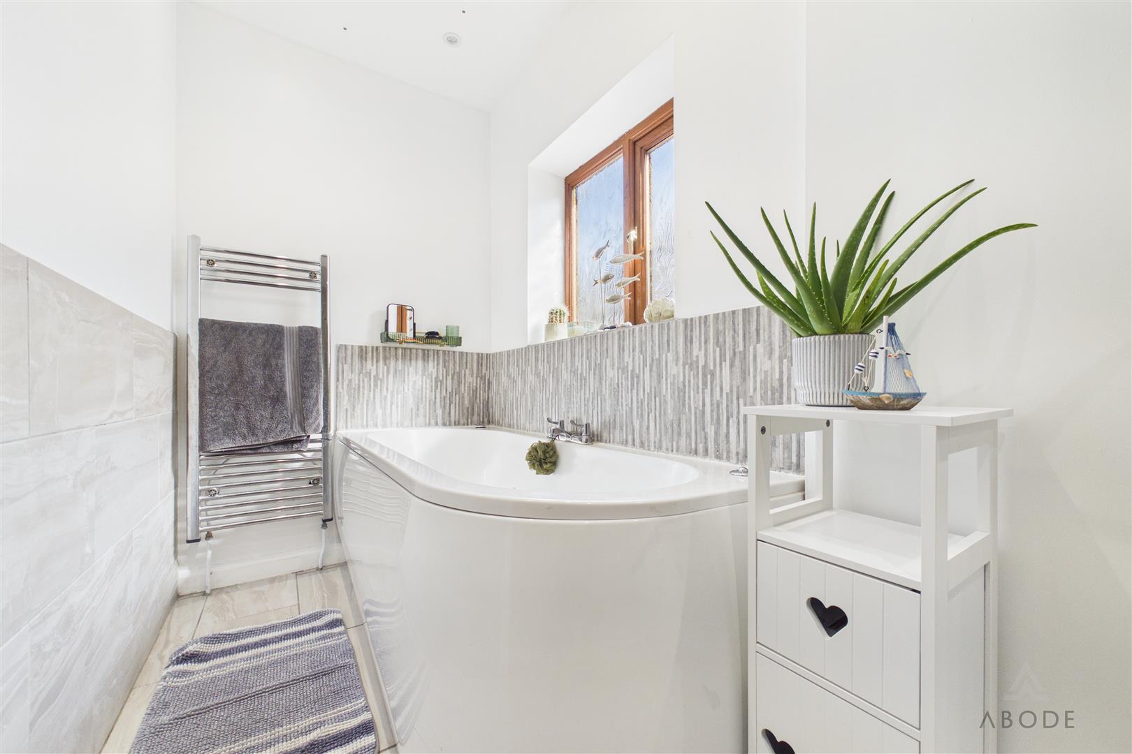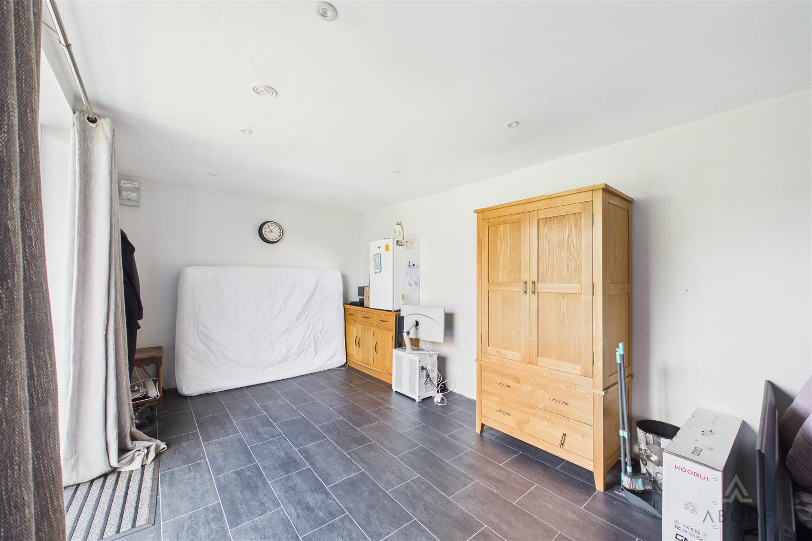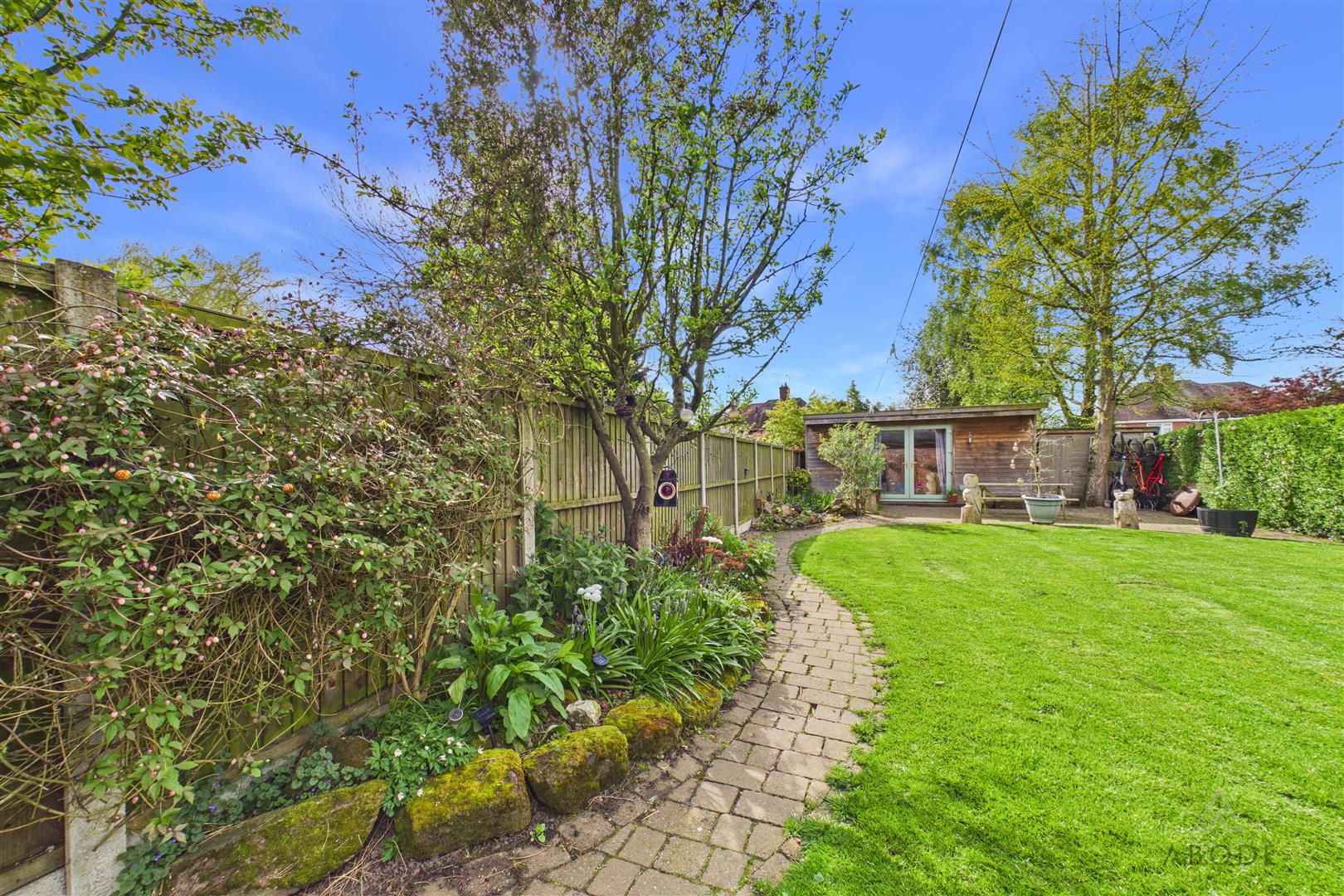 Externally, the property enjoys a particularly generous rear garden, providing an ideal setting for relaxing and socialising. A paved patio area offers space for outdoor seating and leads onto an extensive lawn bordered by established plants and shrubs. At the far end of the garden sits a substantial timber-built garden room, complete with power and double doors, offering excellent flexibility as a home office, gym, studio, or additional living space.