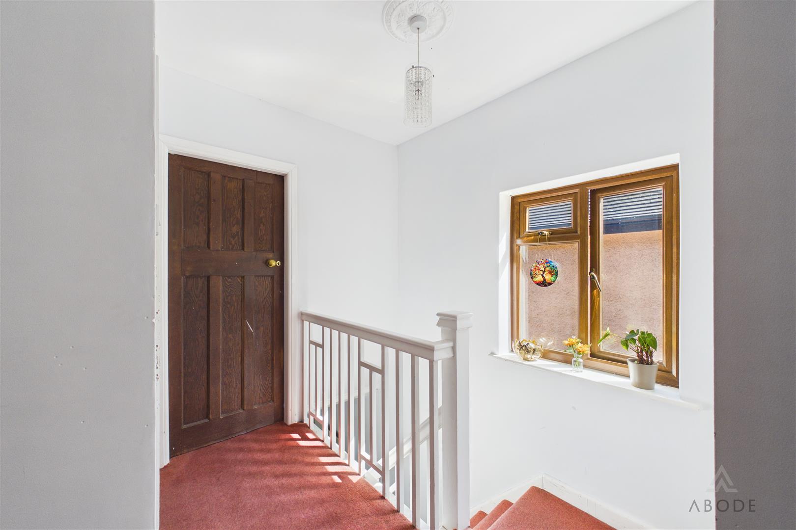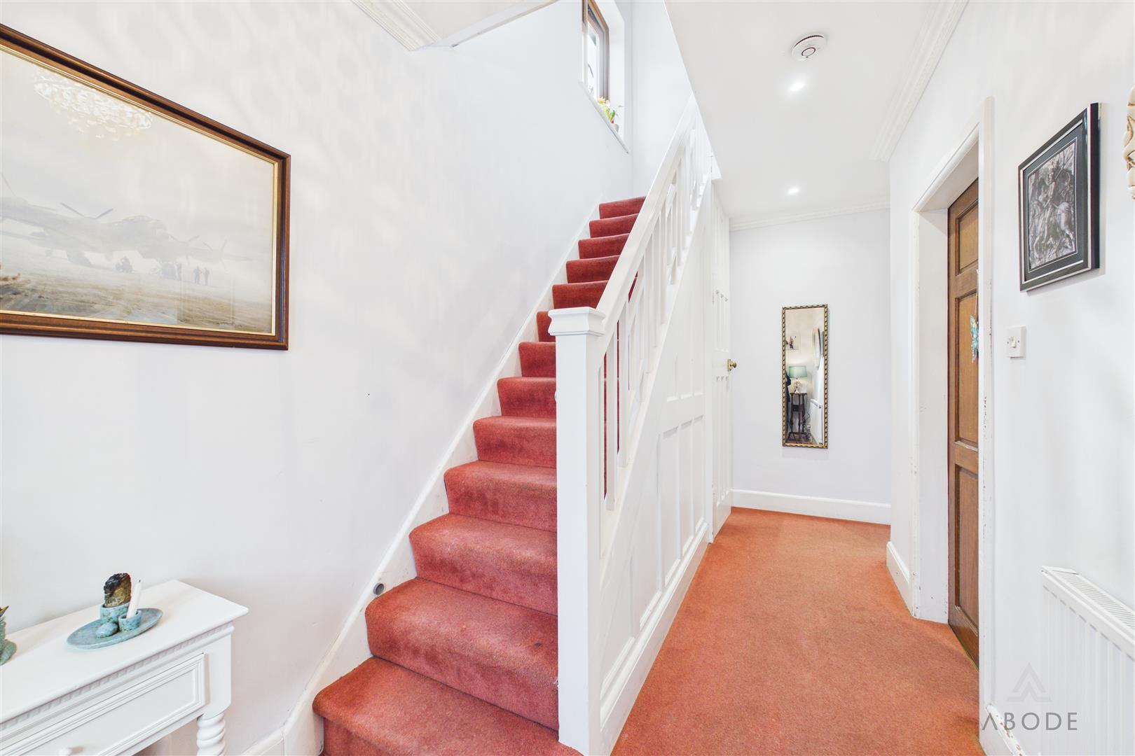 Entered via a uPVC double glazed stained glass front door, the welcoming hallway features a panelled staircase rising to the first floor, a central heating radiator, coving to ceiling, and a…