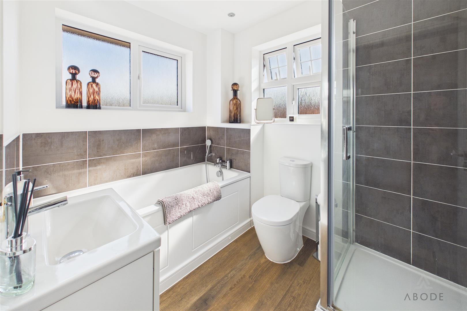 Upstairs, there are three well-proportioned bedrooms, including a principal bedroom with en suite shower room, along with a stylish family bathroom featuring both a bath and a separate shower.