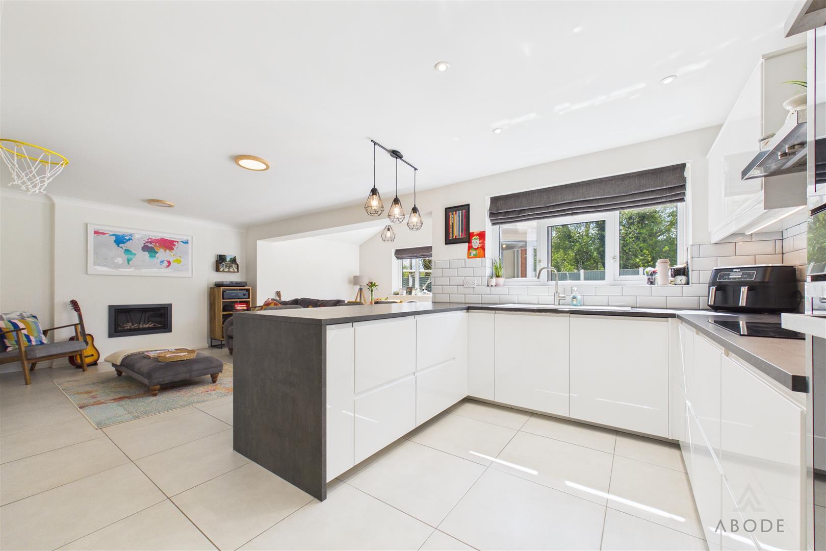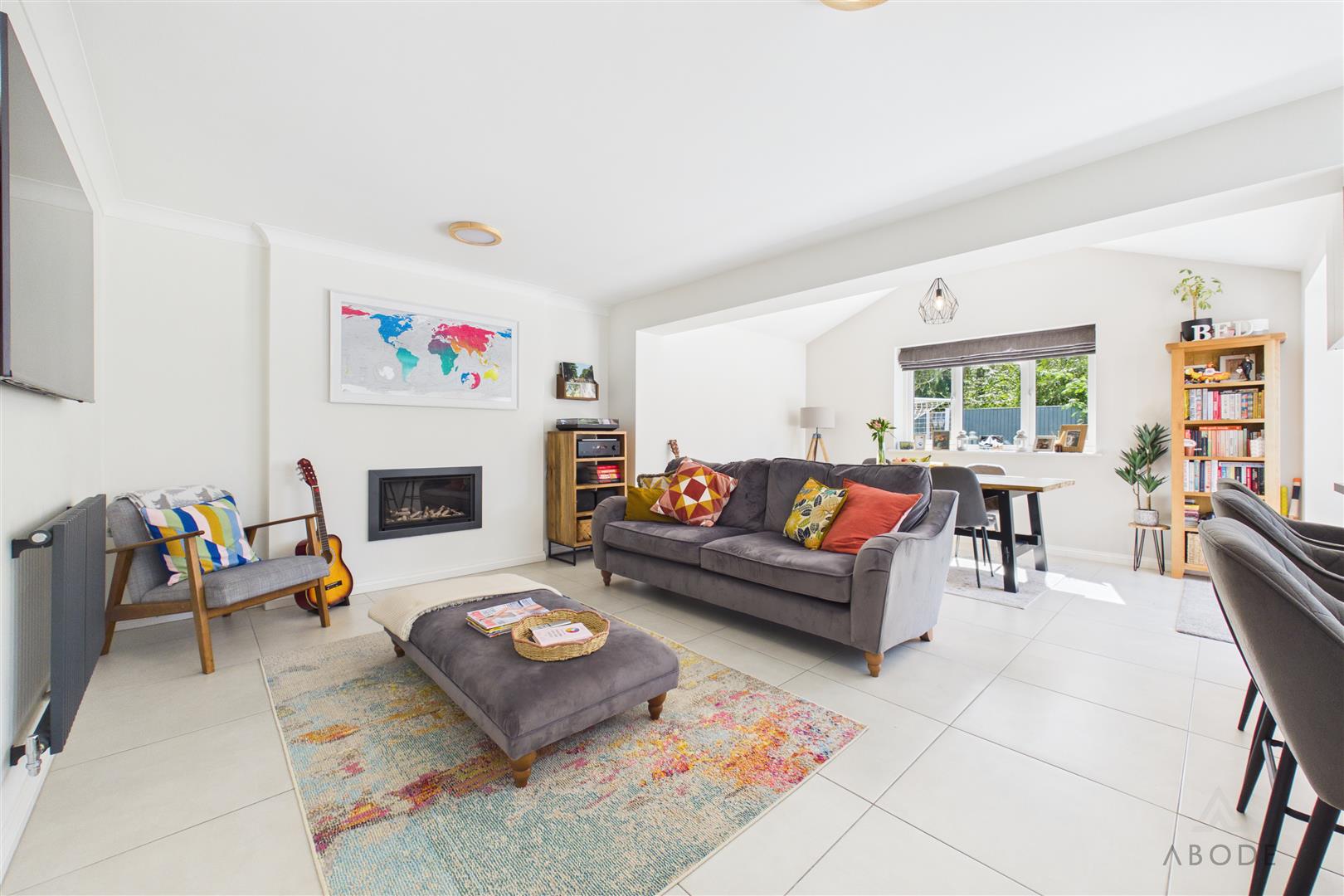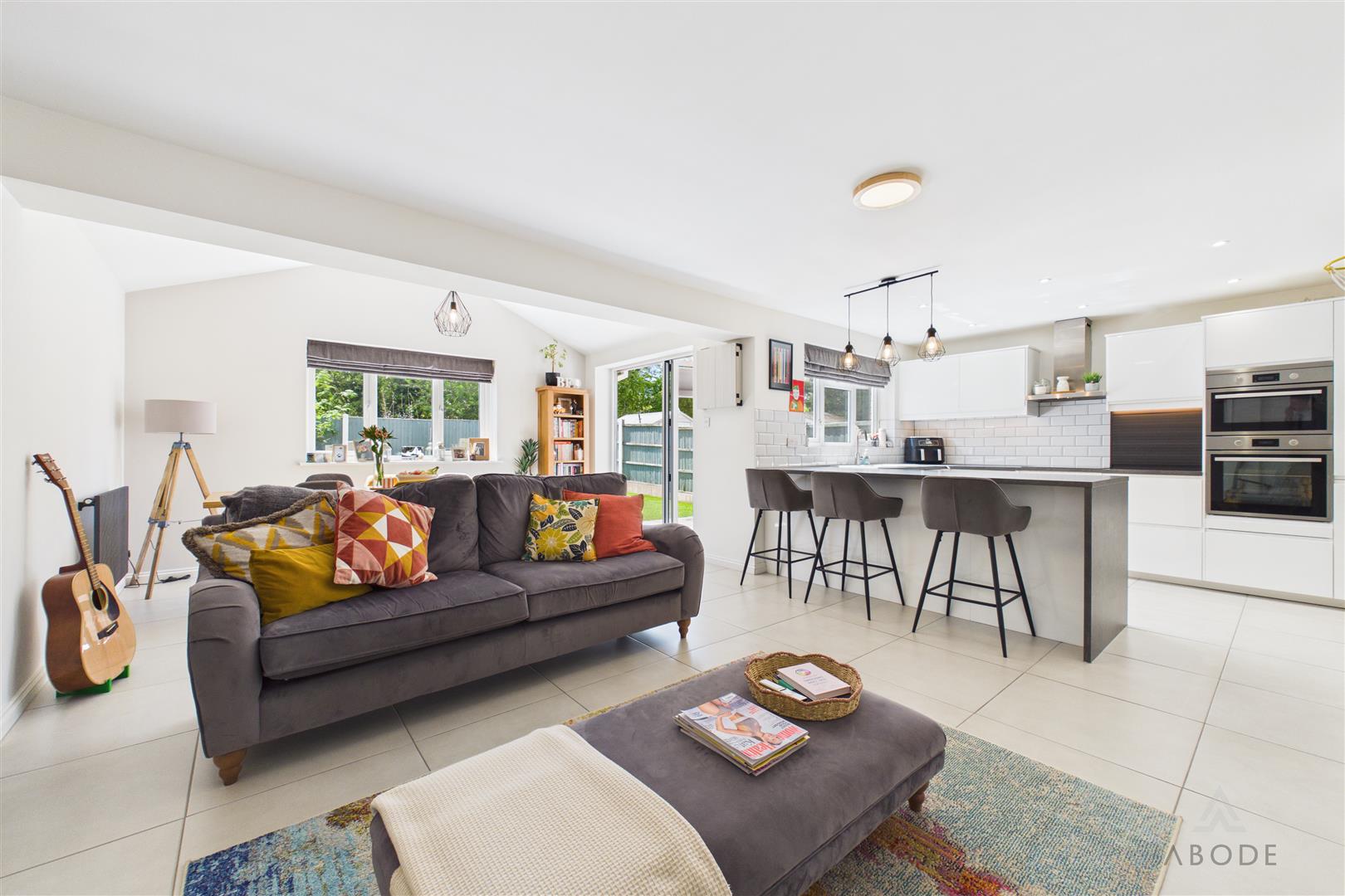 The property briefly comprises a welcoming entrance hallway, guest cloakroom, a versatile family room, and an impressive, extended open-plan kitchen/dining/living area forming the heart of the home—perfect for both everyday living and entertaining. The contemporary kitchen features high-gloss units and integrated appliances, with the living and dining areas enhanced by bi-fold doors opening onto the low maintenance garden.