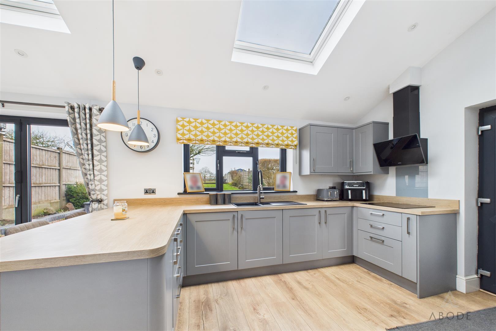 The rear extension forms the heart of the property and provides a spacious open-plan kitchen and family area, flooded with natural light via skylights and large rear-facing windows. The kitchen is fitted with a range of modern shaker-style wall and base units, complemented by generous work surfaces, integrated appliances and a breakfast bar ideal for informal dining. This impressive space enjoys excellent views over the garden and offers direct access to the rear patio, making it ideal for both everyday family life and entertaining.