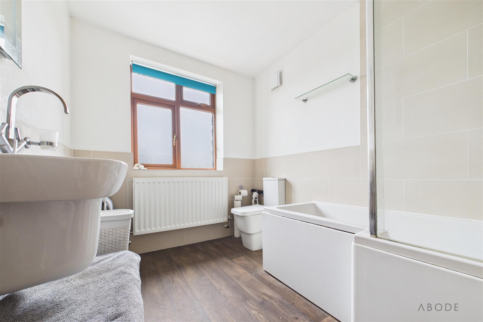 The family bathroom is fitted with a modern white suite comprising a panelled bath with shower over, wash hand basin and low-level WC, finished with complementary tiling and flooring.
