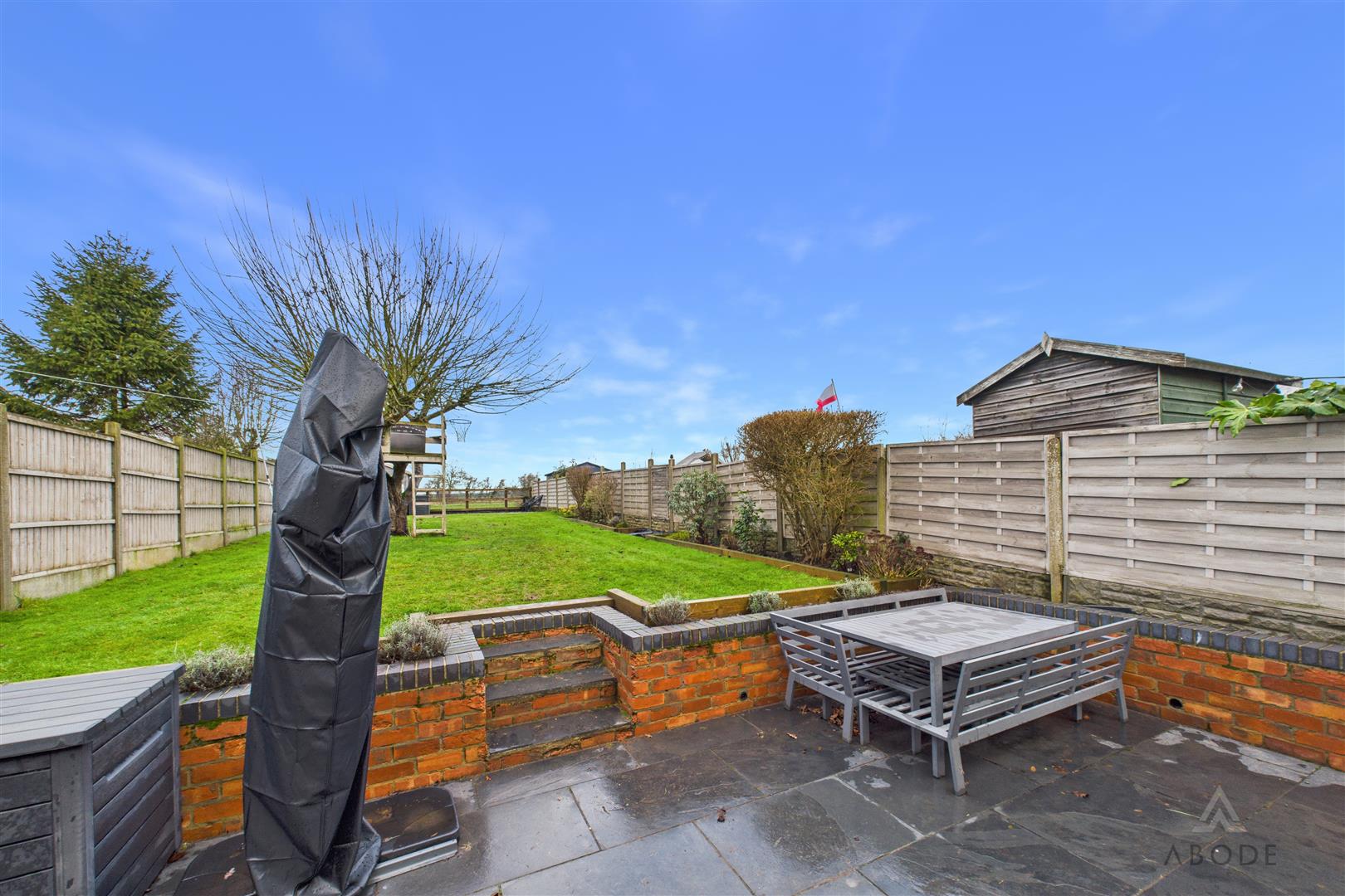 To the front, the property benefits from a driveway providing off-street parking and access to a gated side entrance. The rear garden is a particular highlight, offering a good degree of privacy and an excellent size for families. Immediately to the rear of the house is a paved patio area, ideal for outdoor seating and dining, which leads onto a well-maintained lawn. The garden is enclosed by fencing and features a timber shed and established planting, making it both practical and enjoyable throughout the year.