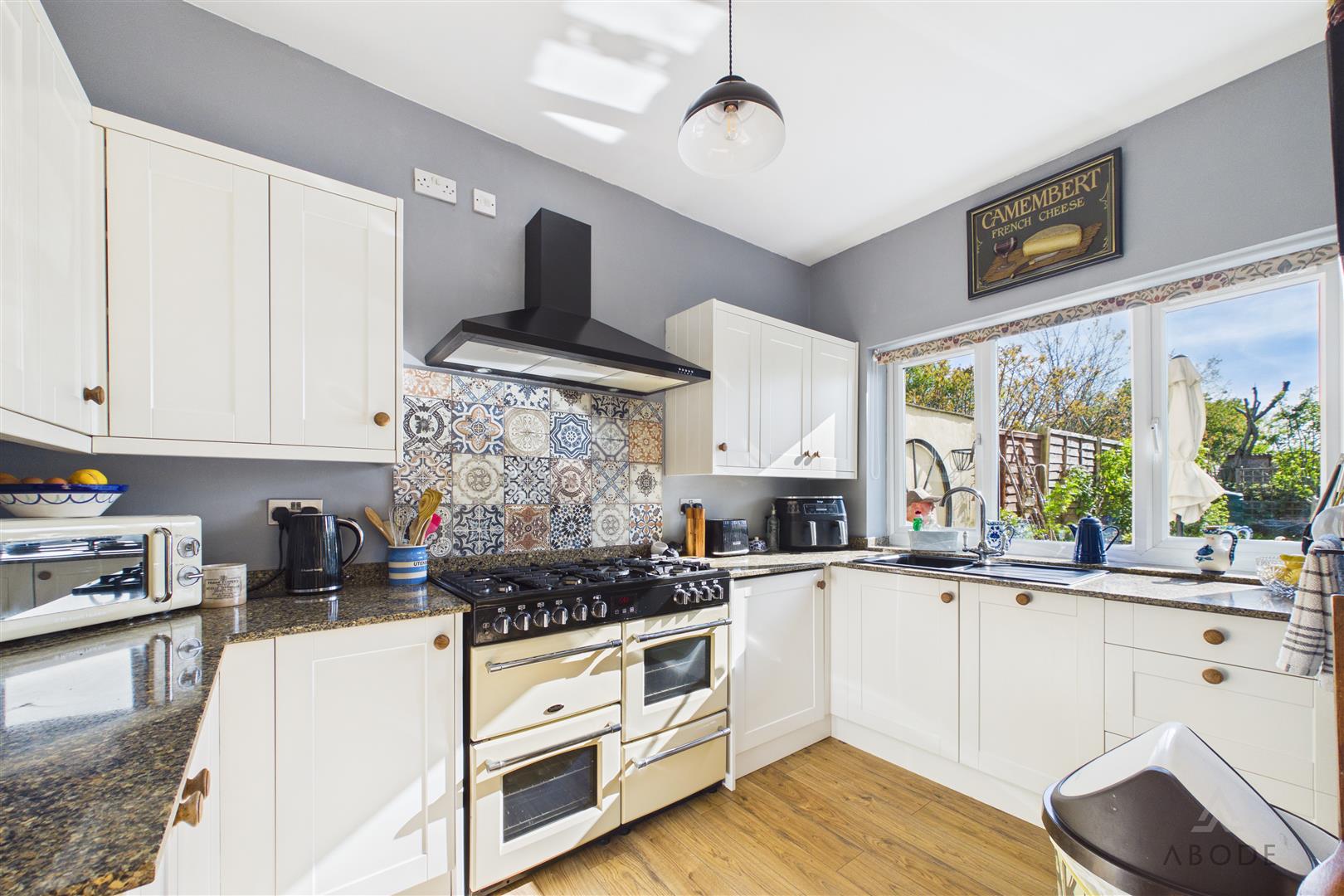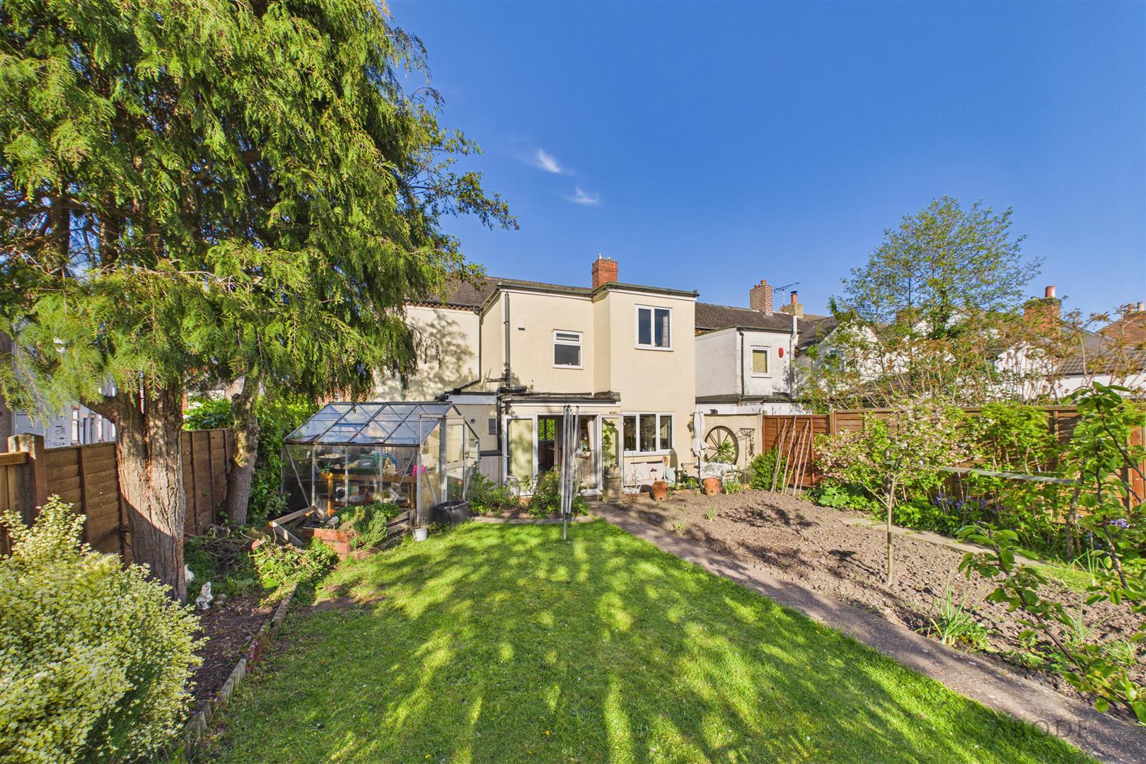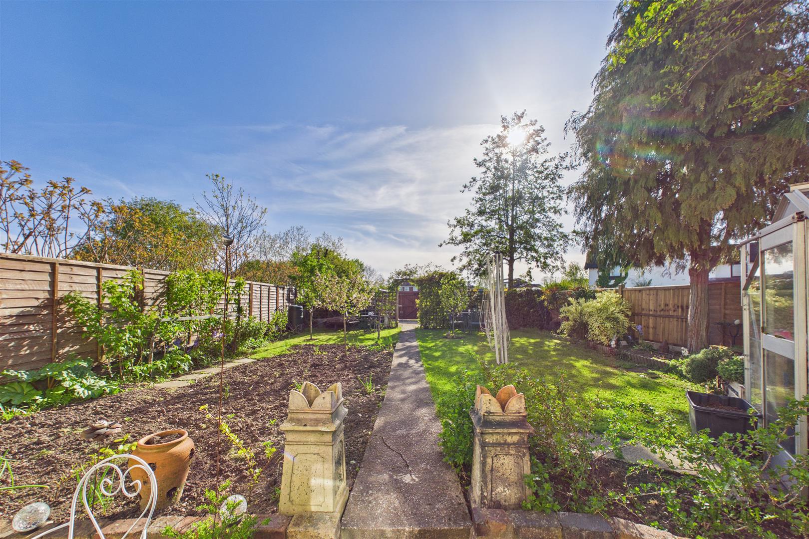 Externally, the property truly excels with a substantial rear garden, mainly laid to lawn with well-stocked planting areas, mature trees, and a pathway leading through the plot, creating a private and established outdoor space.