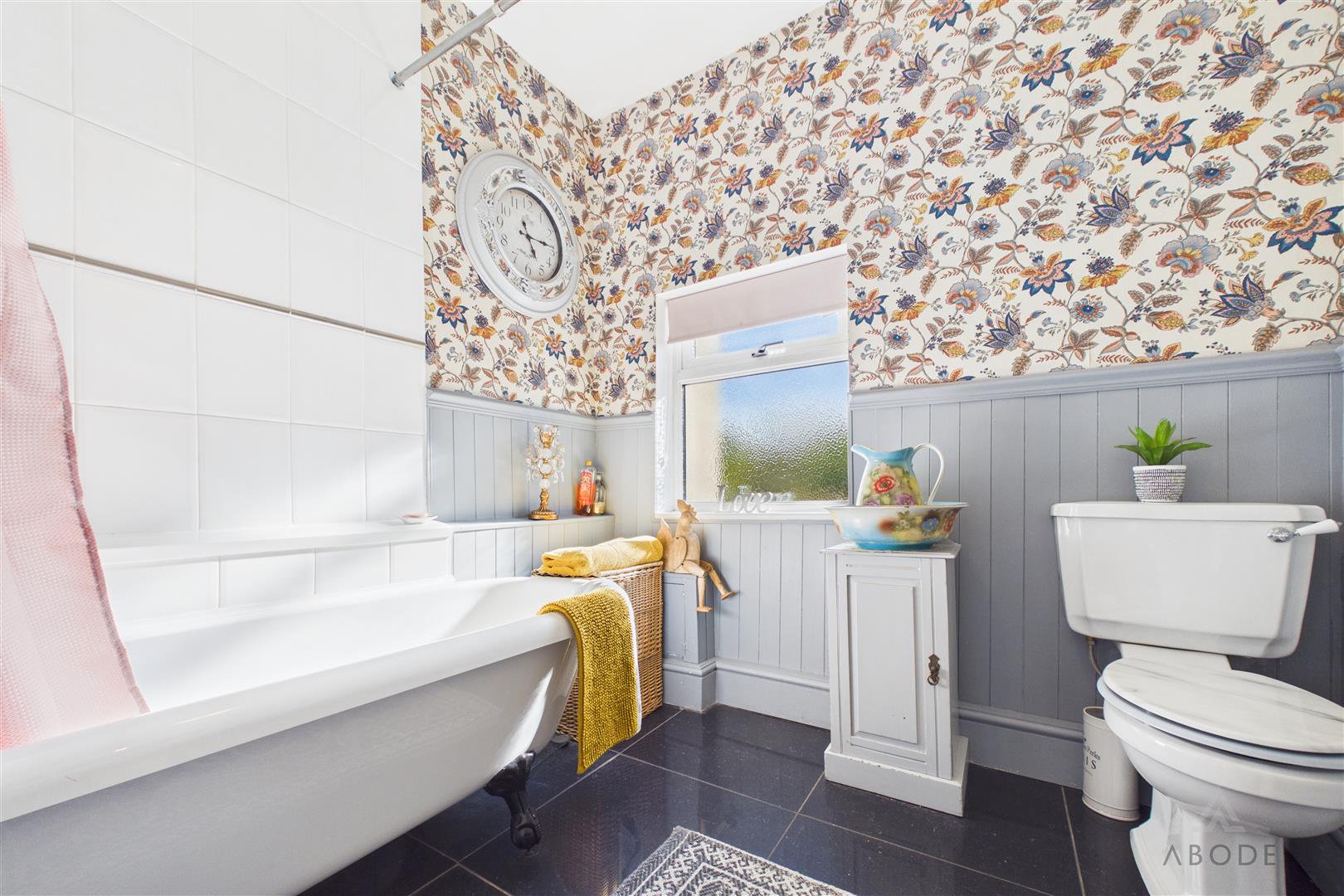 The bathroom is fitted with a suite comprising a roll top bath with shower over, wash hand basin, and low-level WC, presented in keeping with the overall style of the home.