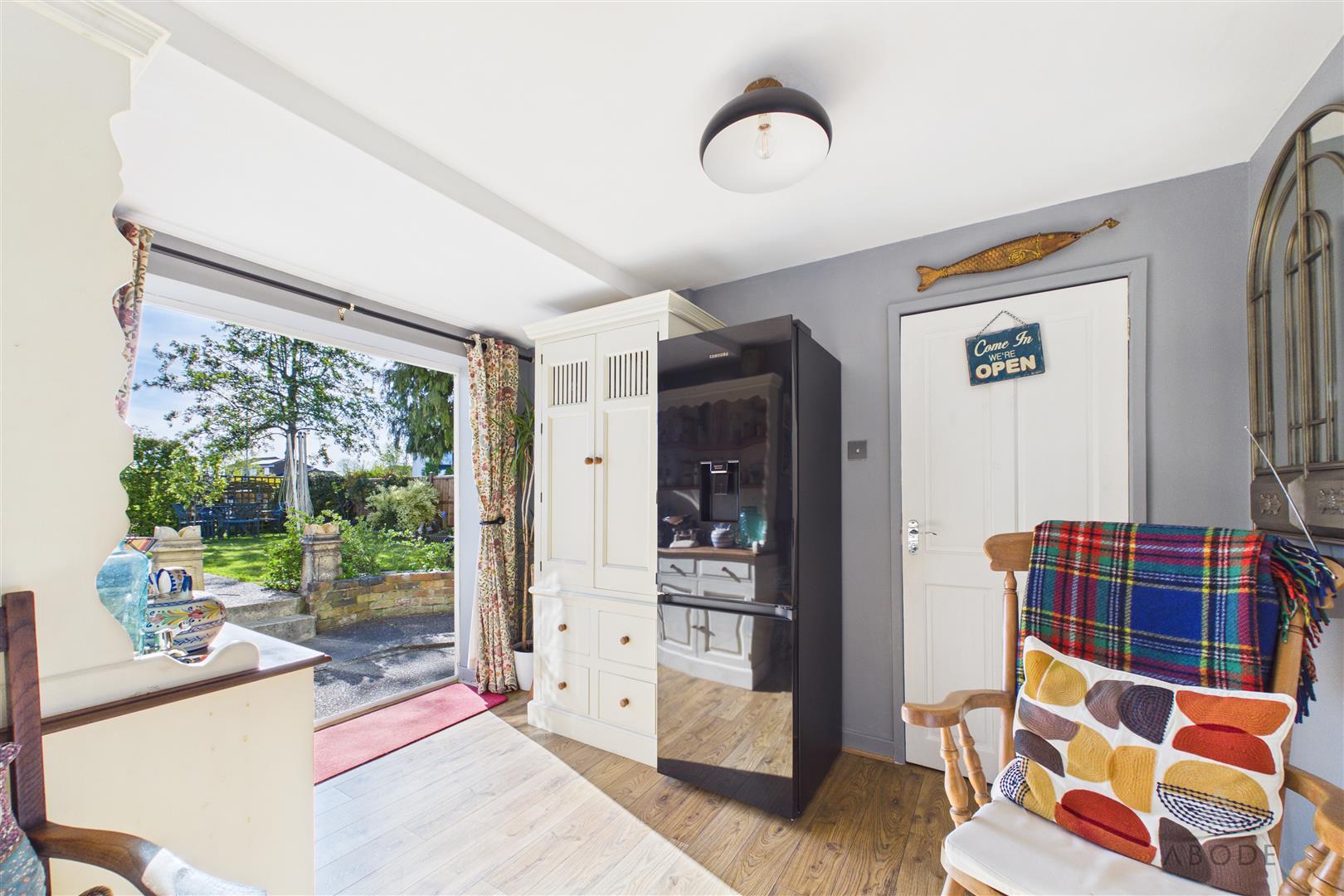 To the rear, the property opens into a well-appointed kitchen, fitted with a range of wall and base units, preparation work surfaces, and space for appliances, with direct access out to the rear garden via double doors. Adjacent to the kitchen is a separate dining room, offering space for a dining table and chairs, ideal for both everyday living and entertaining. A useful ground floor WC completes the ground floor accommodation.