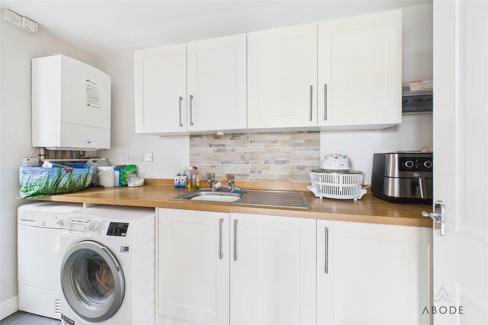 The kitchen diner is fitted with a range of matching wall and base units with complementary work surfaces and tiled flooring. There is space for a dining table, making this a practical everyday family space, with double doors providing direct access to the rear garden and countryside views beyond. A useful utility room sits off the kitchen, offering further storage, worktop space and plumbing for appliances, along with external access.