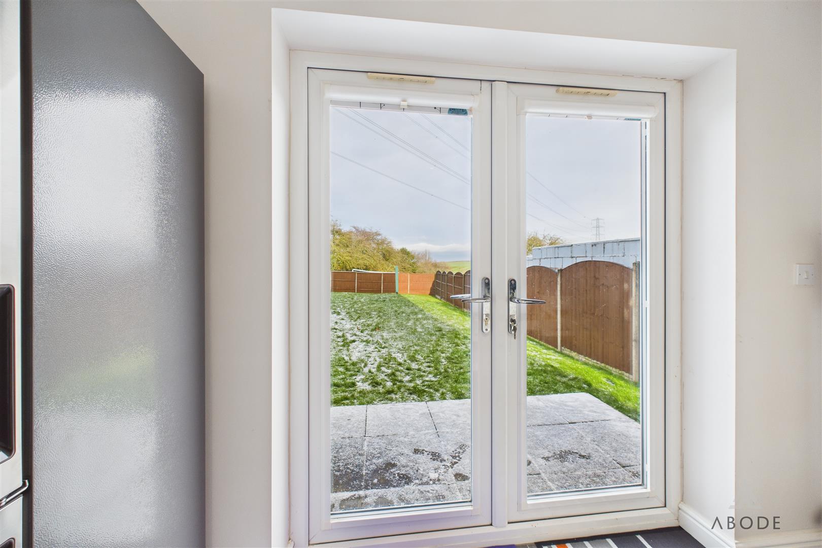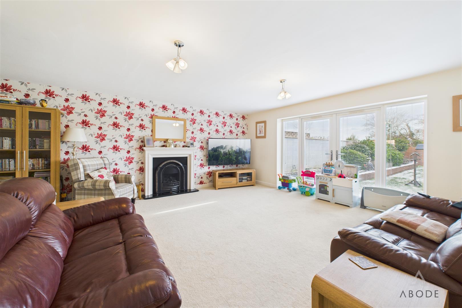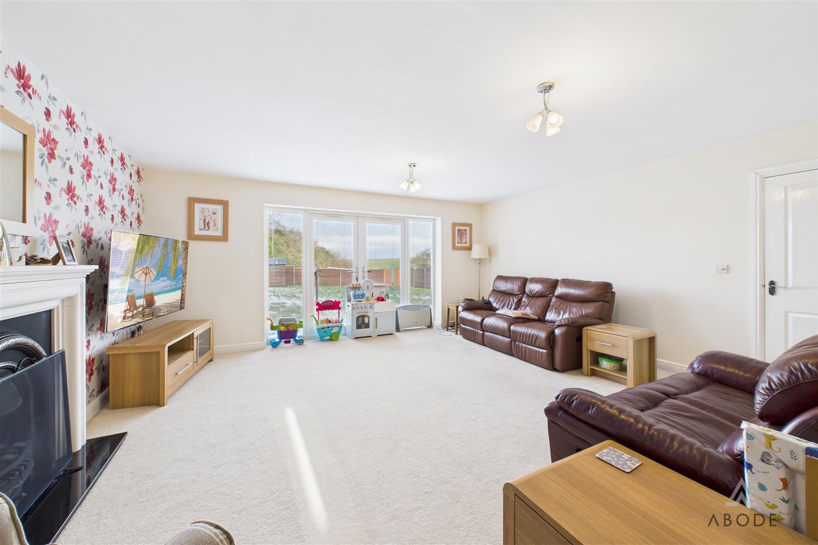 The living room is a particularly generous space, positioned to the rear of the property and featuring French doors opening directly onto the garden, allowing plenty of natural light and offering pleasant views across the lawn and beyond to open countryside. A central fireplace provides a focal point, making this a comfortable yet impressive main living space.