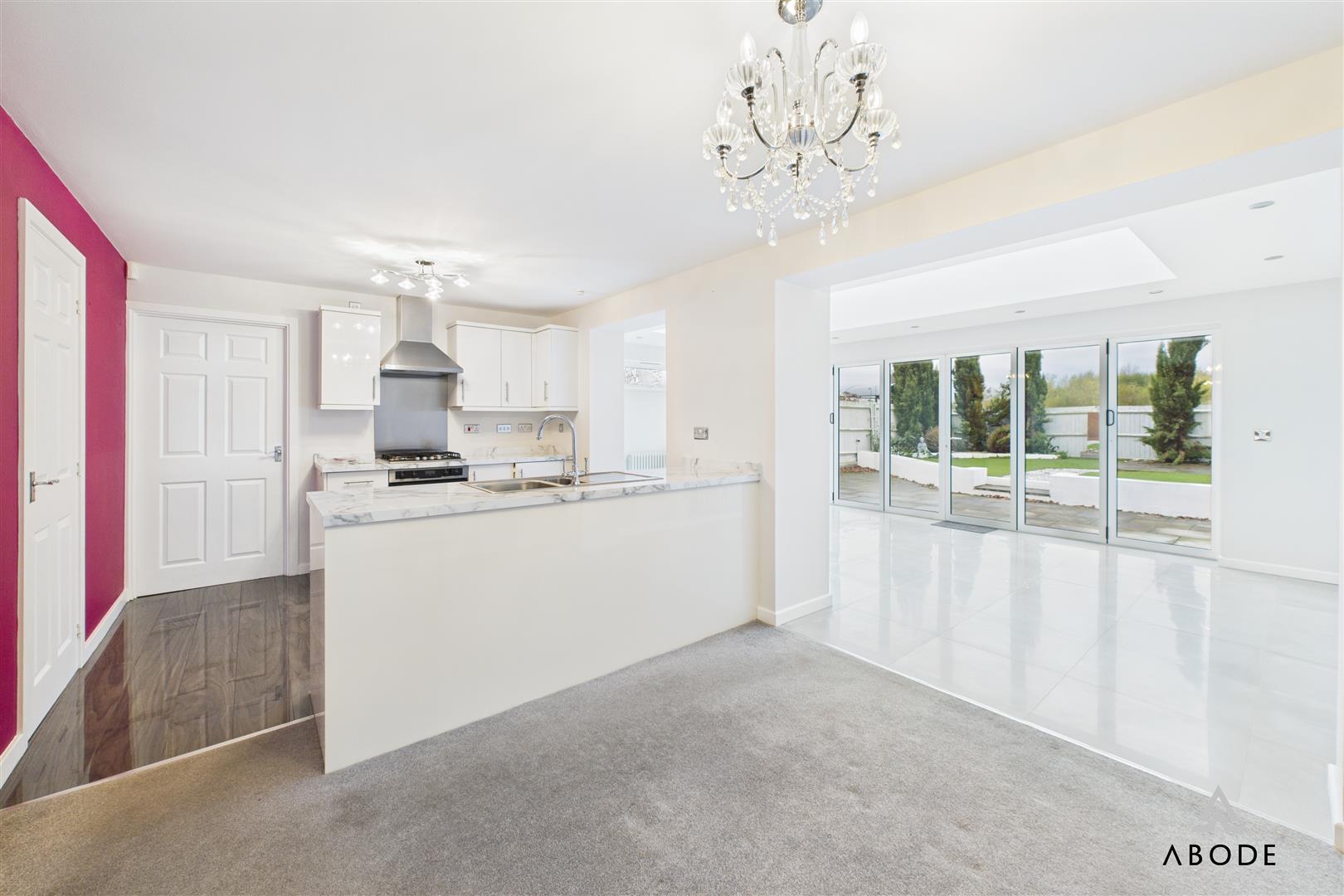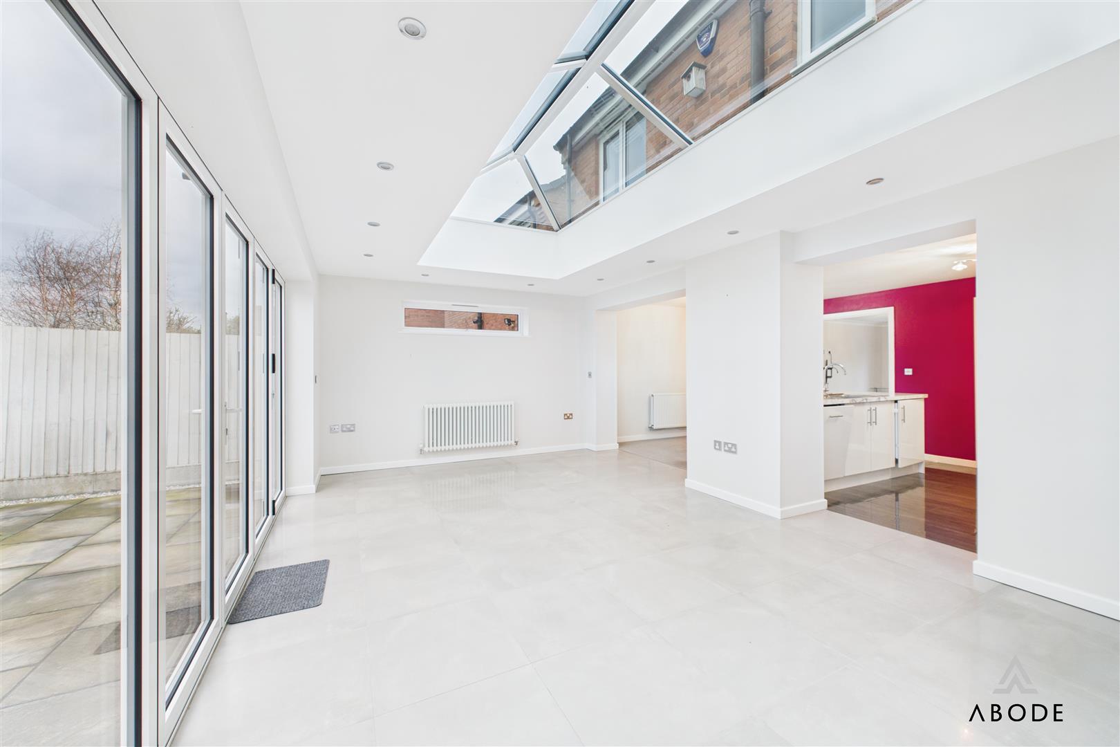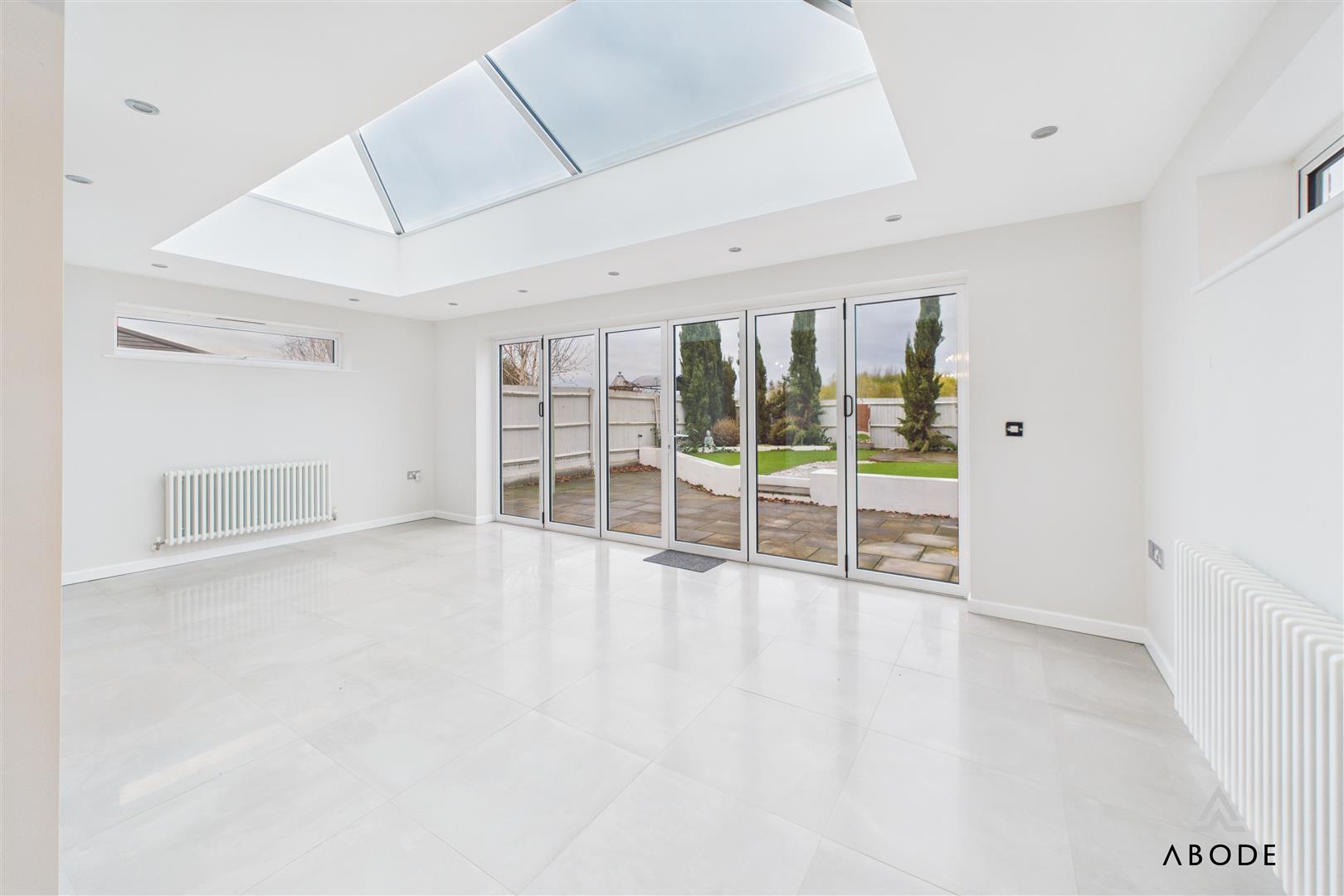 The dining area leads into the outstanding garden room—an extended, full-width addition featuring quality tiling, inset spotlights, extensive glazing, and impressive bi-folding doors with sun-protected glass. This room acts as the true heart of the home, perfect for year-round enjoyment.