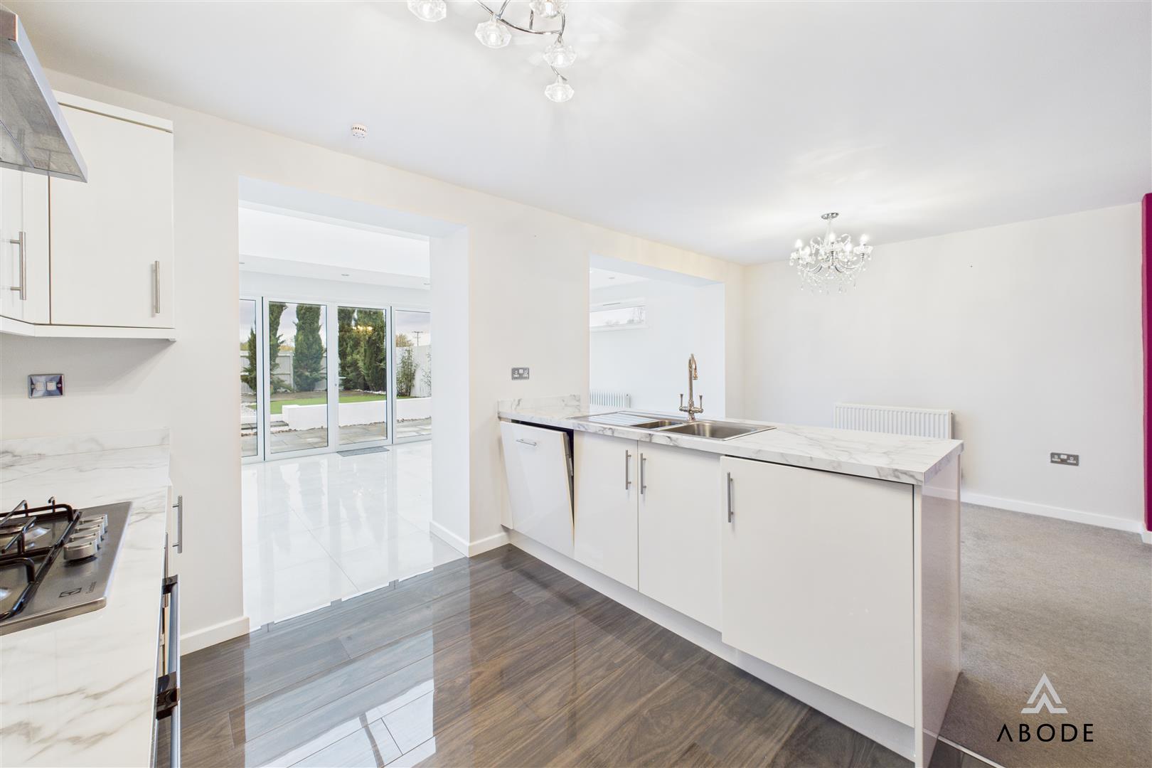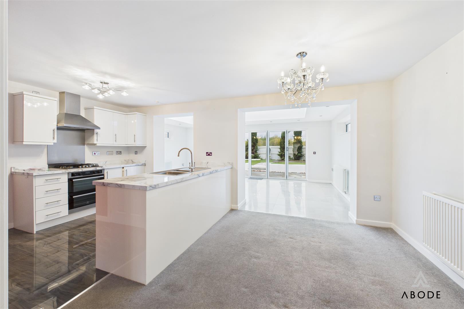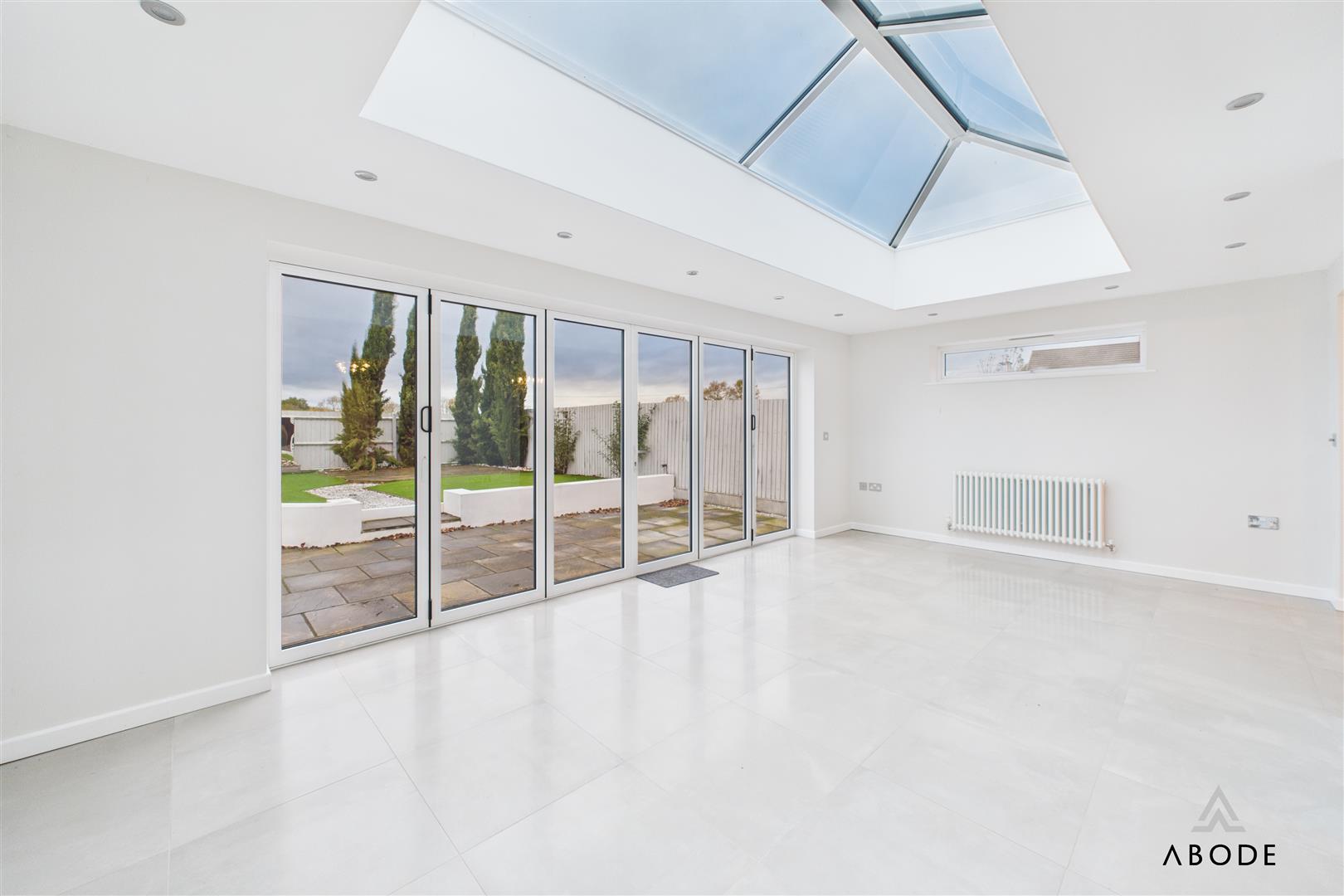 The dining area leads into the outstanding garden room—an extended, full-width addition featuring quality tiling, inset spotlights, extensive glazing, and impressive bi-folding doors with sun-protected glass. This room acts as the true heart of the home, perfect for year-round enjoyment.