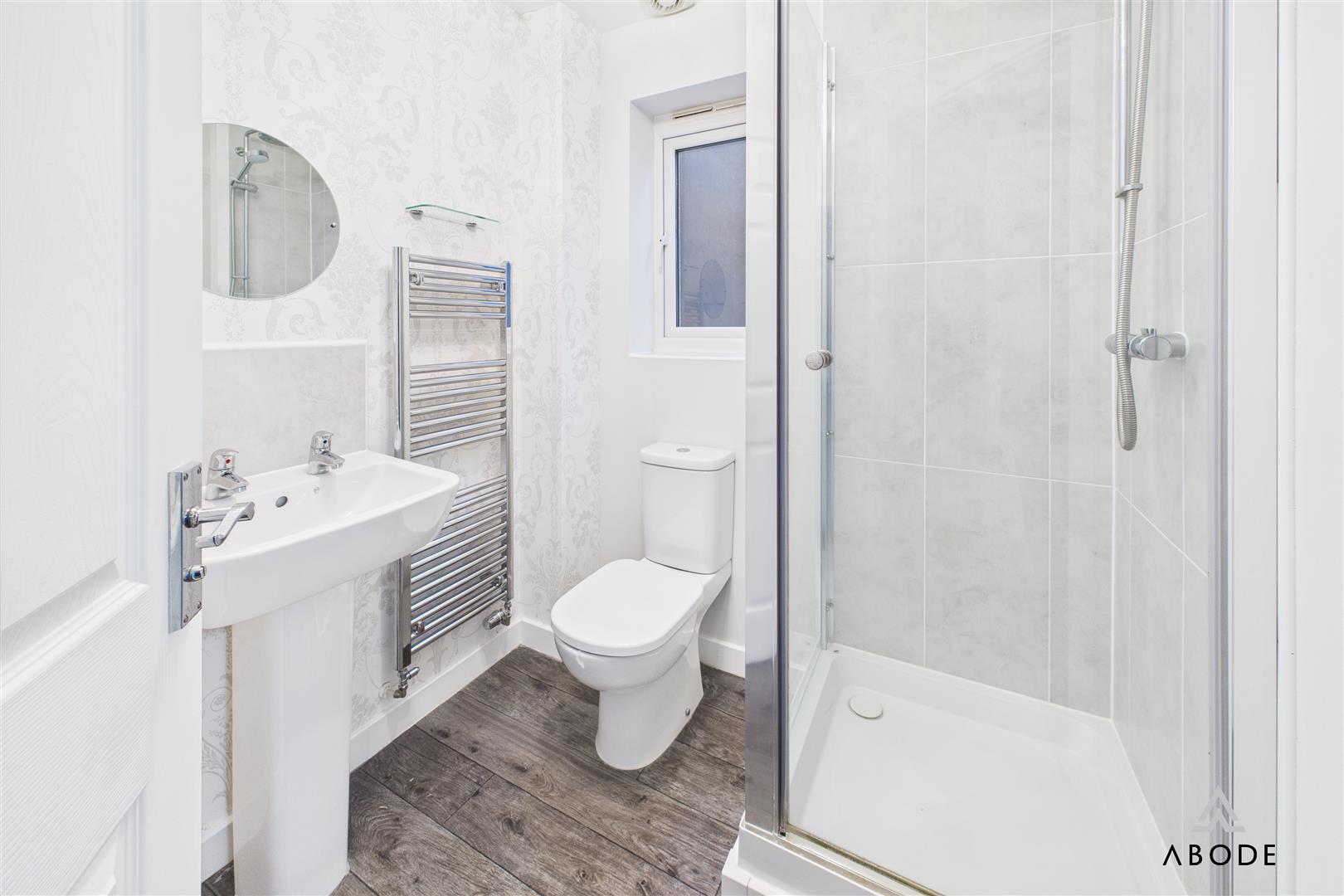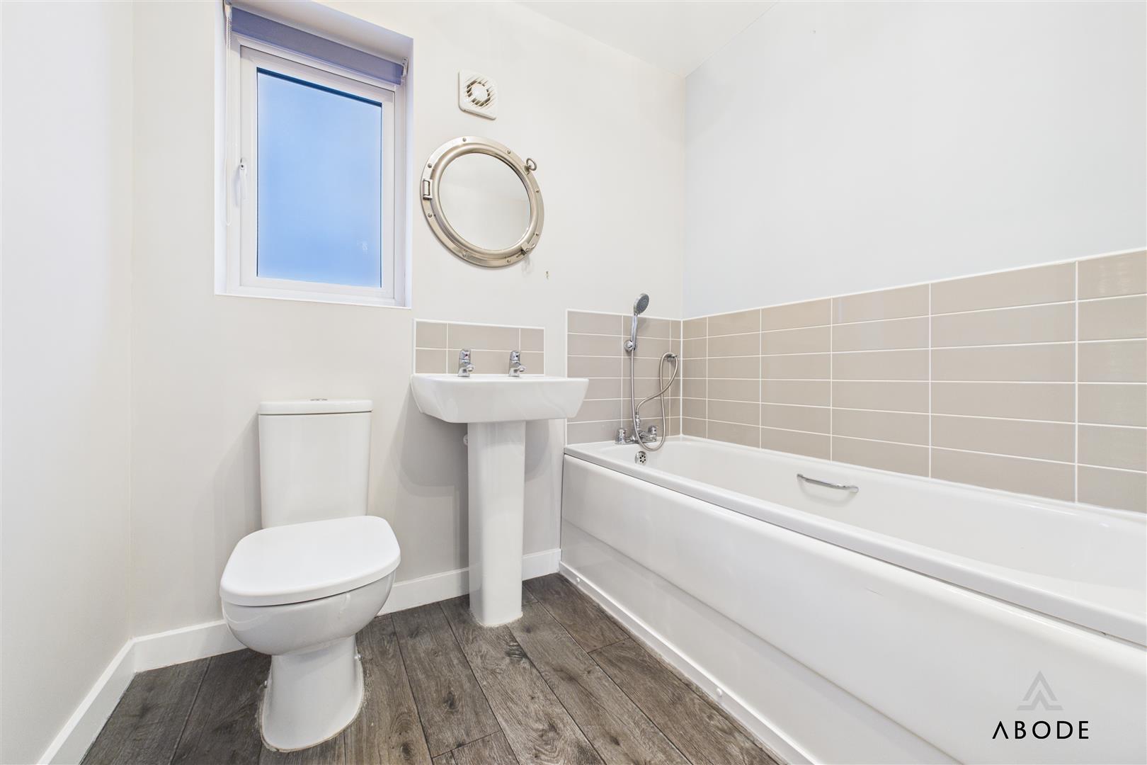 The main bathroom presents a modern three-piece suite with contemporary tiling and a window to the rear.