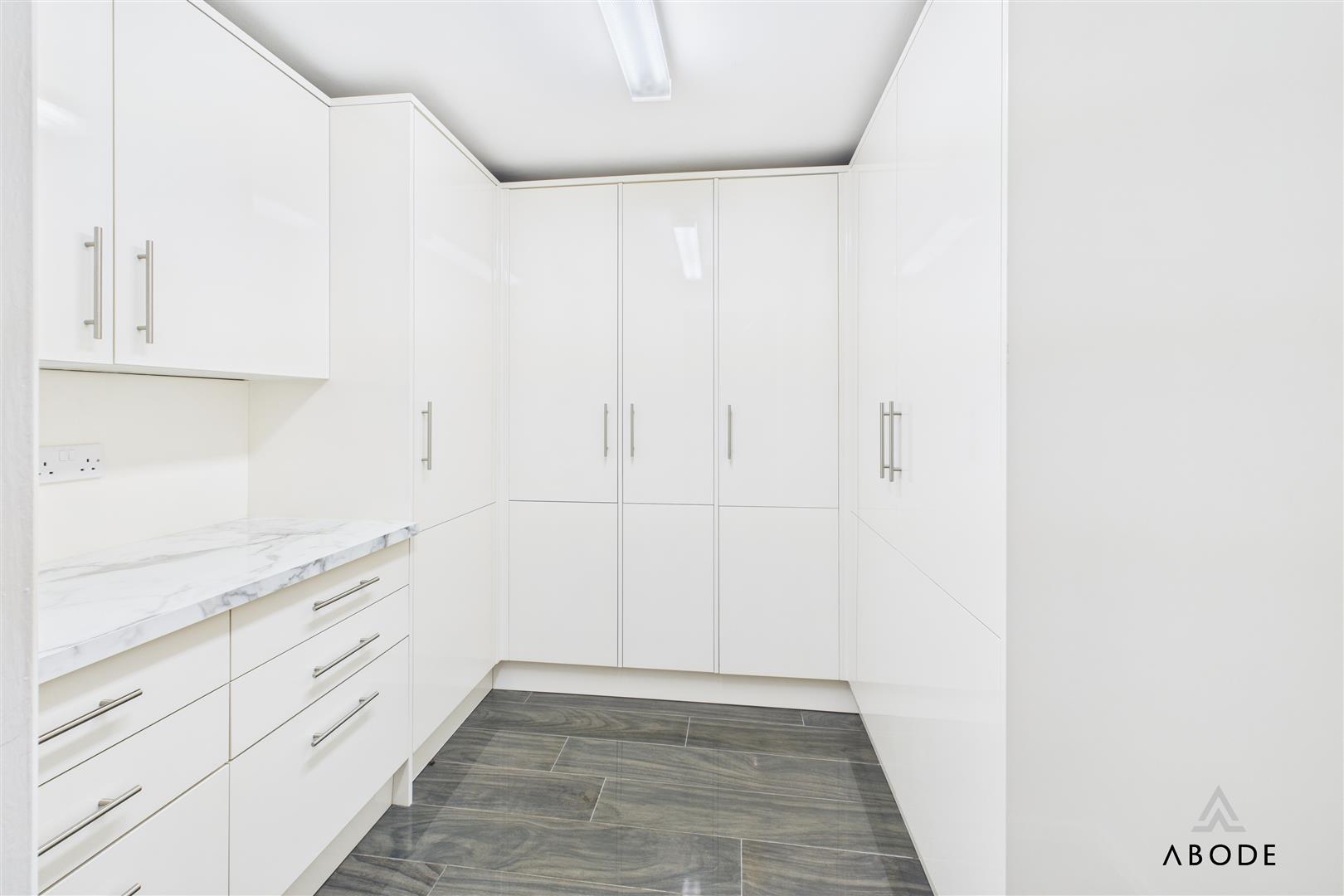 A utility room offers further workspace, a quartz-effect surface, appliance space, side access, and leads through to the boot room. Fitted with high-gloss cabinetry, further storage cupboards, space for an additional fridge freezer, and matching high-quality Italian flooring. A cloakroom/WC completes the ground floor.