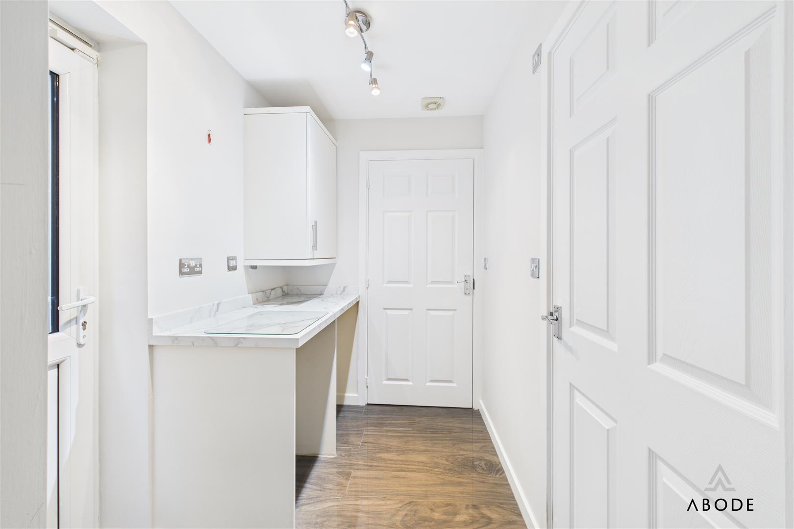 To the front, a tarmac driveway provides off-street parking along with an EV charging point. The former garage has been partially converted internally into the boot room, but still retains a useful front storage area with power and lighting. A side path leads to the rear garden.