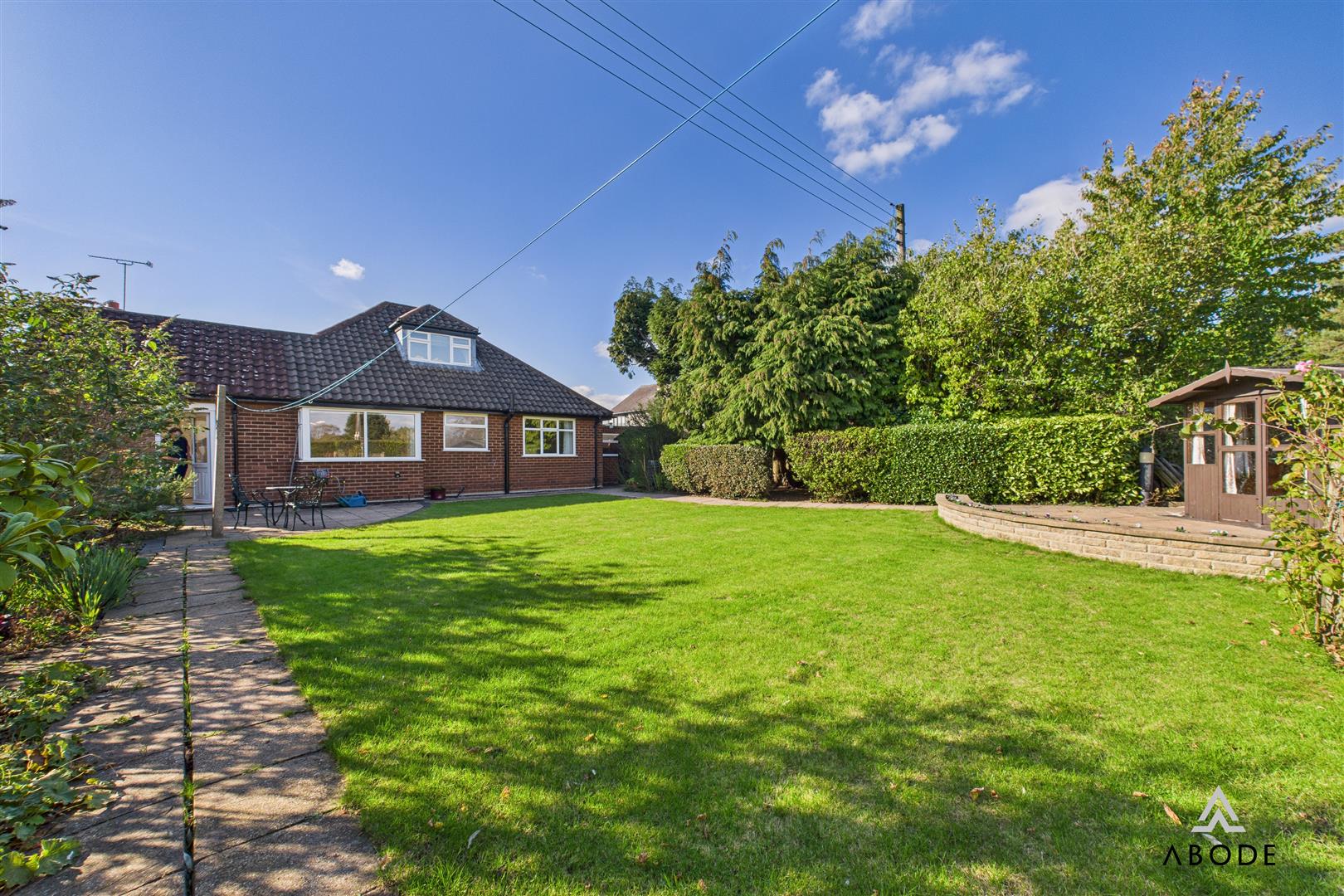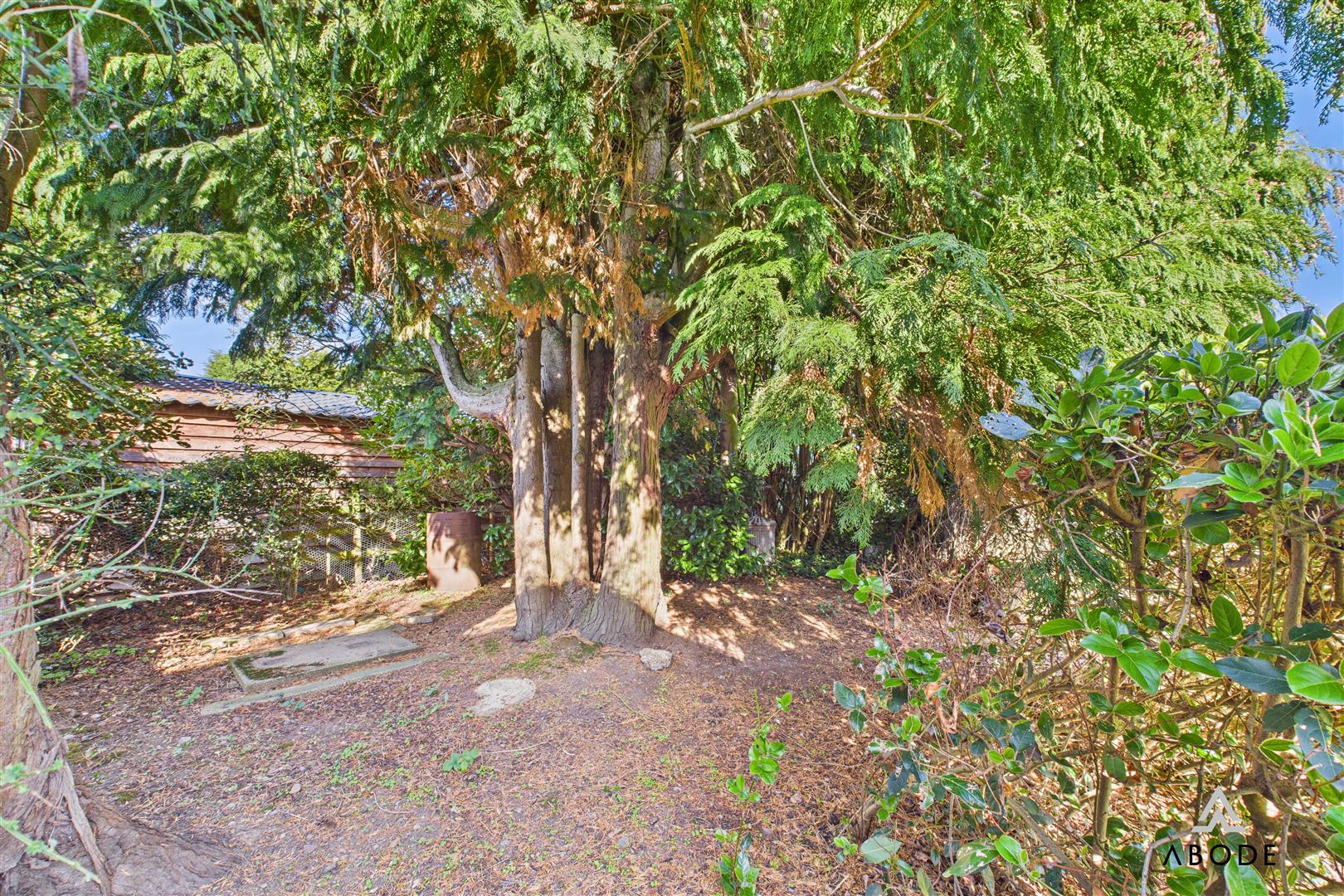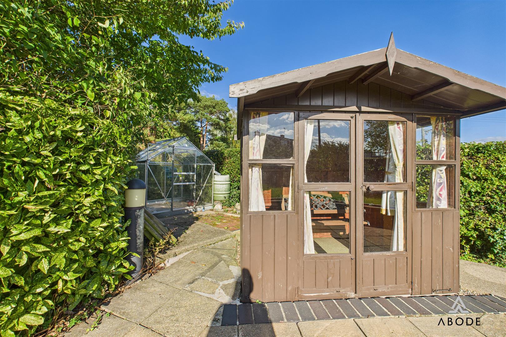The rear garden is enclosed offering a shaped lawn, paved seating areas, hedge and shrubs, greenhouse and timber summerhouse included in the sale. Mature Woodland area, timber garden shed and water butt. A rear personal door into the single garage.