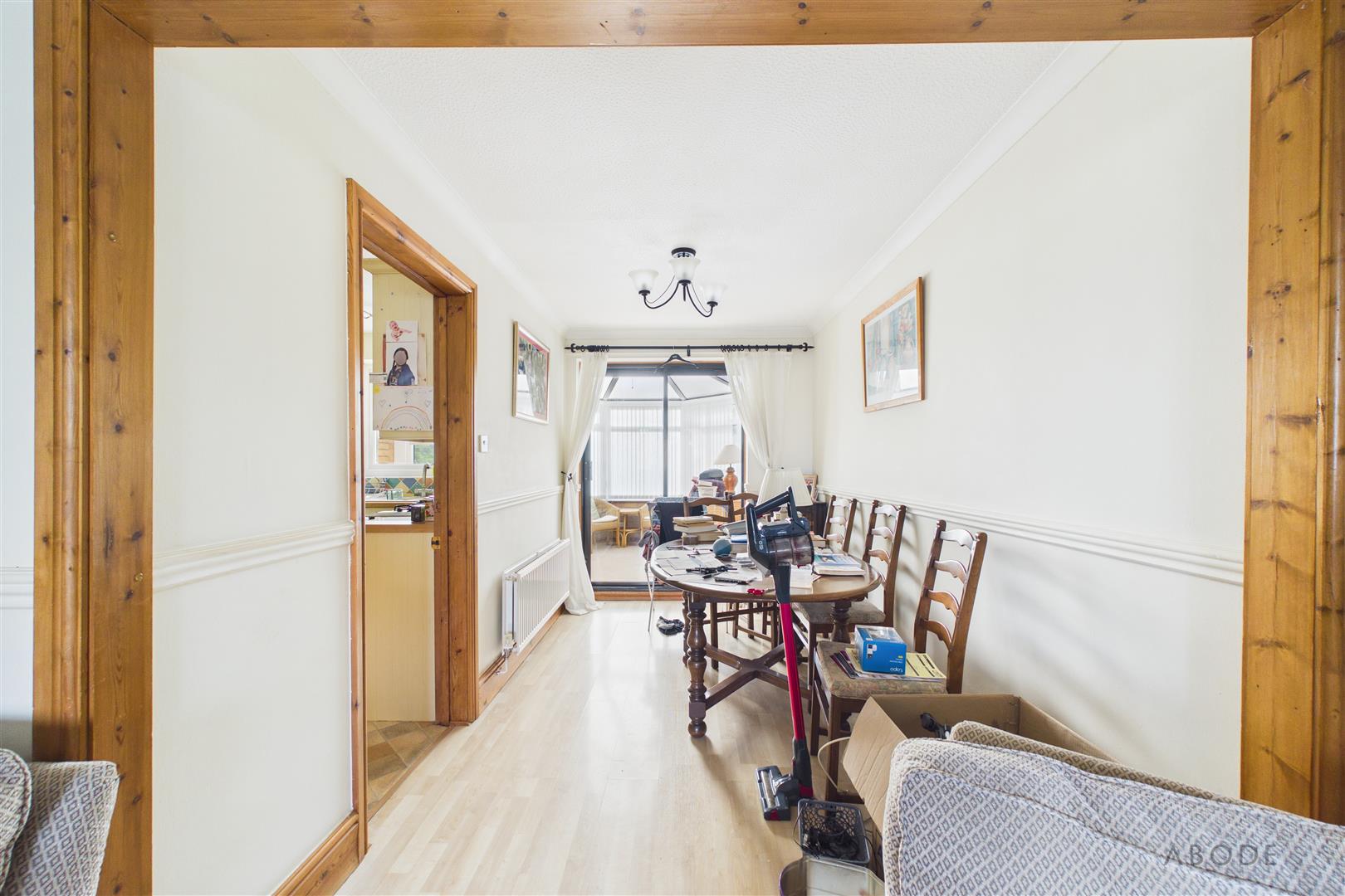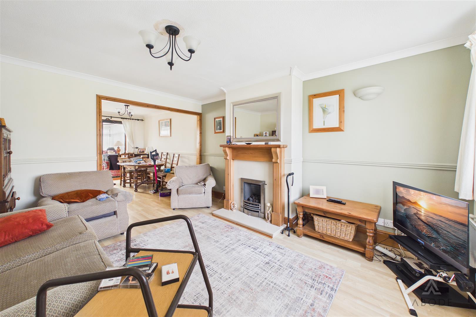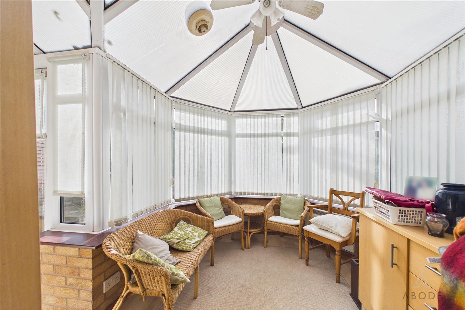 The accommodation begins with an entrance porch leading into a welcoming hallway, with stairs rising to the first floor and access to the main living spaces. The living room is positioned to the front and features a fireplace, creating a central focal point, with an opening leading through to the dining room. The dining room offers space for a family dining table and provides access through to the conservatory, which overlooks the rear garden and offers an additional reception area. From the conservatory a door leads to the utility and downstairs WC/cloaks. A further door from the utility leads into the garage.