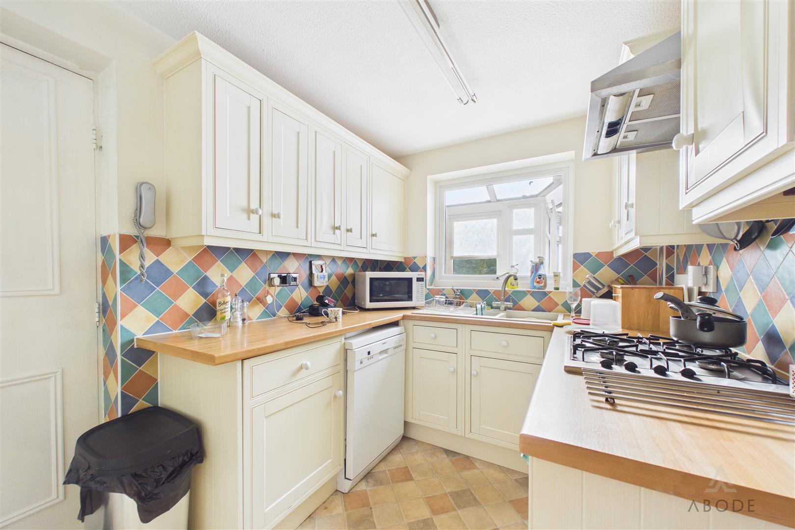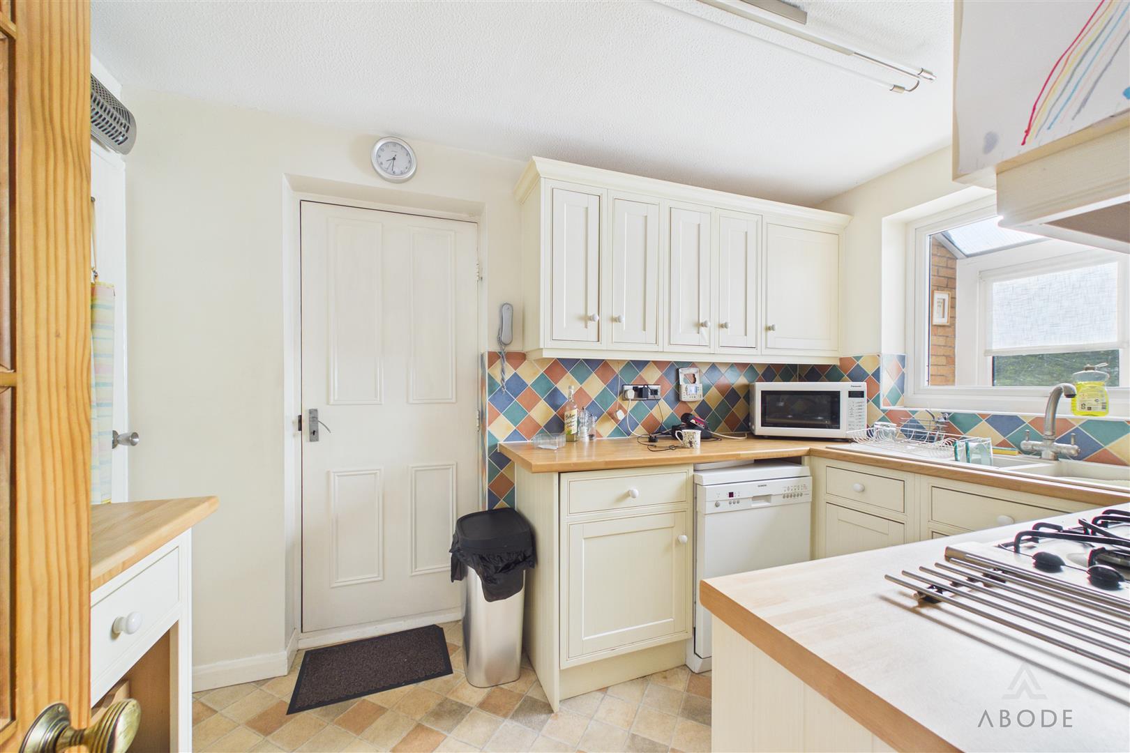 The kitchen is fitted with a range of matching wall and base units with preparation work surfaces, incorporating a sink, hob, and oven, along with space for further appliances. A door from the kitchen leads through to the garage.