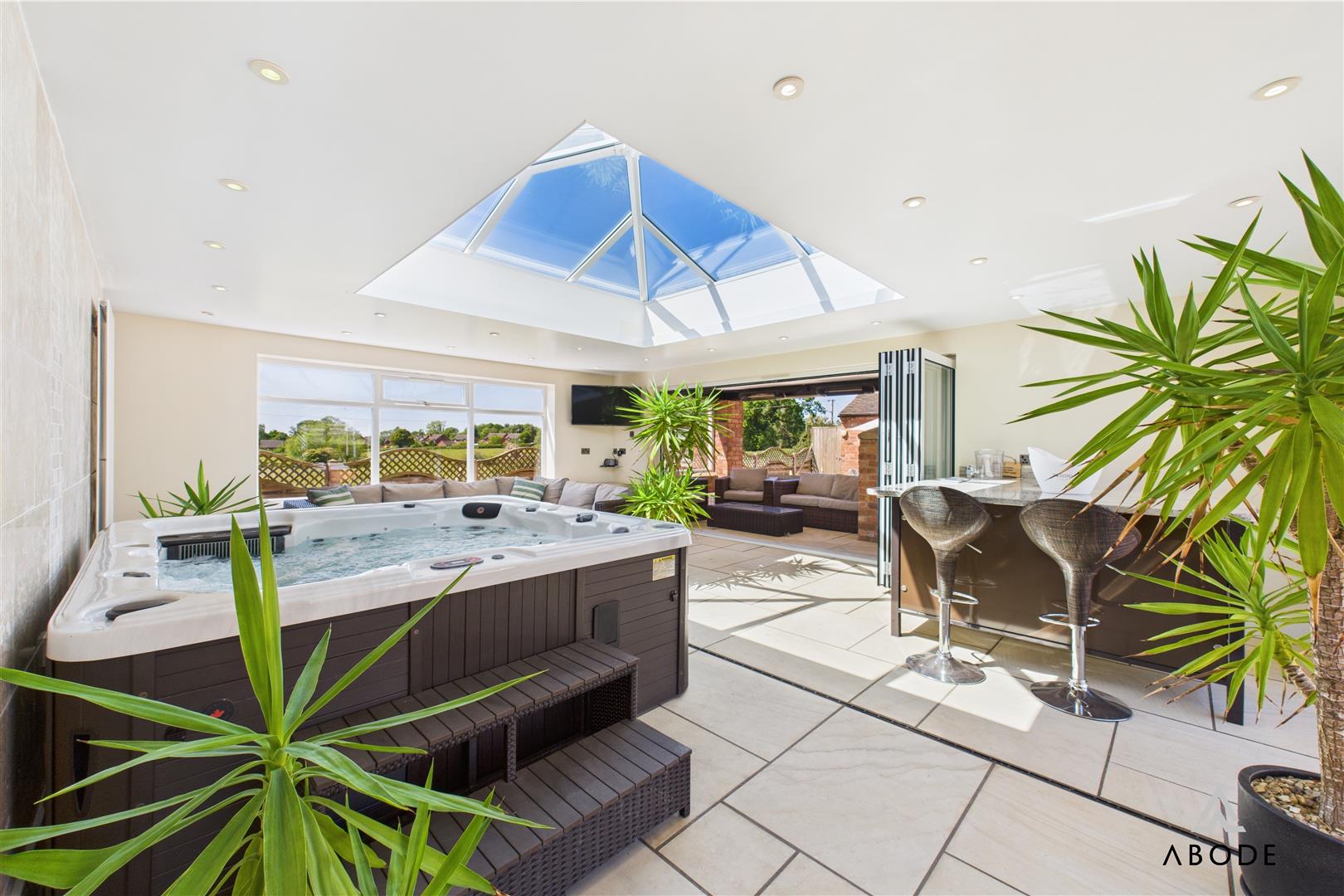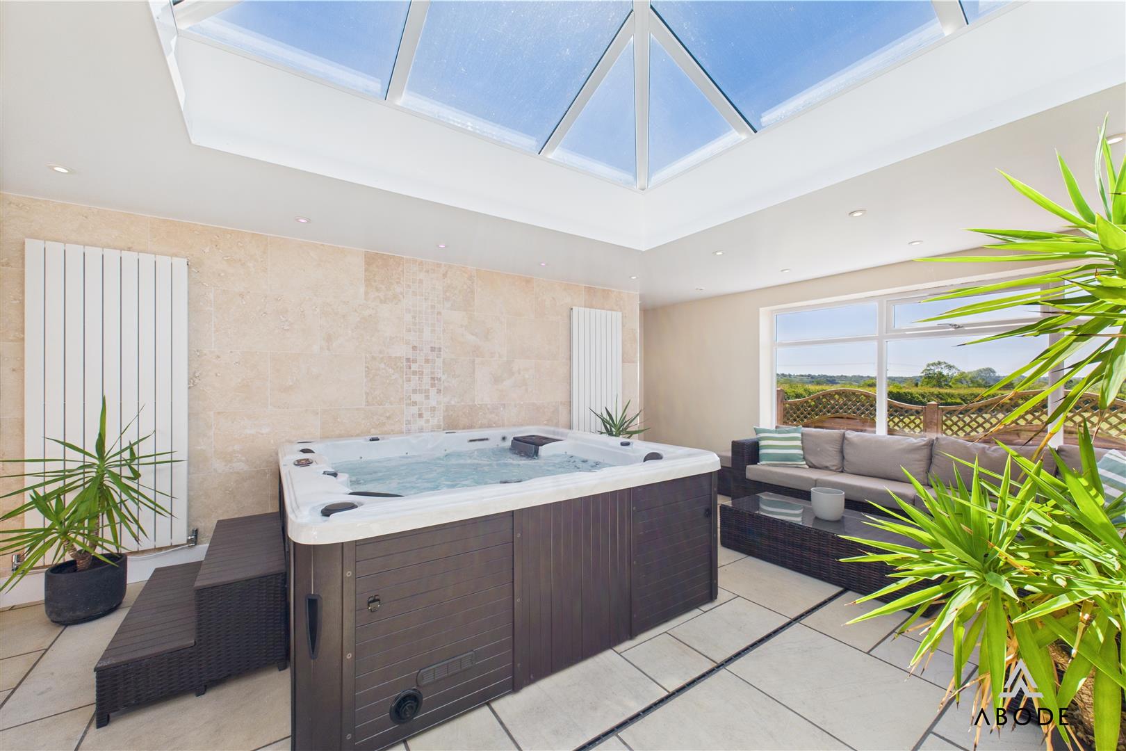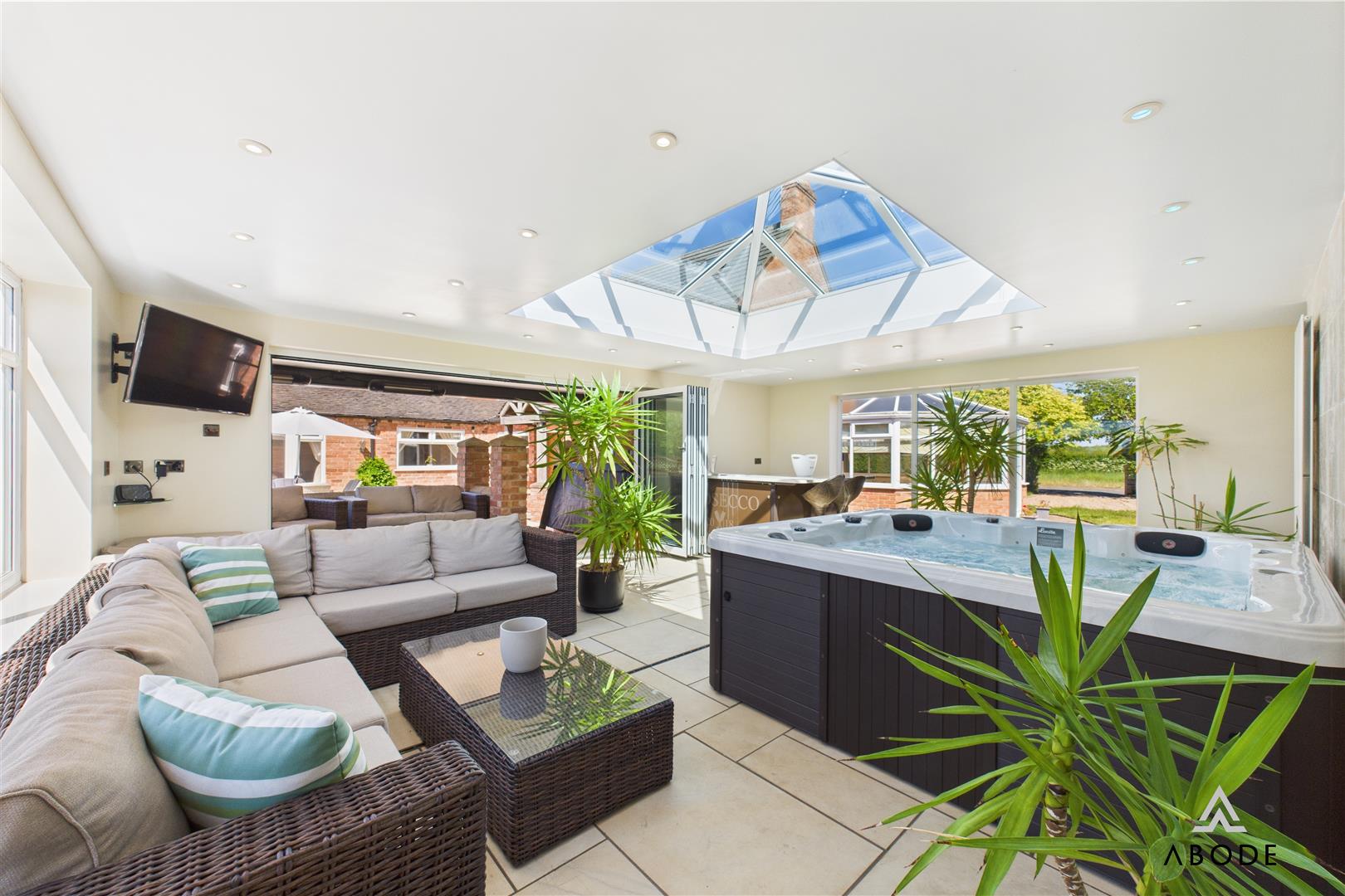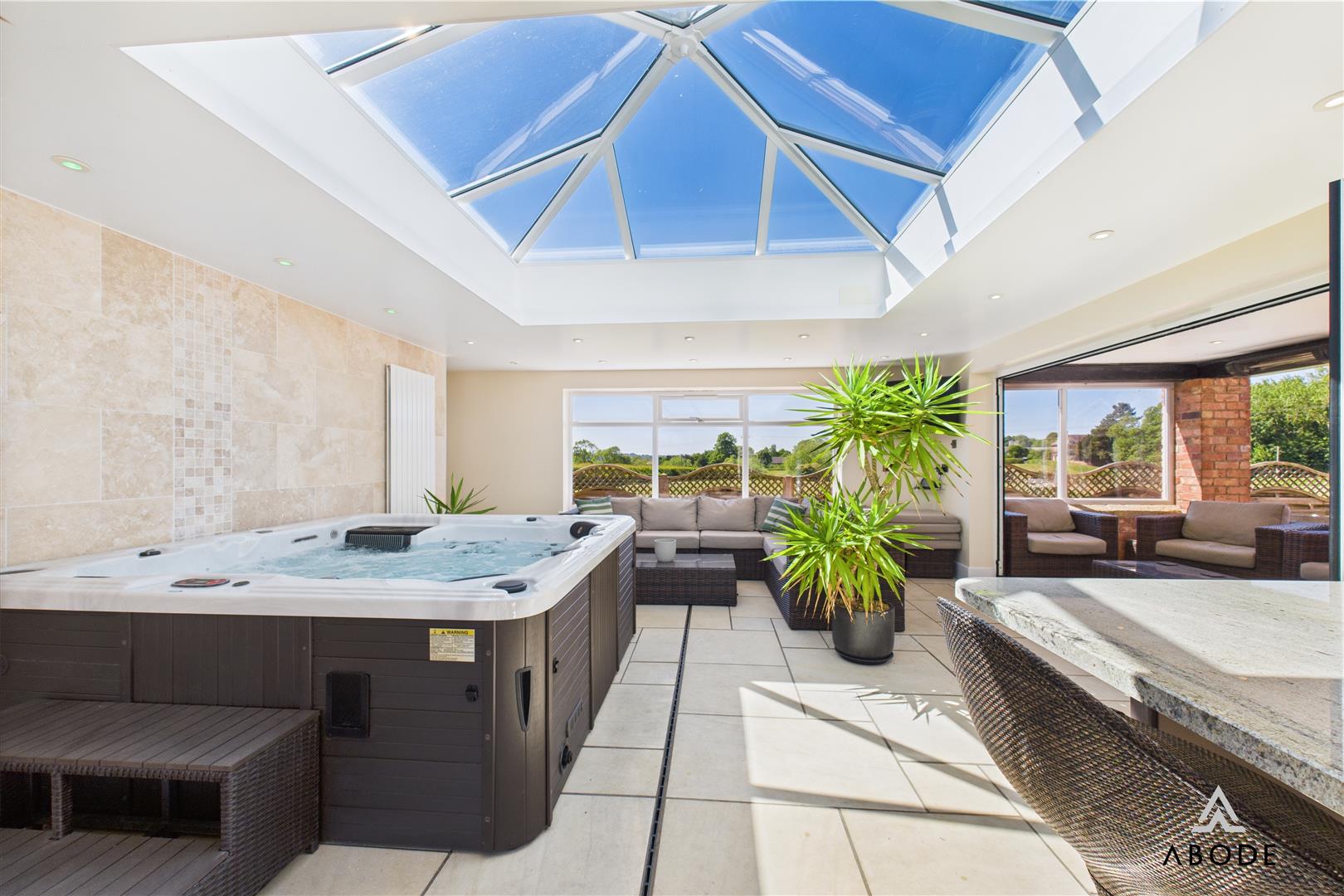 Additional highlights include a dedicated utility room, pantry, stylish family bathroom with roll-top bath, and a luxurious master suite with en-suite and Jacuzzi bath. The second floor offers two further bedrooms with countryside views and a WC, while an adjoining hobby and entertaining area—complete with a Jacuzzi/media space, wet room, and bi-fold doors to a covered outdoor entertaining zone—adds remarkable flexibility for lifestyle or leisure use.