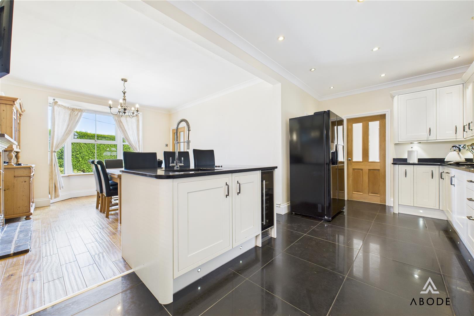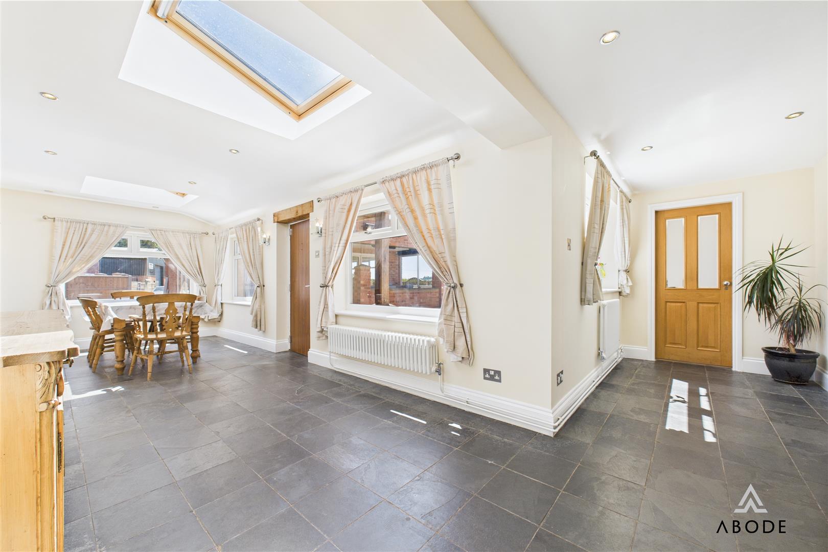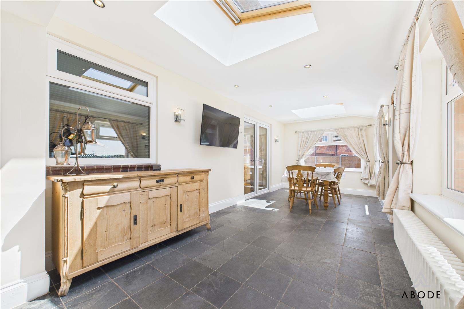 The home boasts elegant and spacious accommodation over three floors, including five bedrooms, three bathrooms, and an impressive open-plan kitchen and dining area with integrated appliances and granite worktops. Multiple living spaces—such as a welcoming lounge with a log-burning stove, a light-filled conservatory, and an extended garden room with skylights—offer versatile options for modern family life or entertaining.