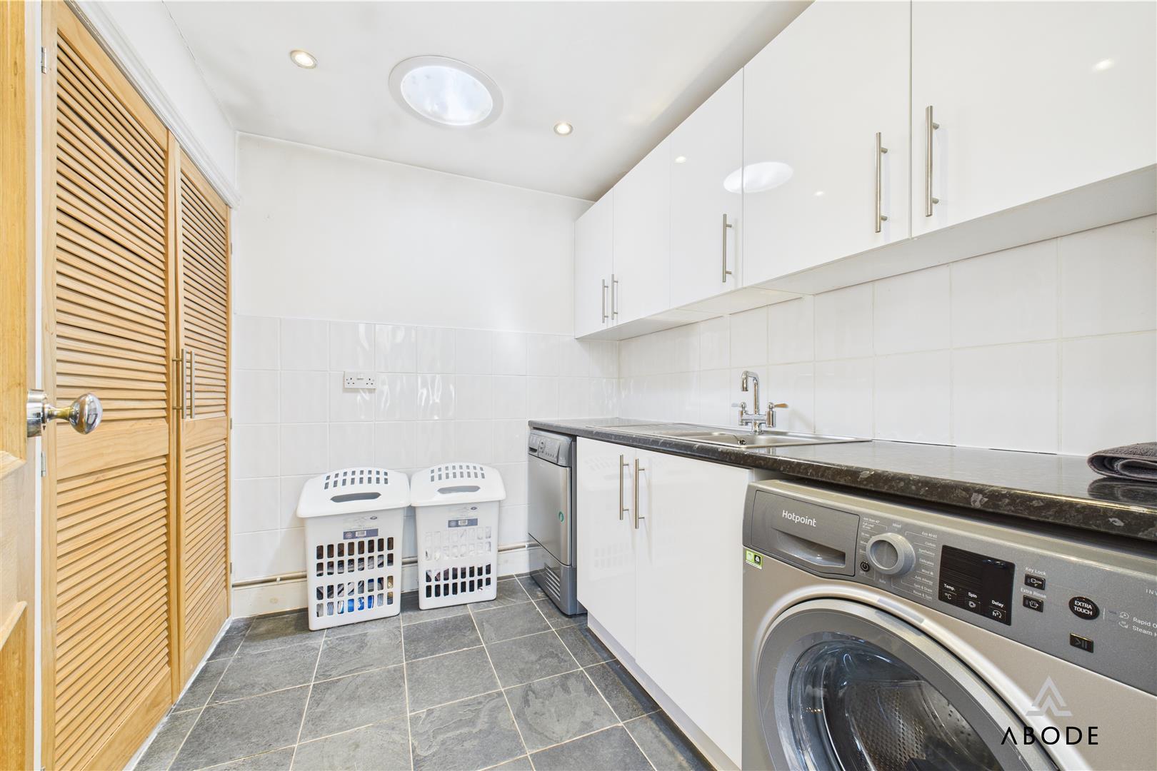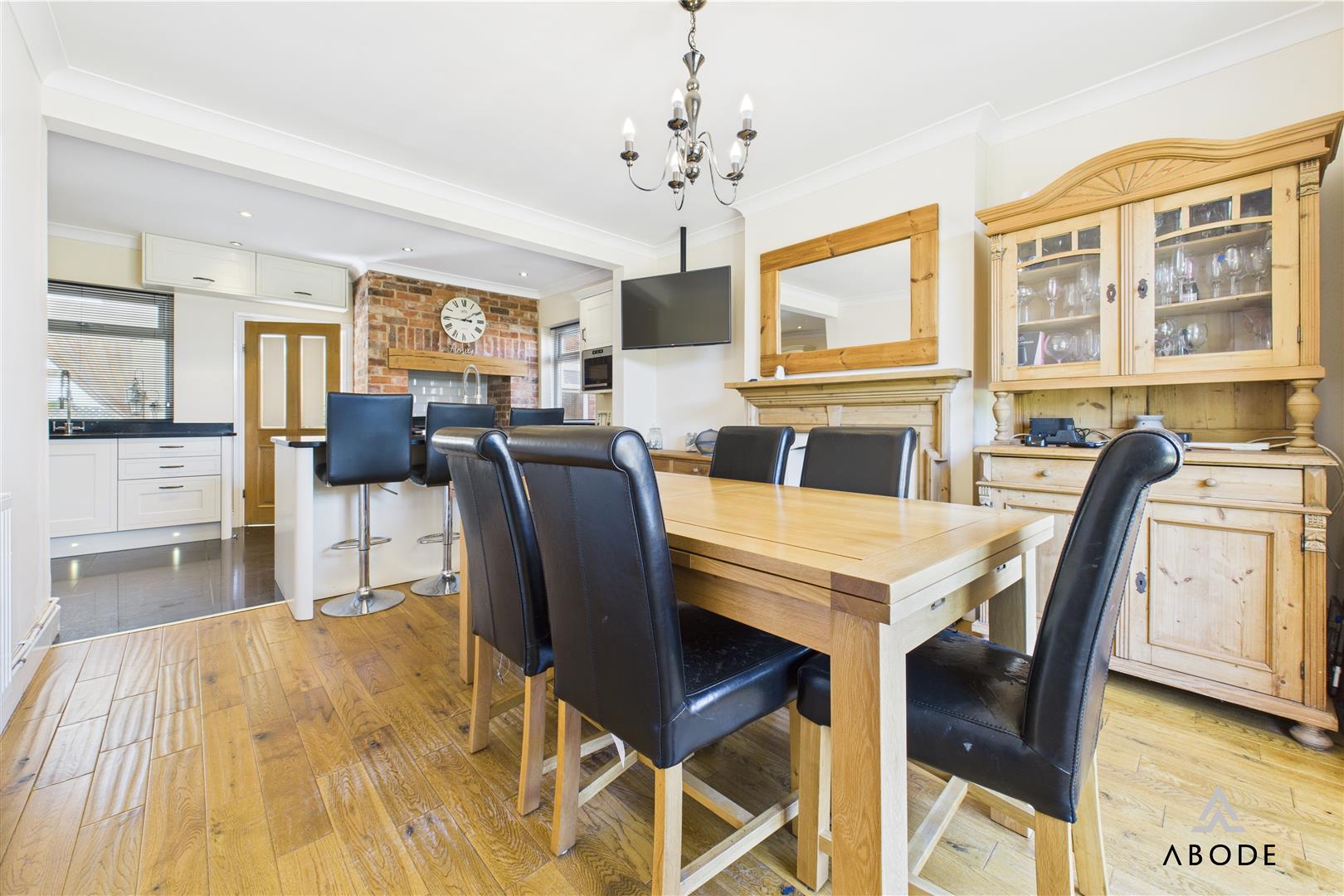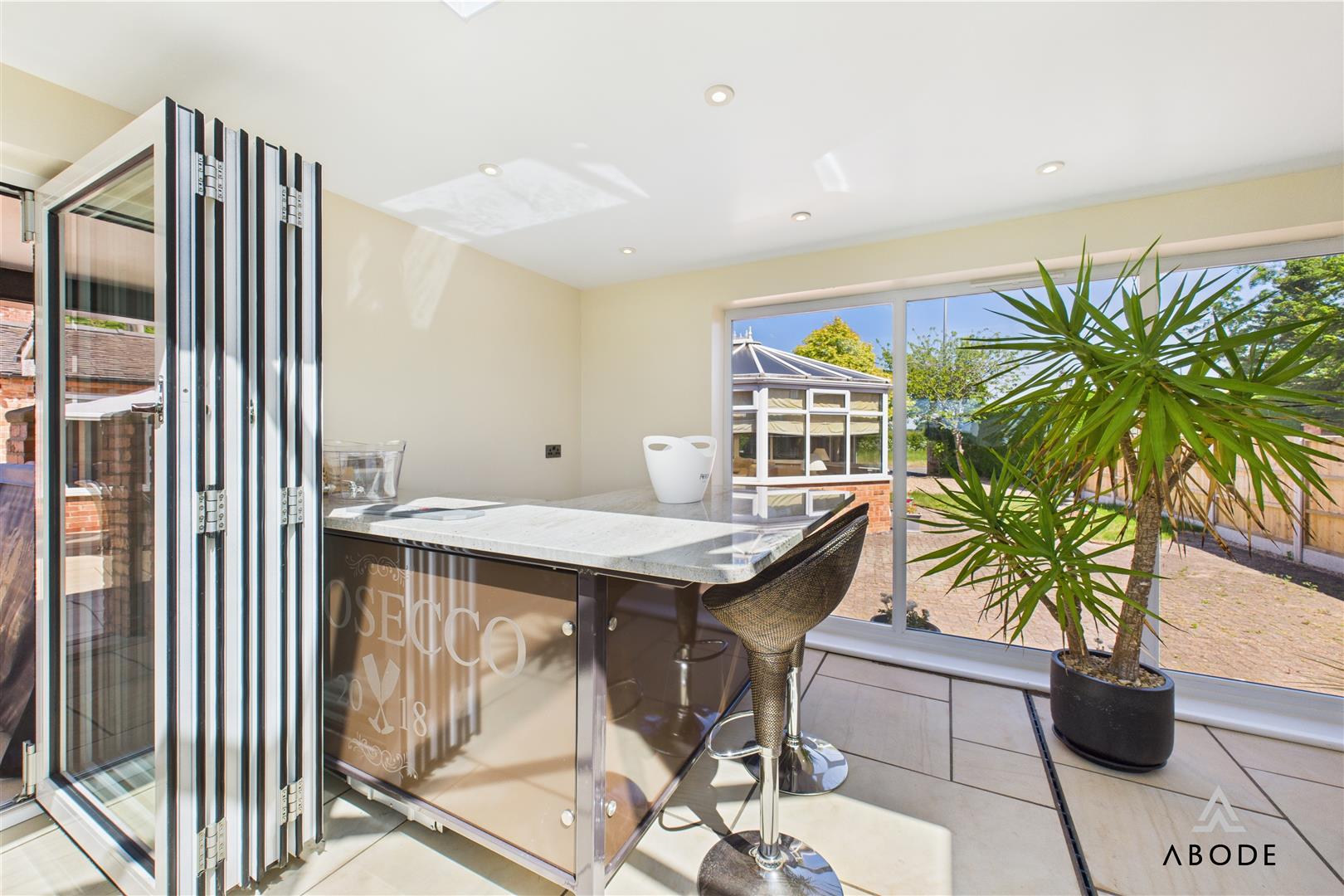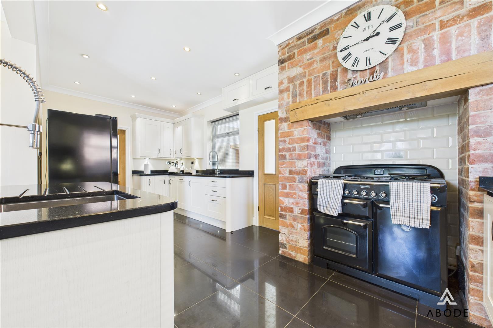 The home boasts elegant and spacious accommodation over three floors, including five bedrooms, three bathrooms, and an impressive open-plan kitchen and dining area with integrated appliances and granite worktops. Multiple living spaces—such as a welcoming lounge with a log-burning stove, a light-filled conservatory, and an extended garden room with skylights—offer versatile options for modern family life or entertaining.
