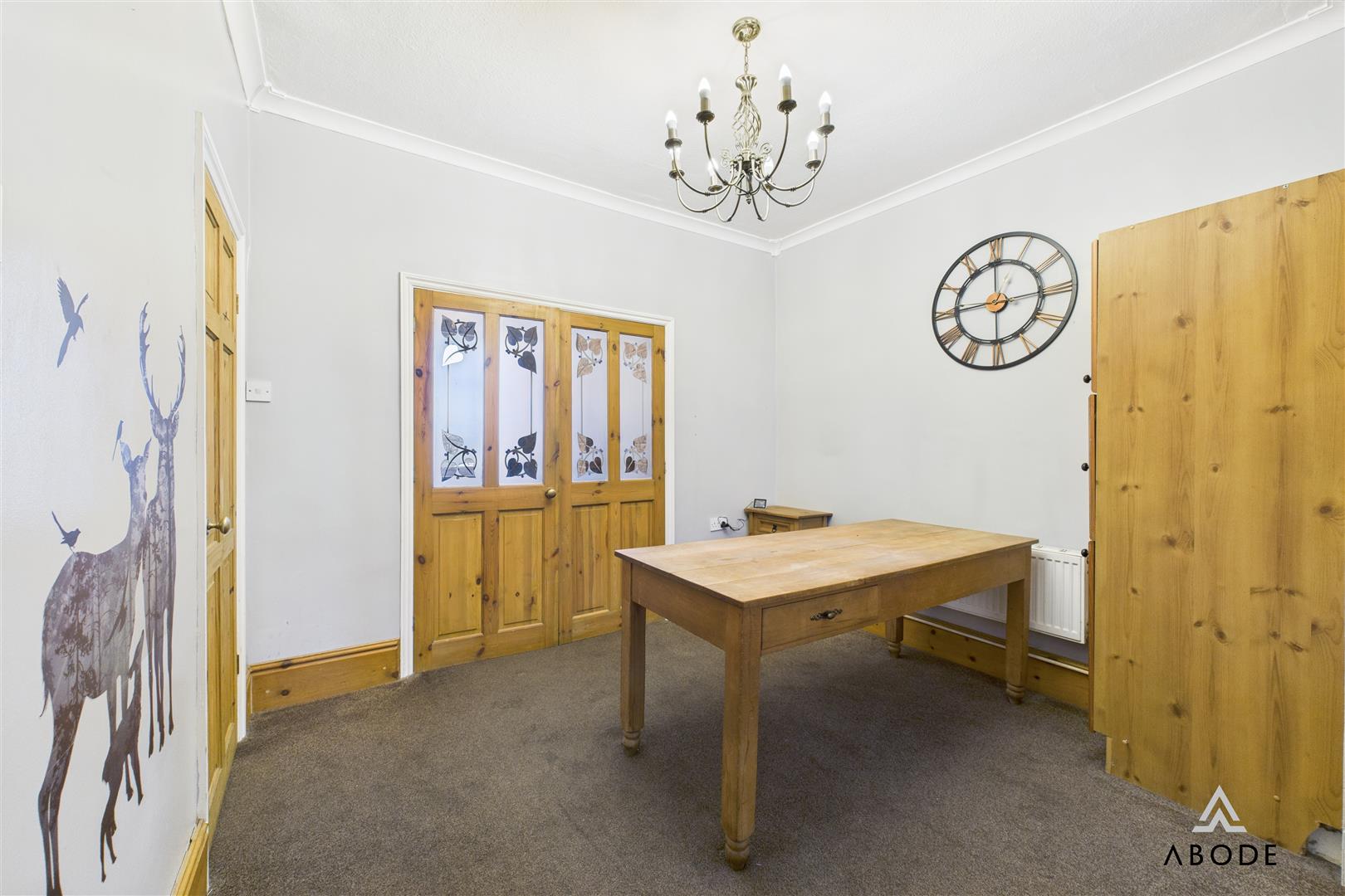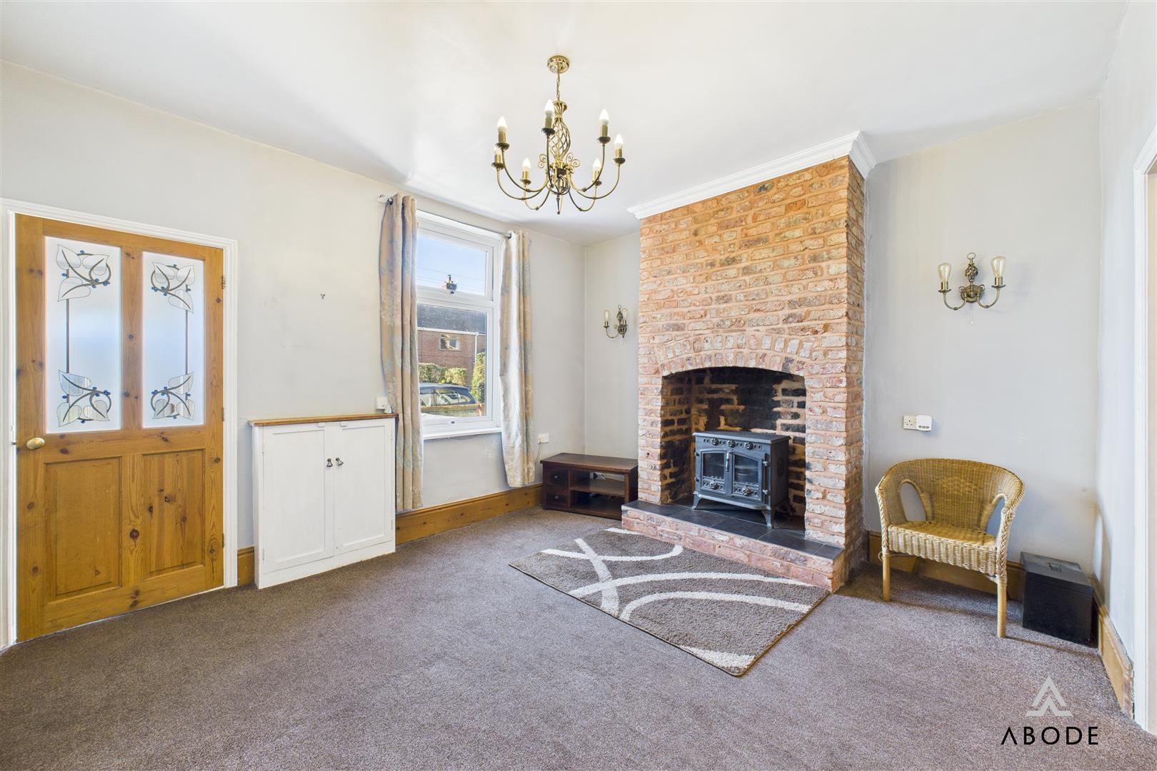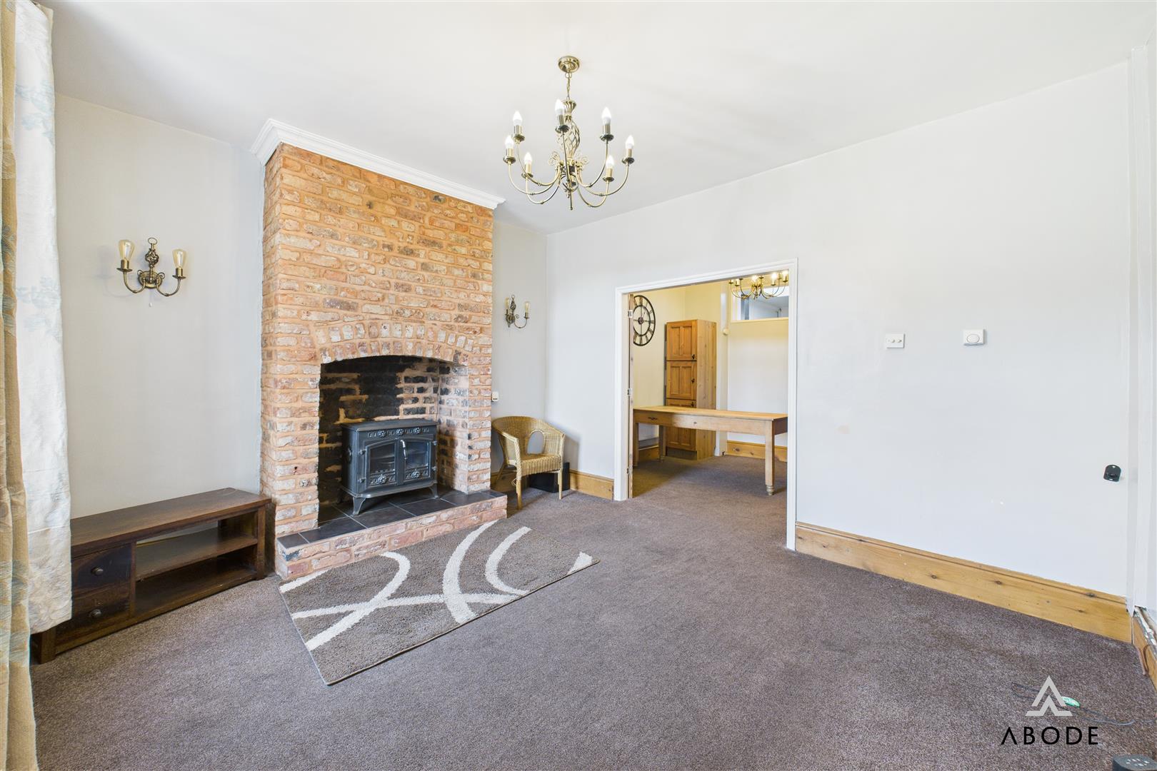 A warm and inviting space featuring a UPVC double-glazed window to the front elevation. The focal point log-burning fireplace adds charm (currently not flue connected). Additional features include a meter cupboard housing the electric meter and consumer unit, telephone point, thermostat, dimmer switch lighting and internal double timber doors opening into the dining room.