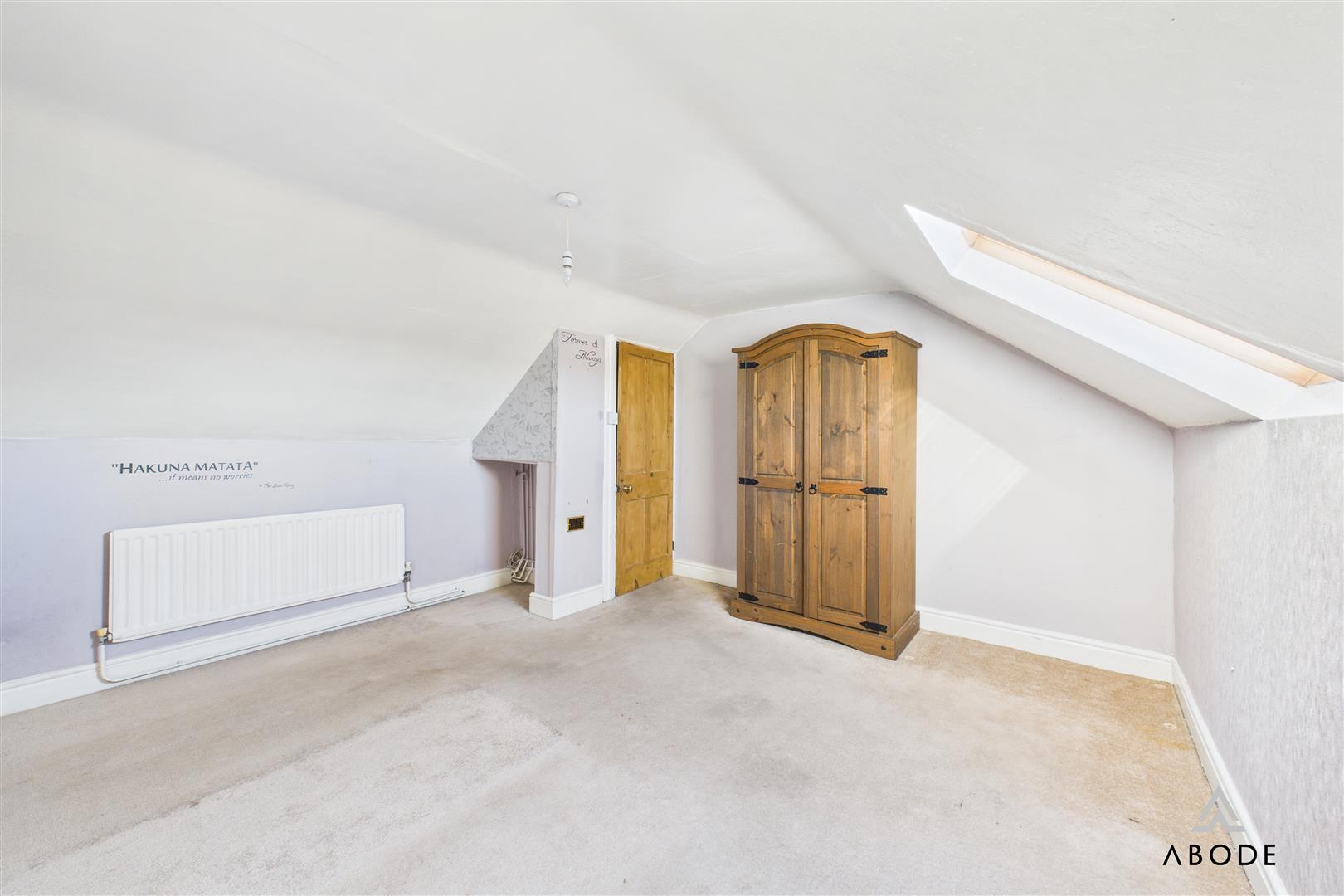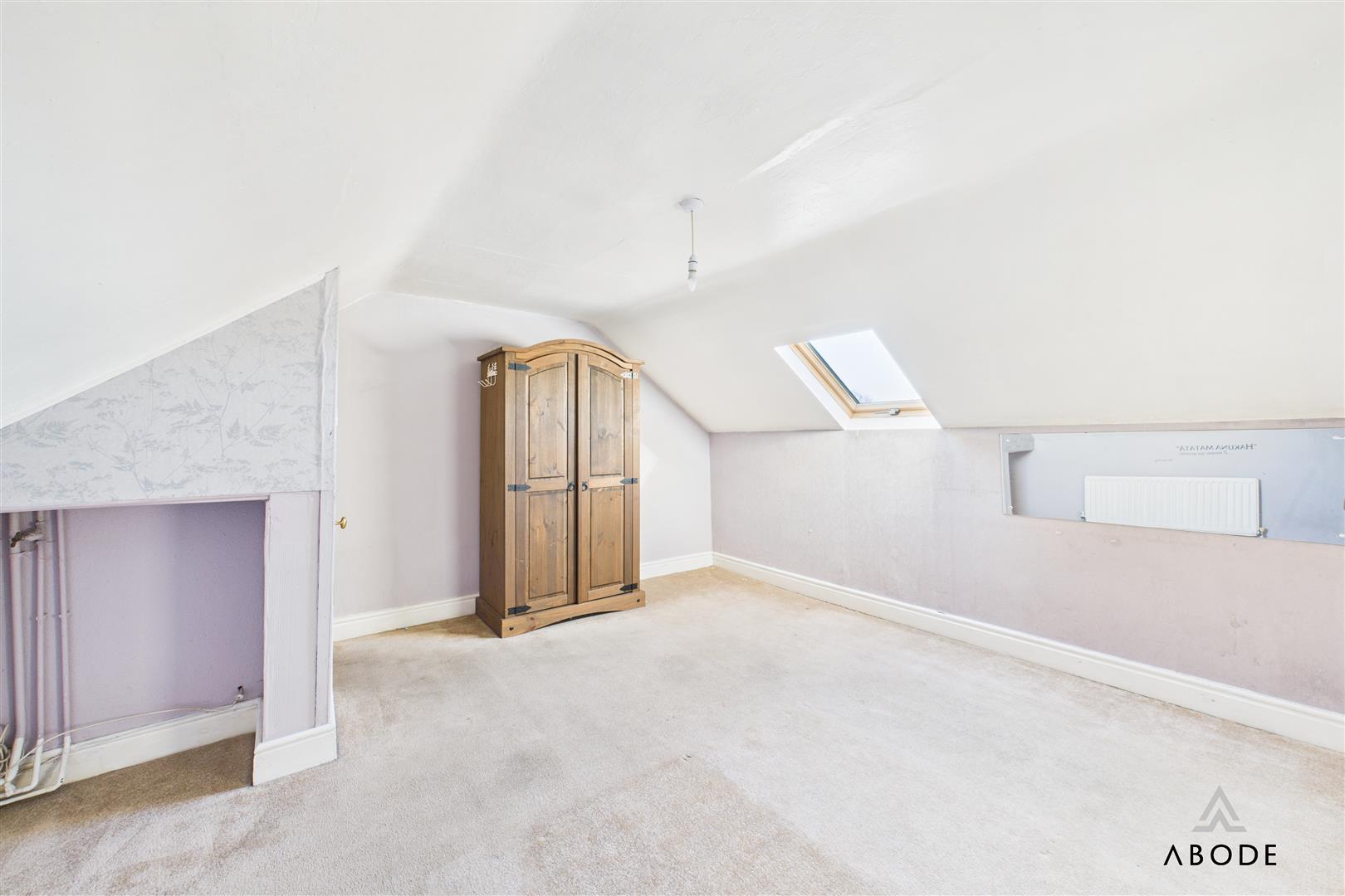 A charming top-floor bedroom offering velux window to the front elevation and a central heating radiator.