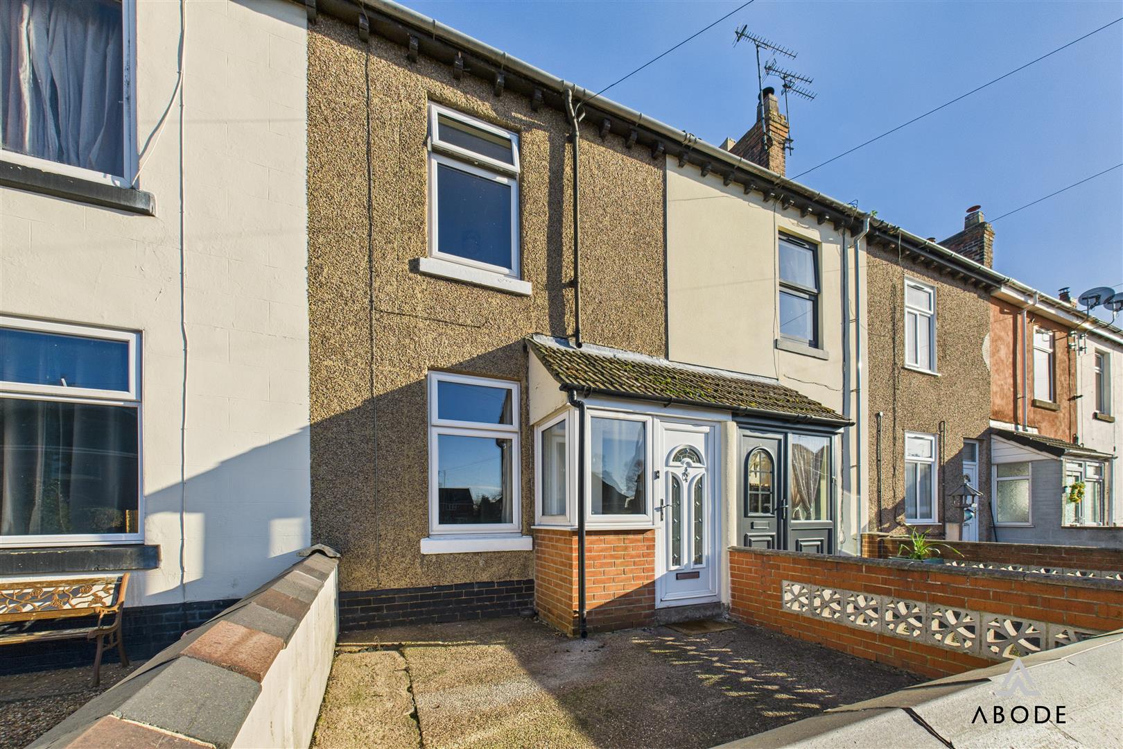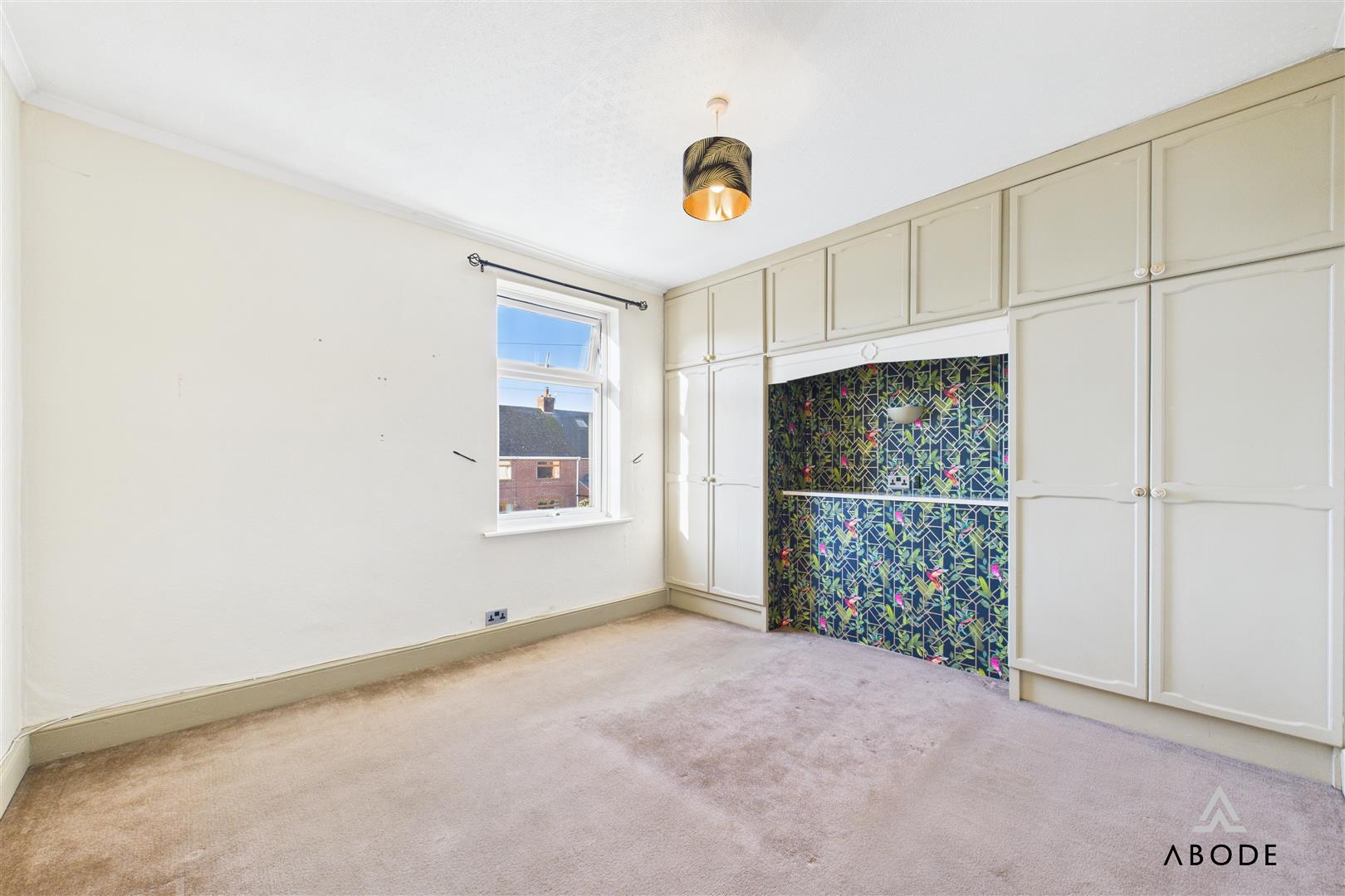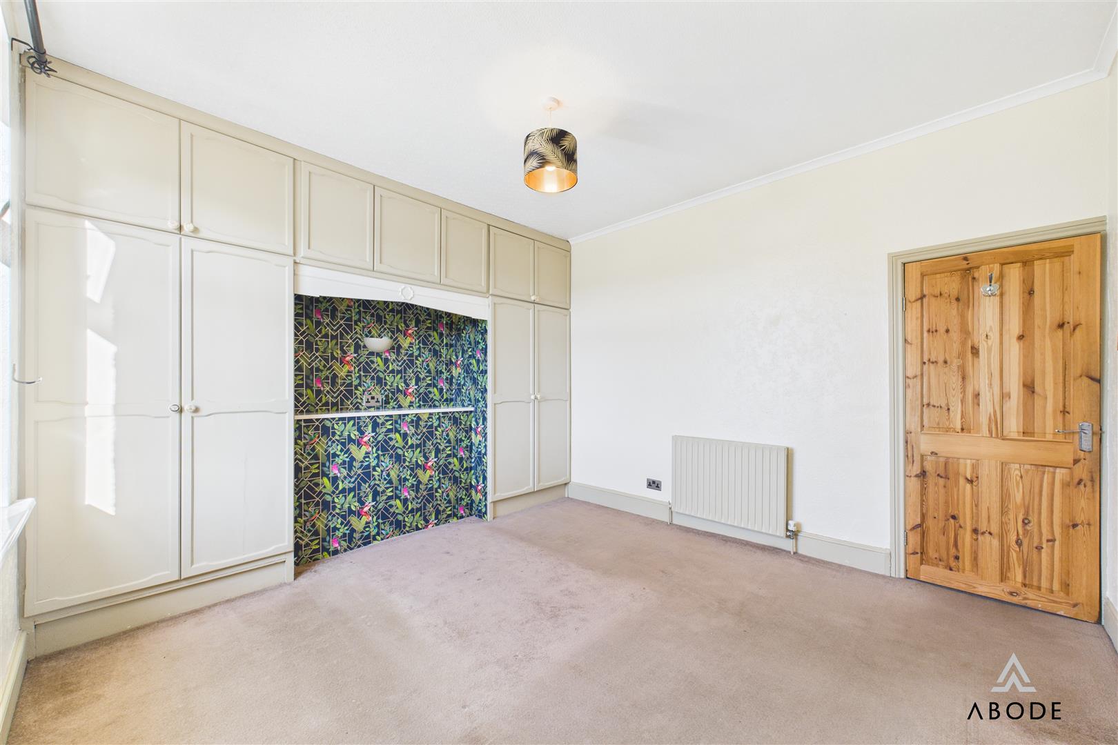 A spacious double bedroom with a UPVC double-glazed window to the front elevation and a range of fitted double wardrobes including hanging rails, shelving and overhead cupboards. A central heating radiator and TV aerial point complete the room.