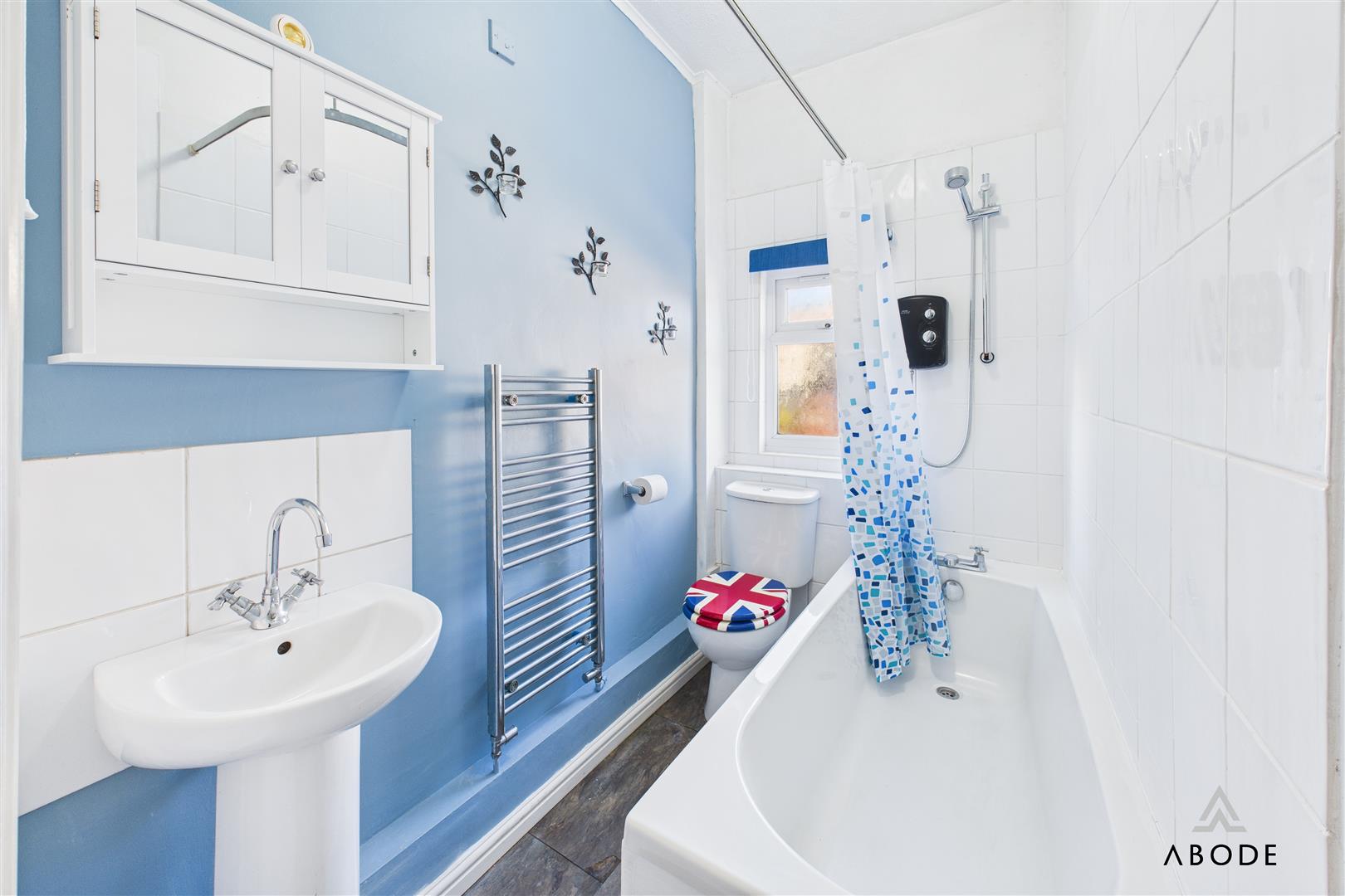 This stylish bathroom benefits from a UPVC double-glazed frosted window to the rear and a three-piece suite consisting of a low-level WC with continental flush, bath with electric shower over and a wash hand basin with tiled splashback. Complimentary wall tiling and a chrome heated towel radiator complete the room.