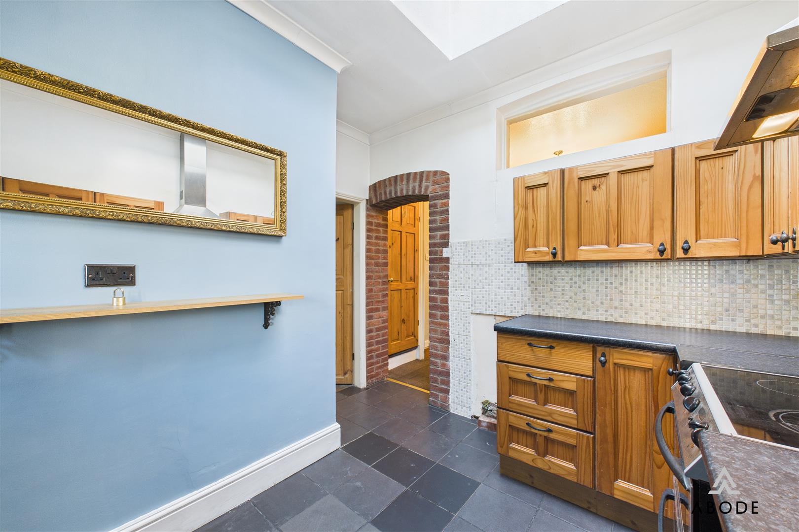 A well-designed kitchen with a UPVC double-glazed window to the rear and complementary tiled flooring. It offers a range of matching base and eye-level cupboards, roll-top work surfaces and tiled surrounds. Features include a stable oak rear entry door, central heating radiator and integrated appliances such as a stainless steel sink and drainer with mixer tap, cooker, hob and extractor hood. A double-glazed ceiling skylight provides further natural light, and there is plumbing for additional under-counter appliances. An internal door leads to two further areas including the bathroom.