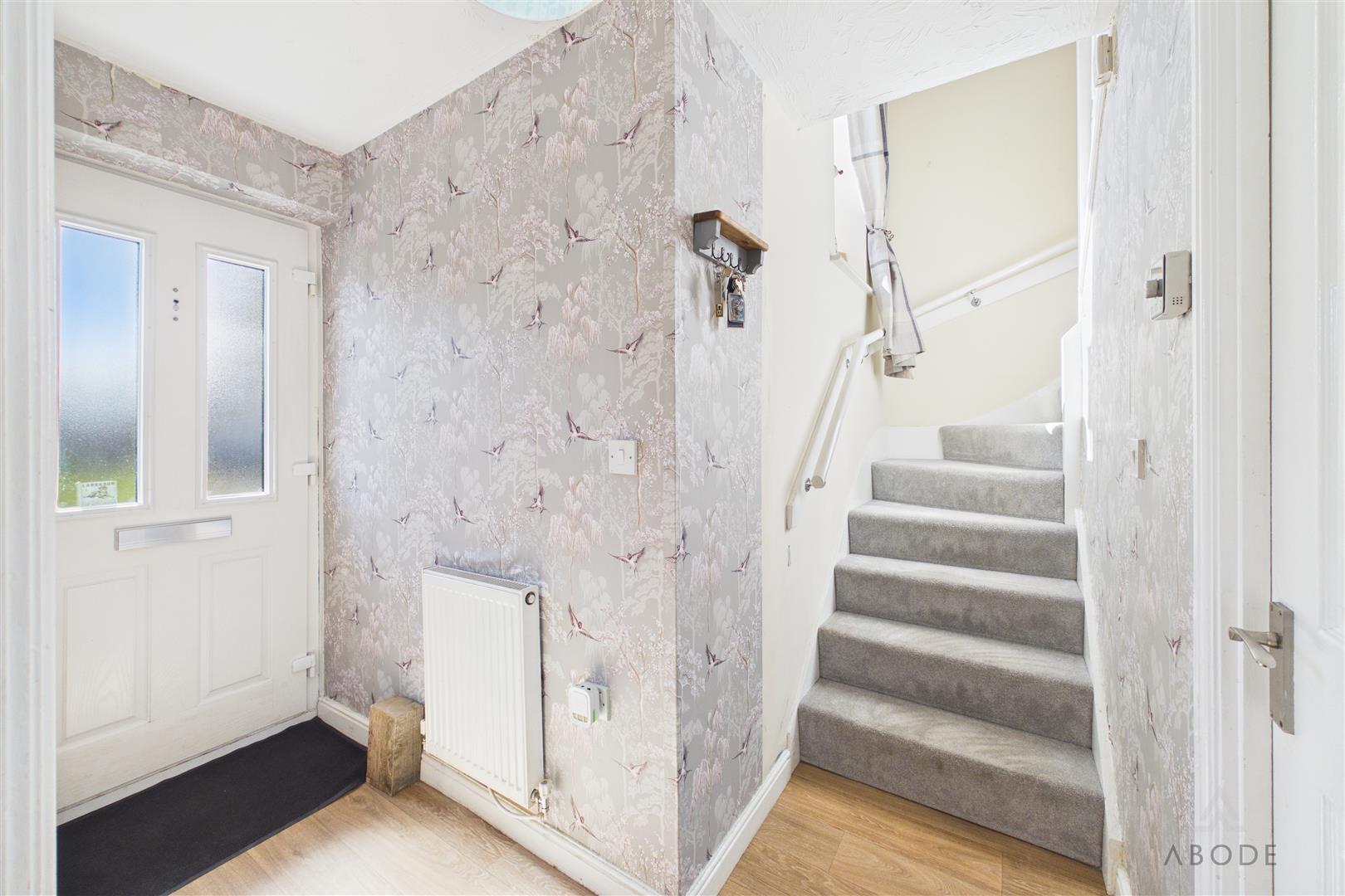 Composite door leading in from the front, central heating radiator, stairs leading up to the first floor.