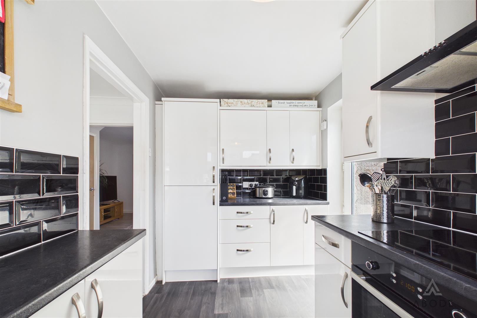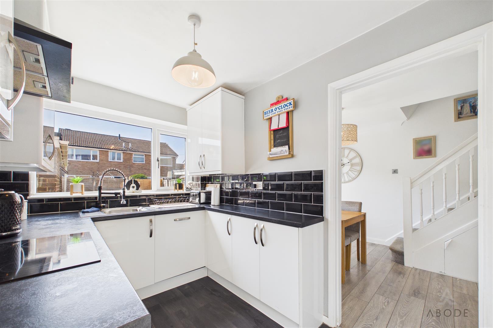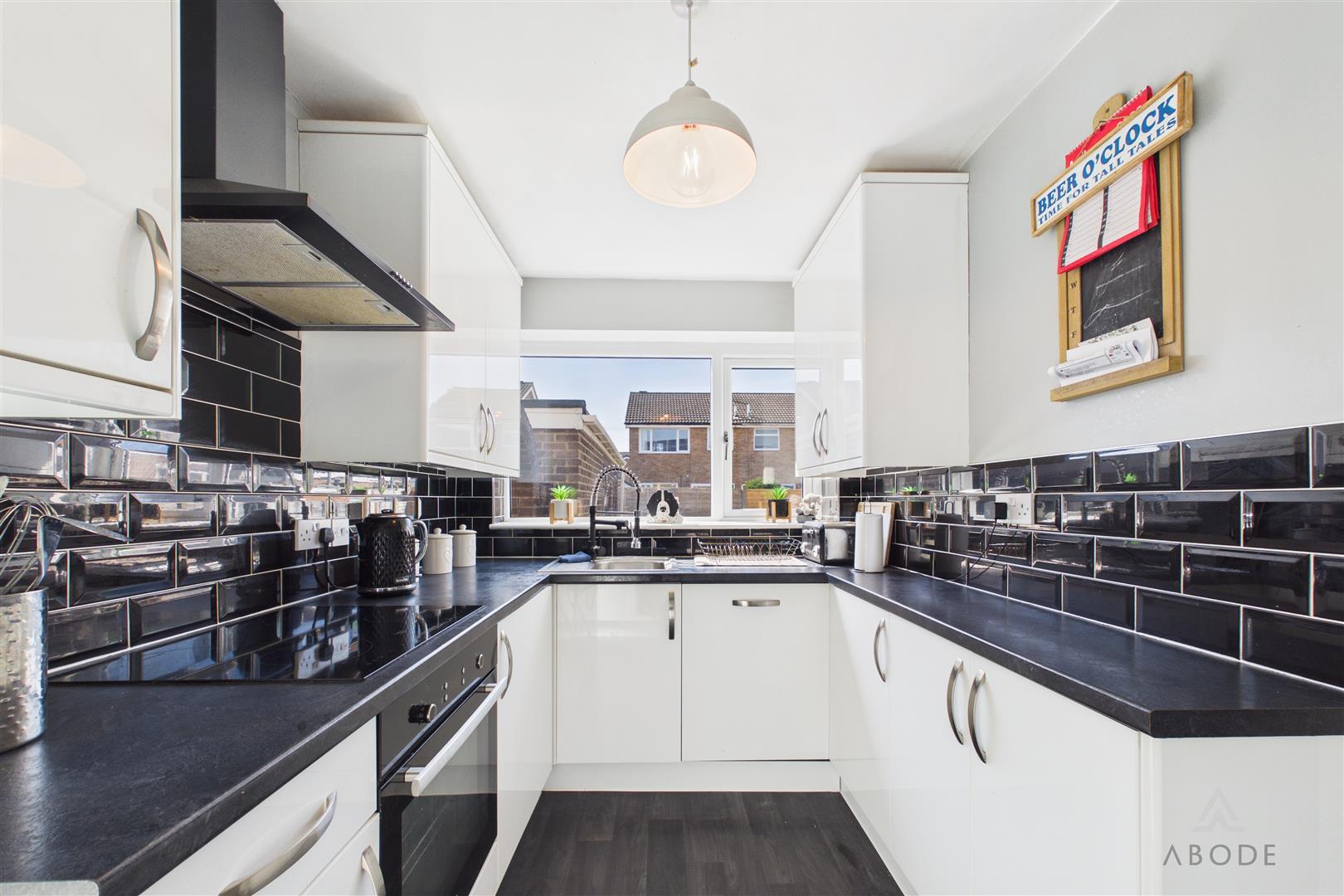 The kitchen is positioned off the dining room and is fitted with a range of modern wall and base units with contrasting work surfaces, integrated oven, hob with extractor over, and space for additional appliances. A window overlooks the rear garden, and a side door provides convenient external access.