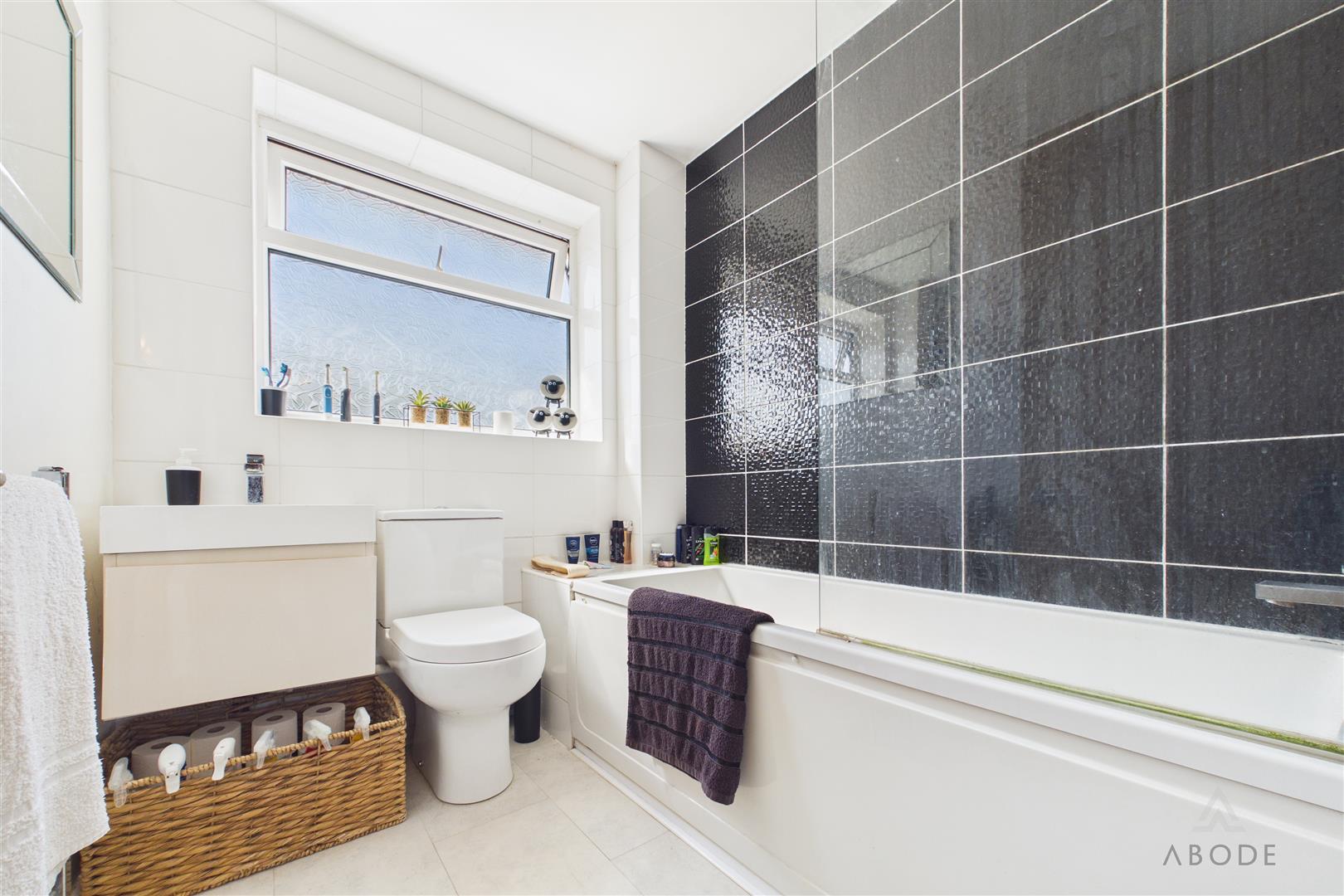 The family bathroom is fitted with a modern suite comprising a bath with shower over and screen, wash hand basin, and low-level WC, finished with contemporary tiling.