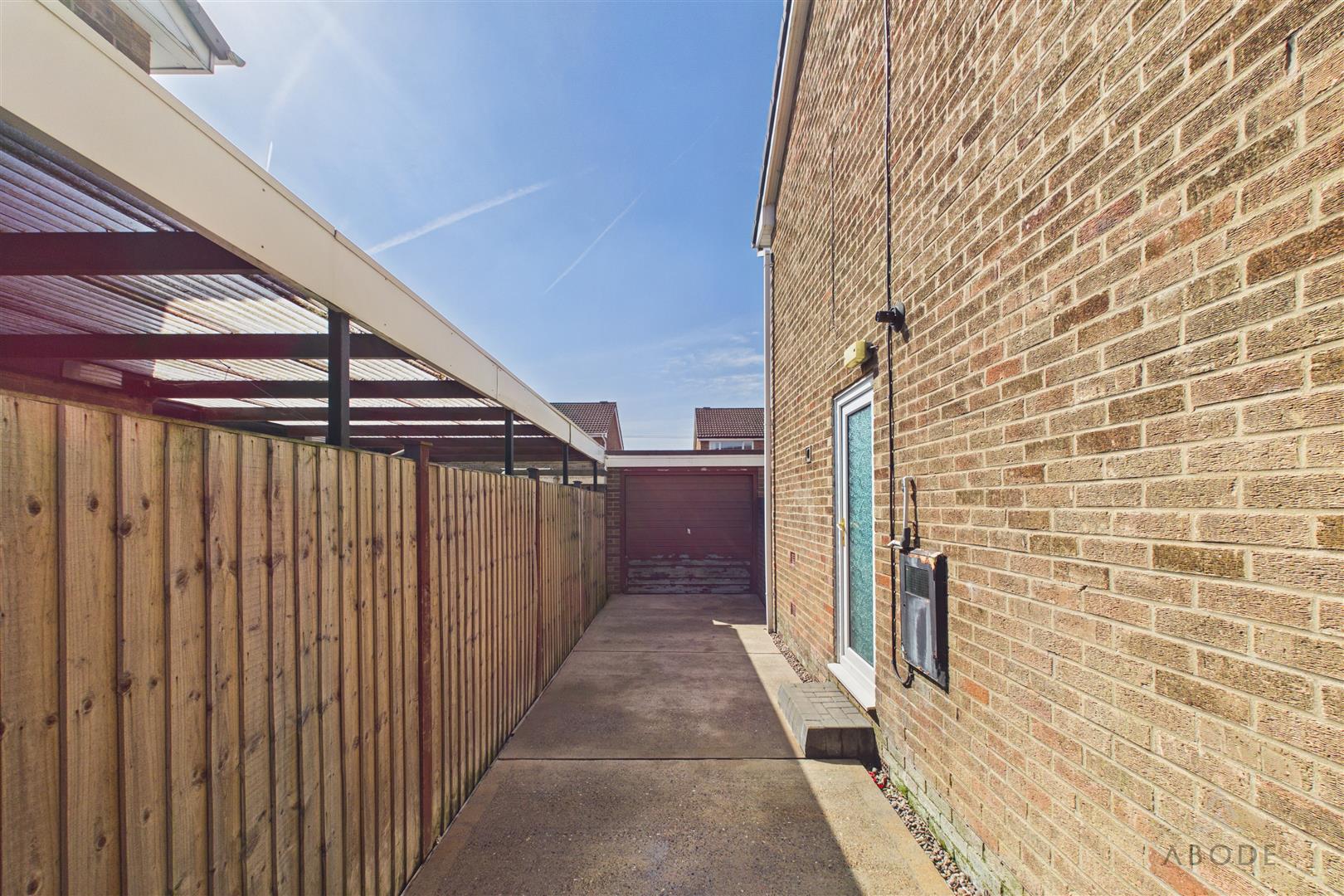 A detached garage is located to the rear, with access via a side driveway, providing additional storage or parking.