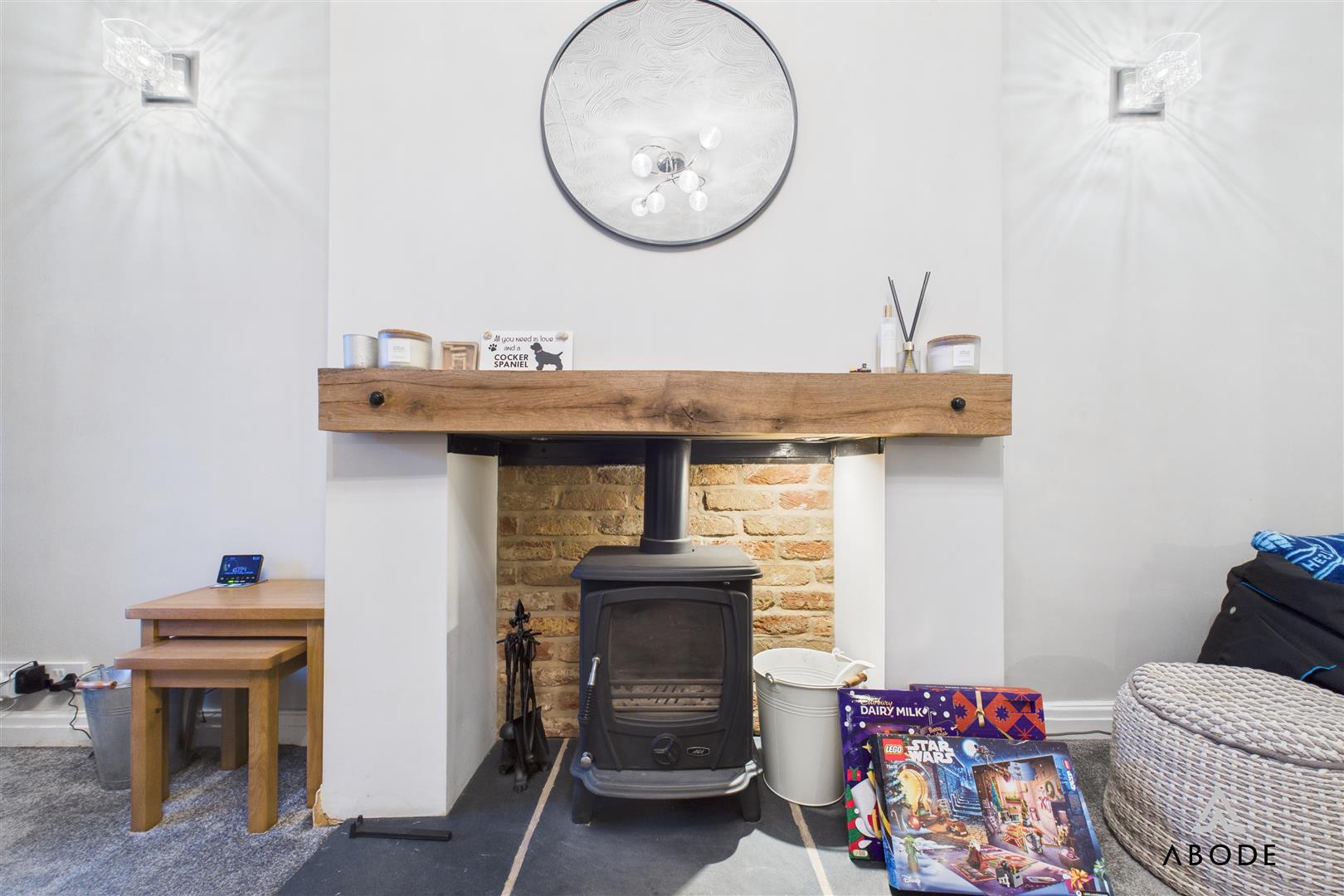 Double glazed window to the front elevation, central heating radiator, feature fireplace with log burner, open to;-