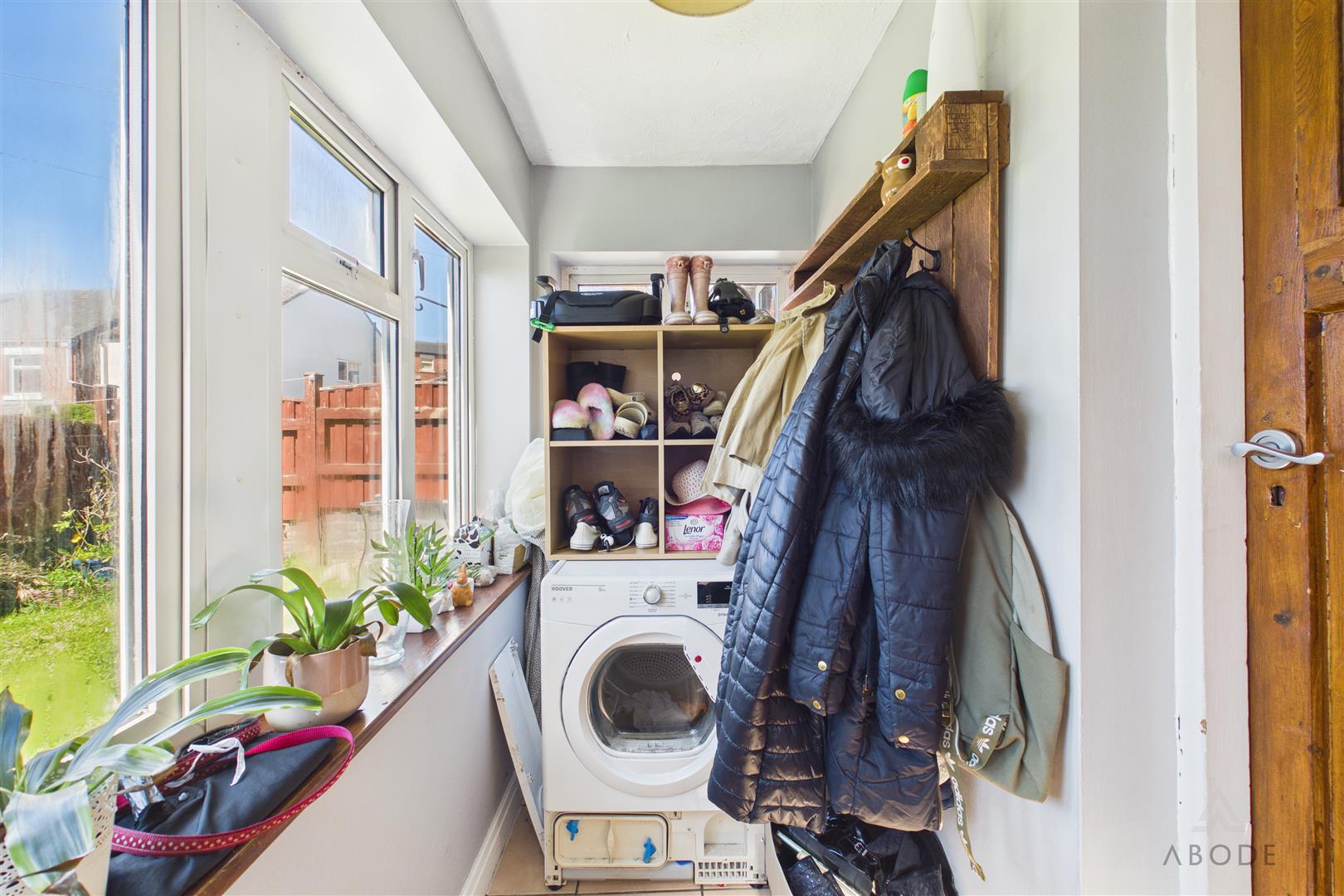 A useful entrance porch providing a sheltered approach into the home, featuring a tiled floor, uPVC windows, space for a tumble dryer and a secure front door.