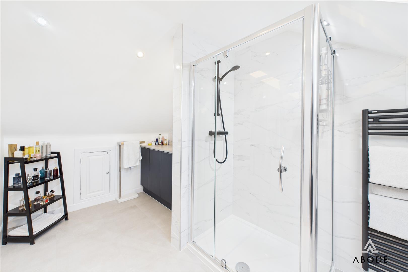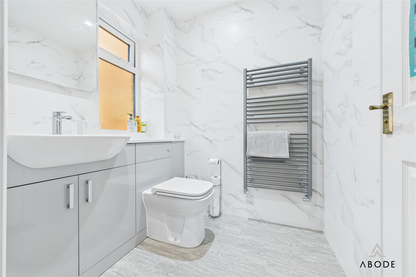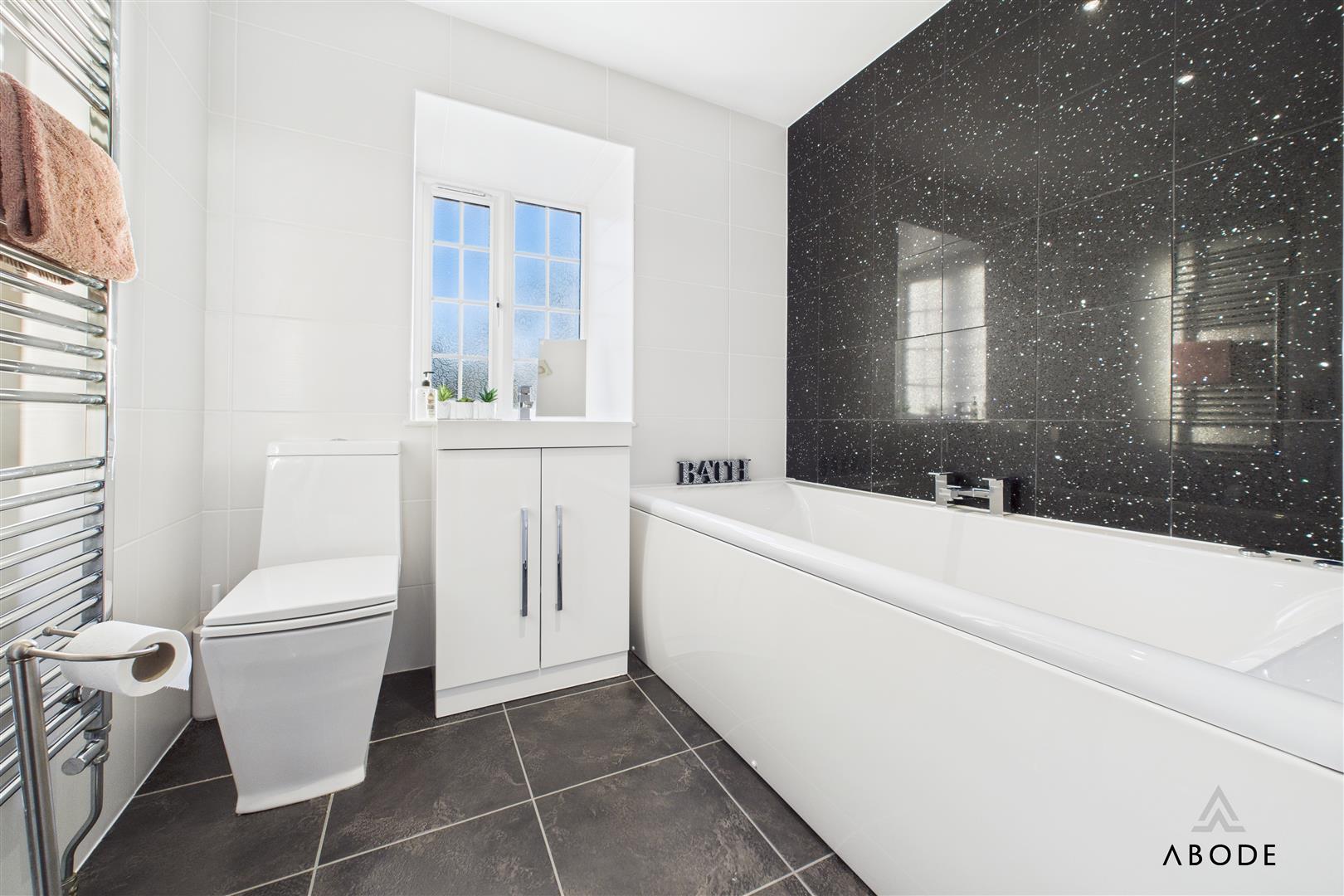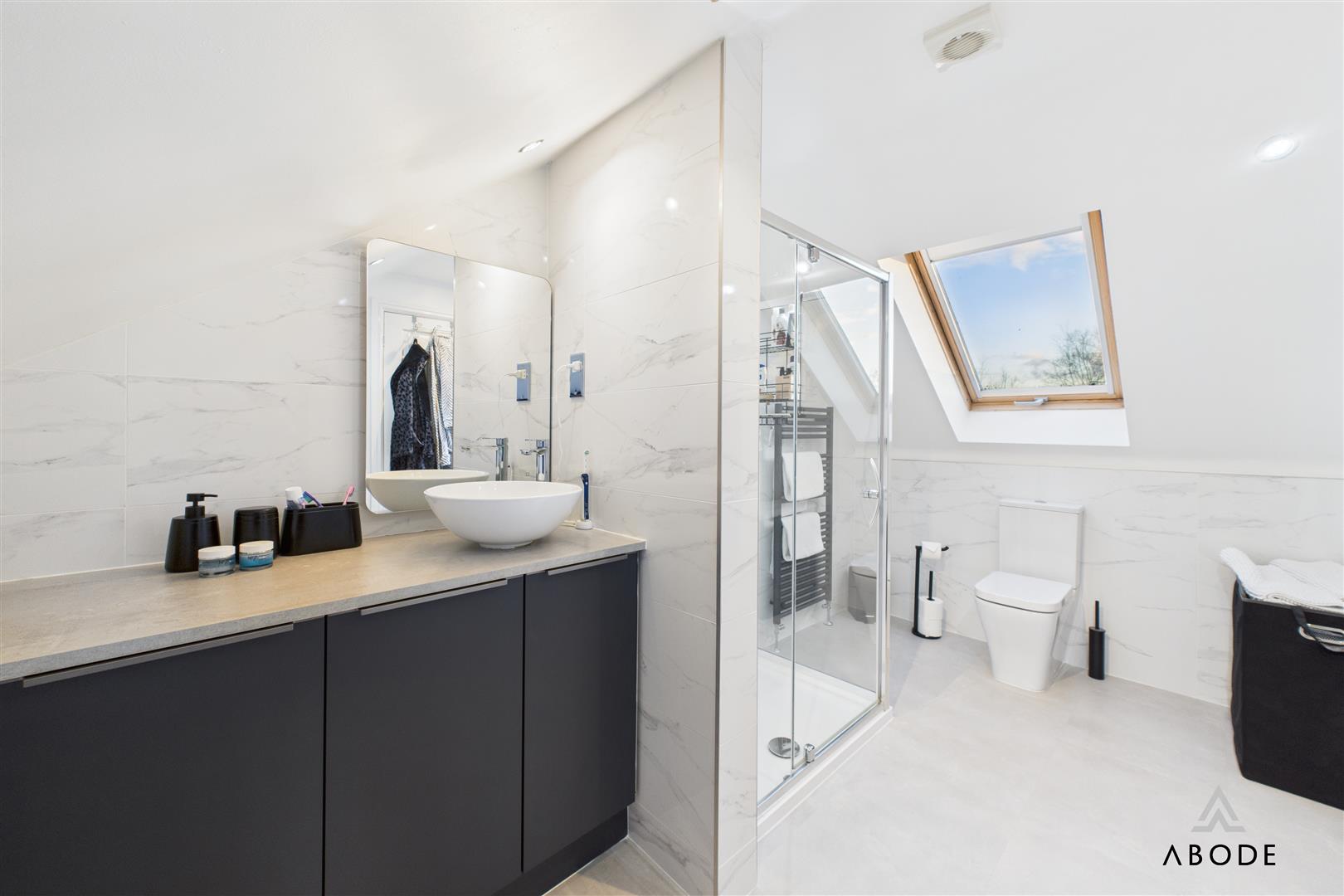 Two of these bedrooms enjoy their own en-suite shower rooms, each fitted with contemporary sanitaryware, glazed shower enclosures and modern tiling. The remaining bedrooms are served by the main family bathroom, which is fitted with a bath, wash-hand basin set into vanity storage and WC, along with a heated towel rail. This floor offers excellent flexibility for family members, guests, dressing rooms or home offices.