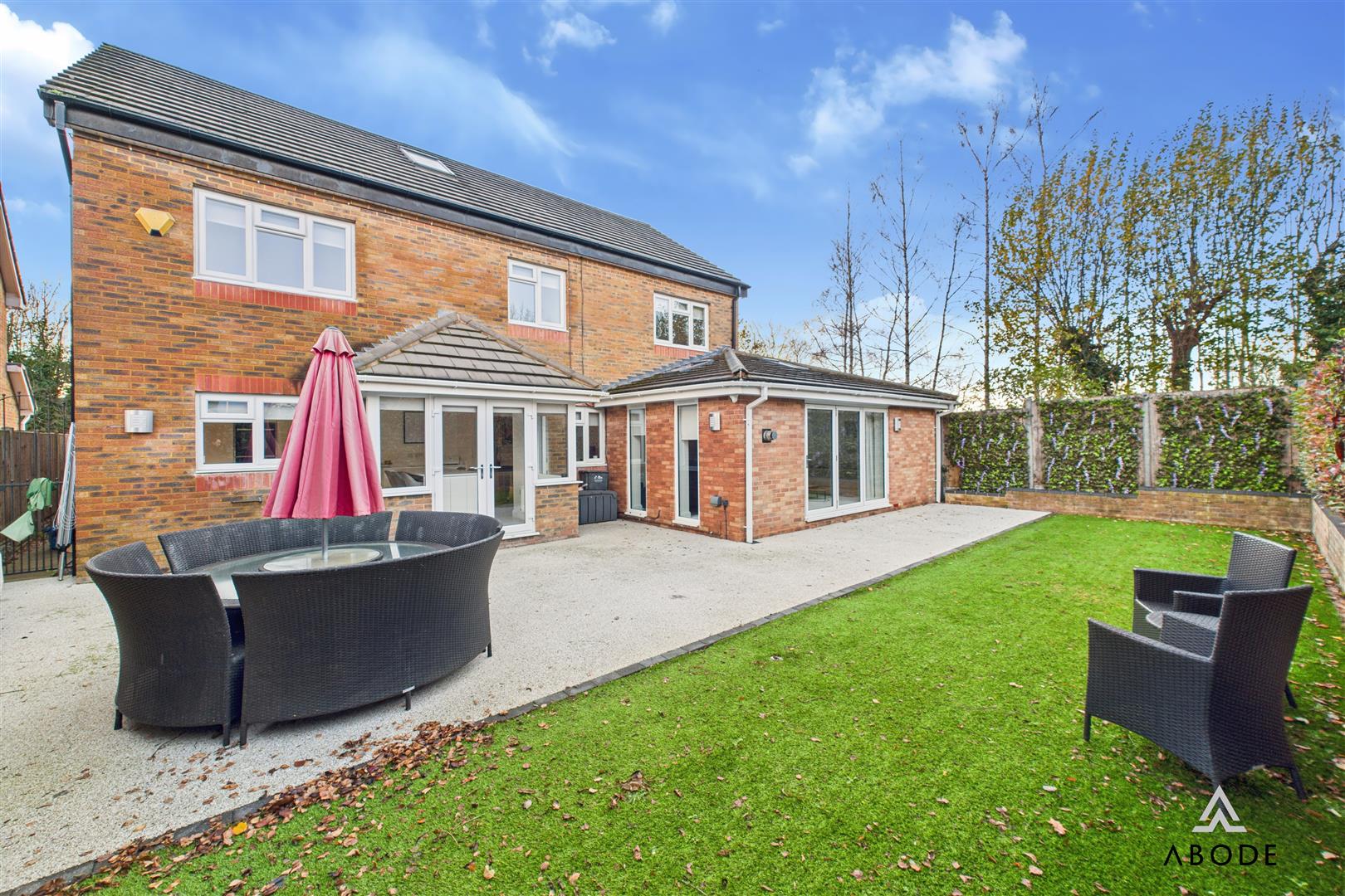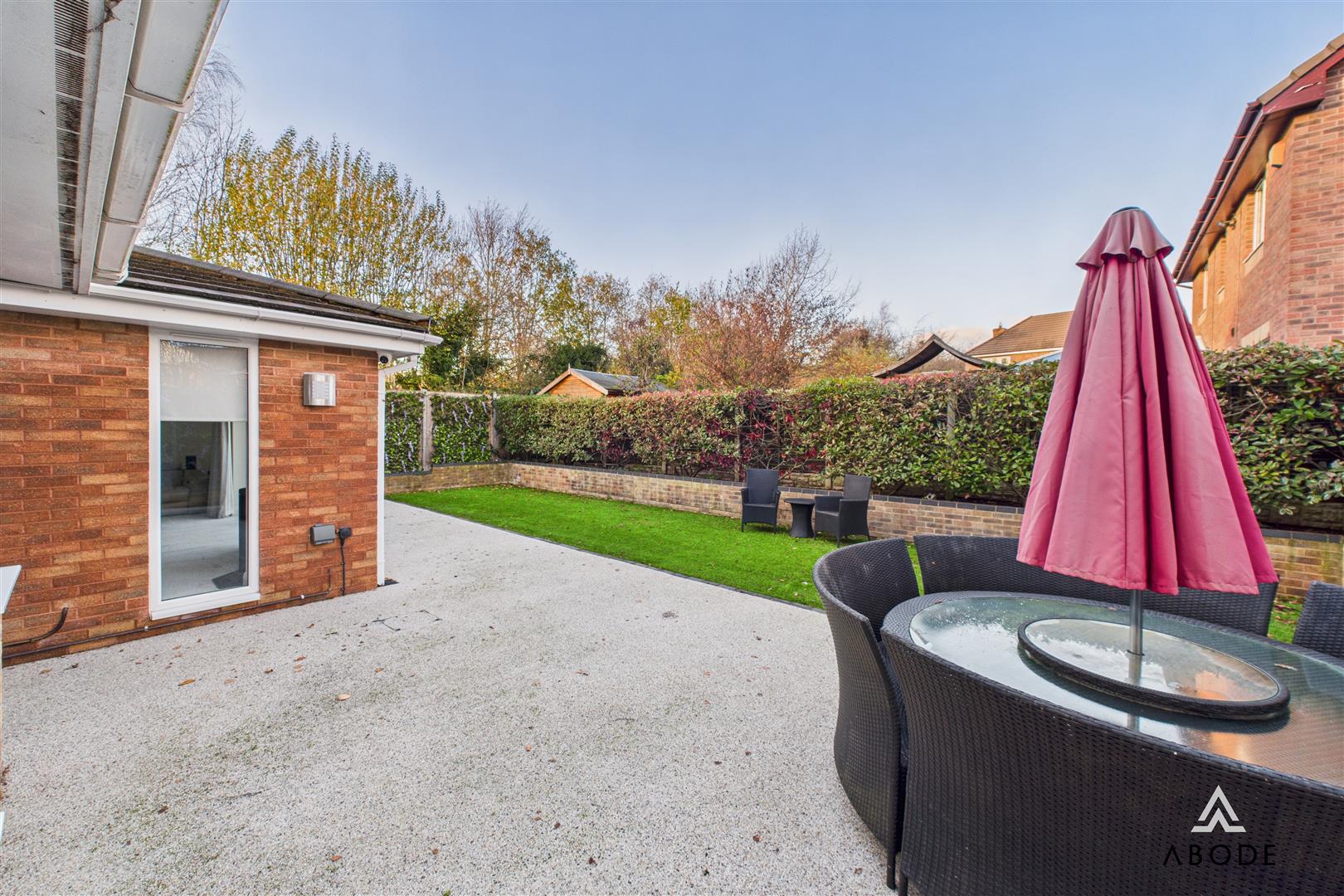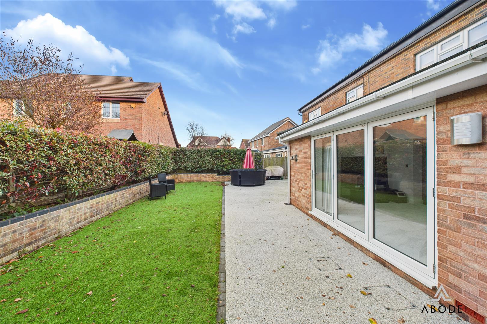 The rear garden offers an attractive and manageable outdoor space, with a lawn bordered by established planting and a generous patio running along the rear of the property. The bi-fold doors from the garden room open directly onto this patio, making it ideal for barbecues, entertaining or simply relaxing outside.