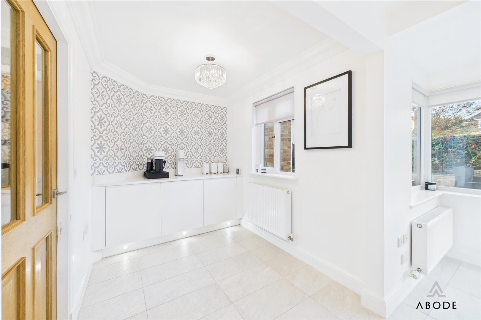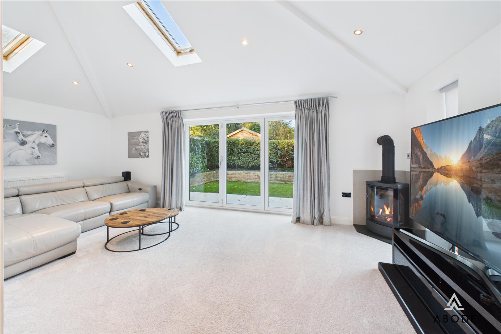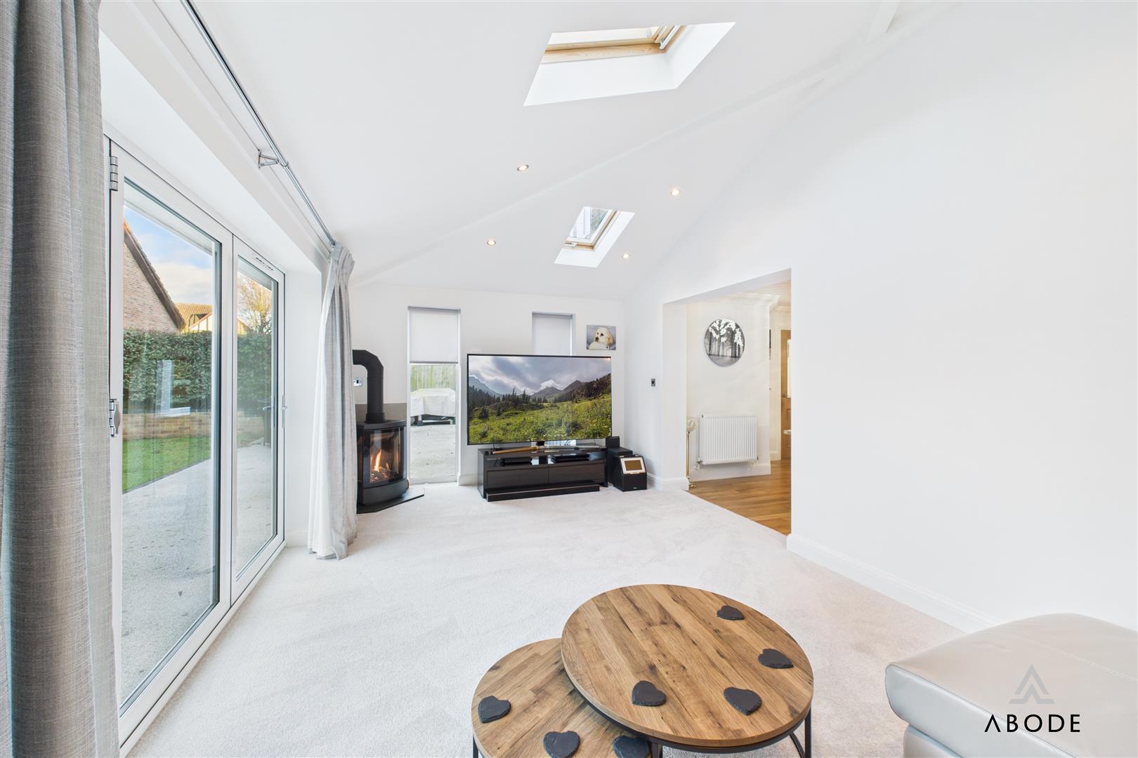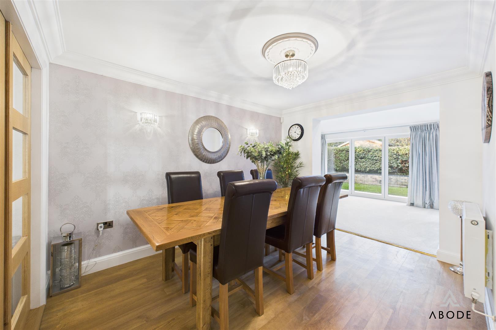 The dining room sits between the sitting room and the garden room, providing plenty of space for a family-sized dining table. An open walkway leads through into the garden room, a standout feature of the home with its vaulted ceiling, skylights and bi-fold doors opening straight onto the rear patio. This creates a superb indoor–outdoor entertaining space and a lovely place to sit and enjoy the garden.