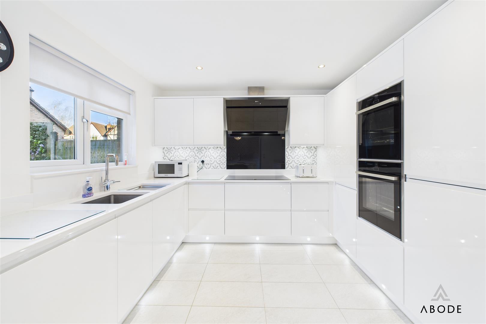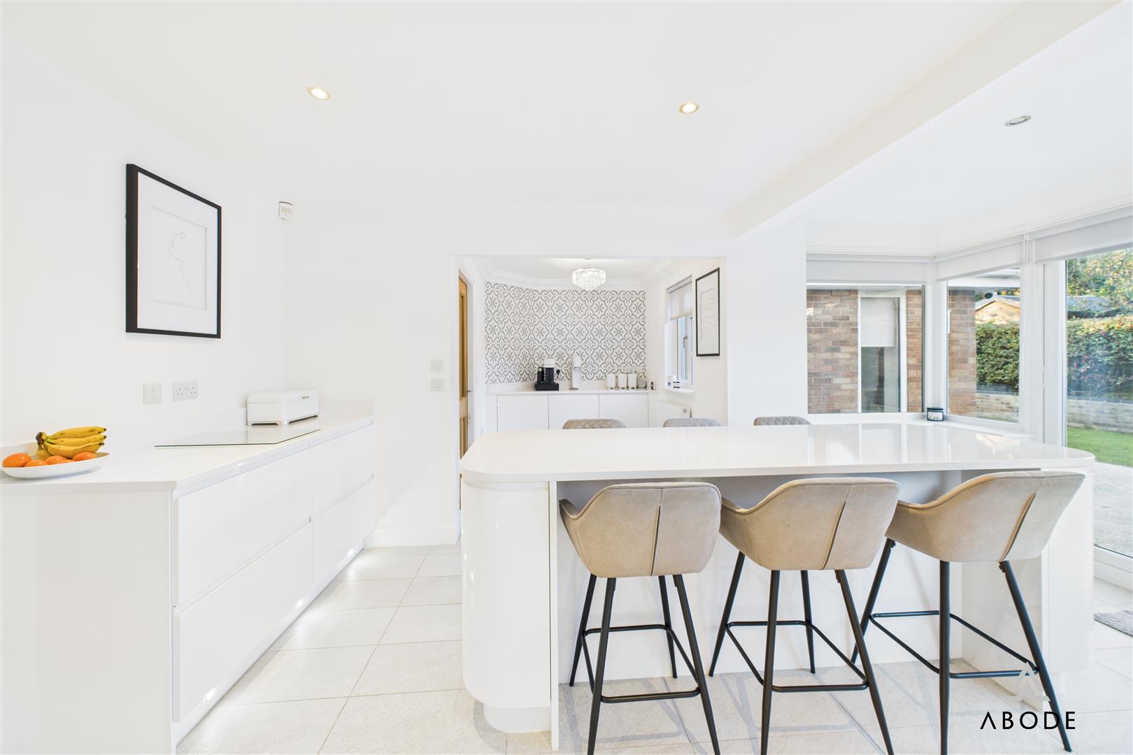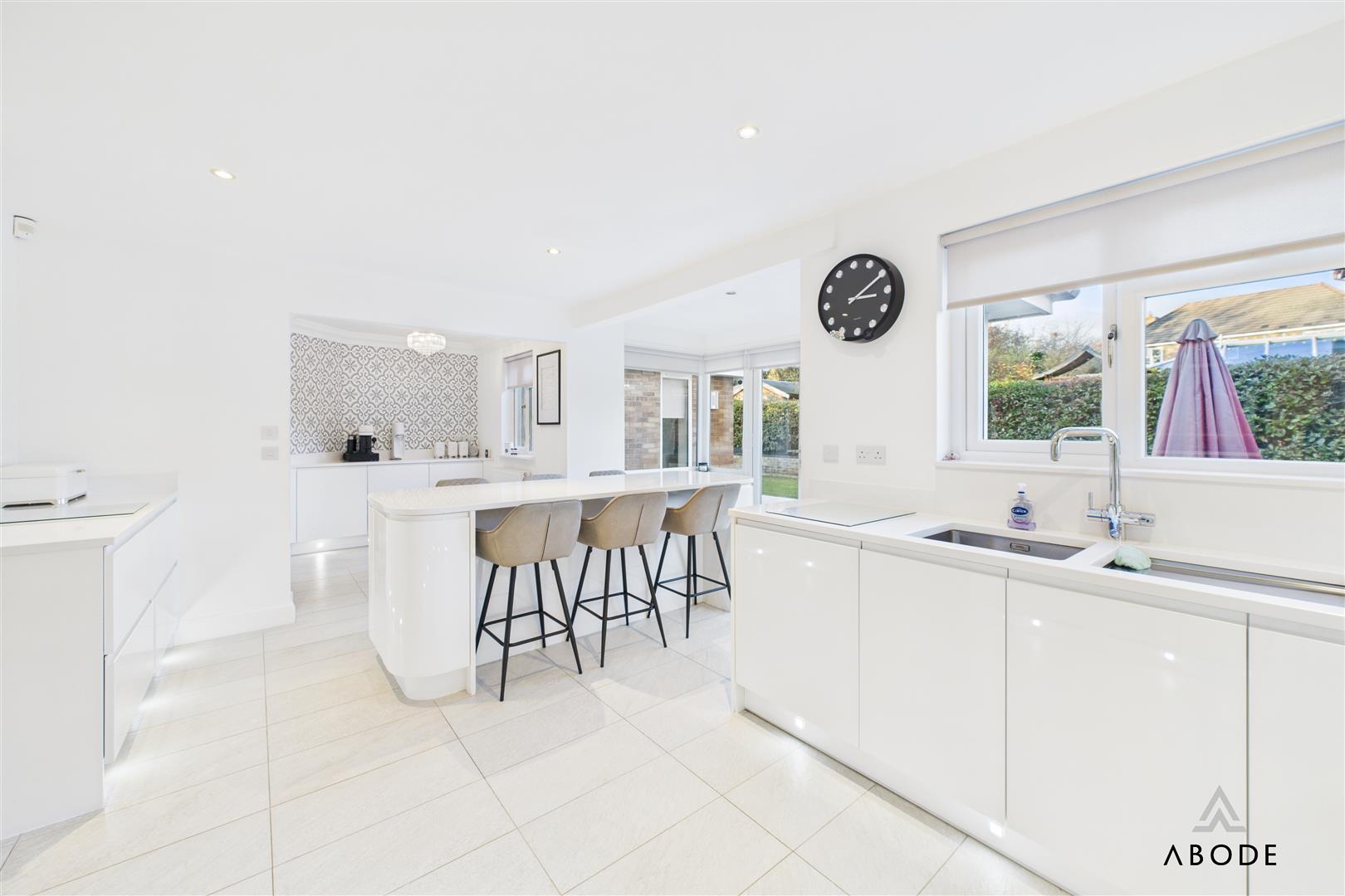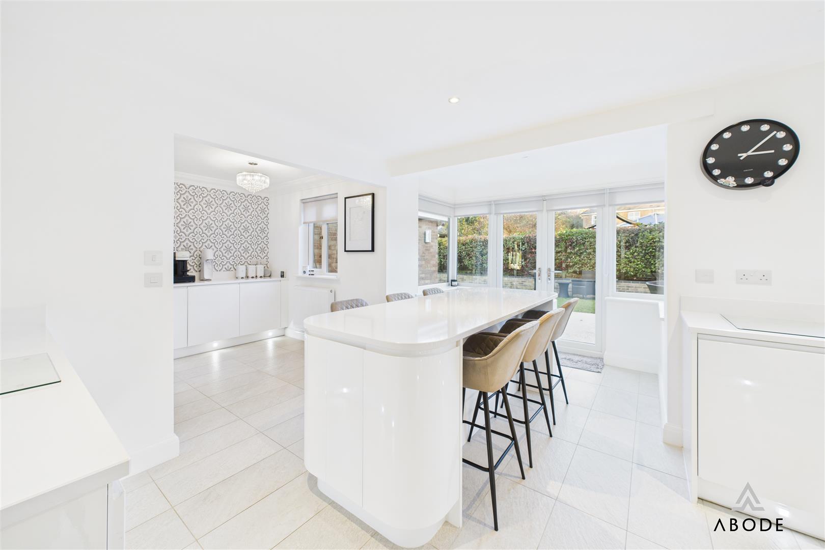 The dining room sits between the sitting room and the garden room, providing plenty of space for a family-sized dining table. An open walkway leads through into the garden room, a standout feature of the home with its vaulted ceiling, skylights and bi-fold doors opening straight onto the rear patio. This creates a superb indoor–outdoor entertaining space and a lovely place to sit and enjoy the garden.