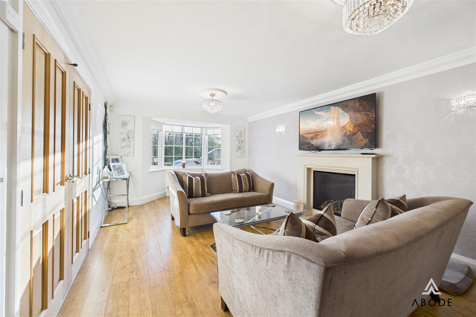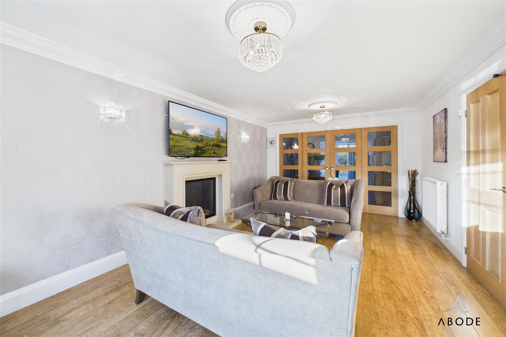 To the left of the hallway is the sitting room, centred around an attractive feature fireplace. This room is ideal for more formal entertaining or relaxed evenings and benefits from glazed double doors opening into the dining room, allowing the two spaces to be used either separately or as one large entertaining area.