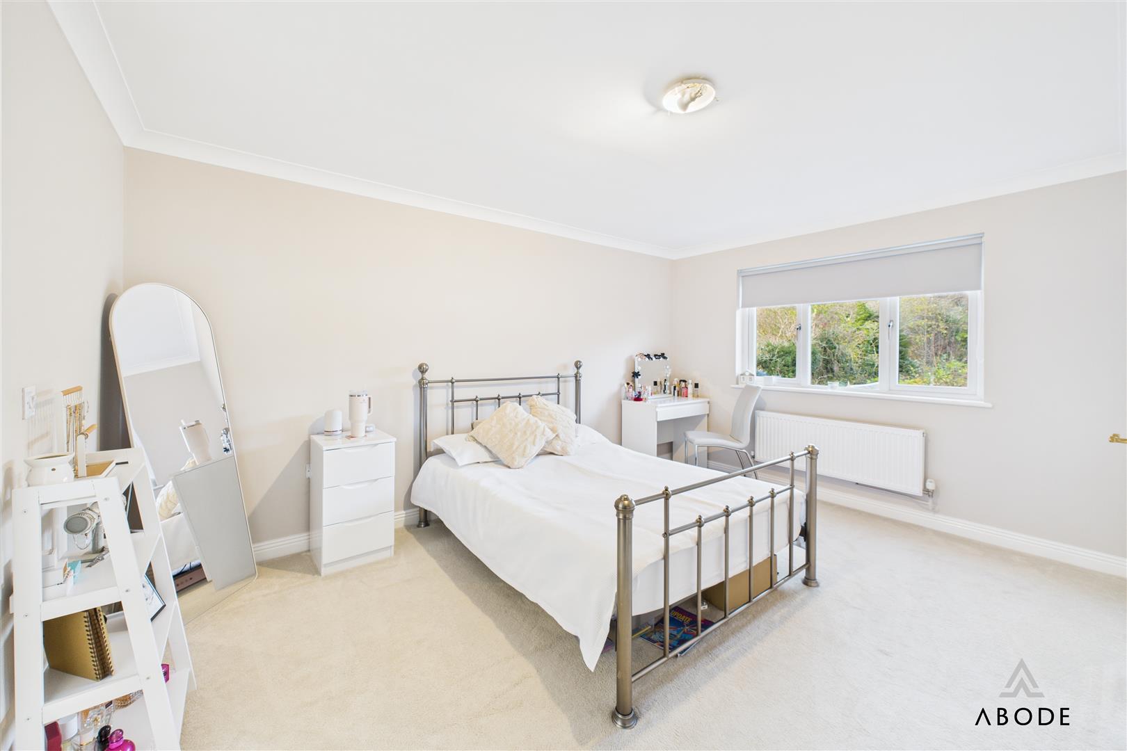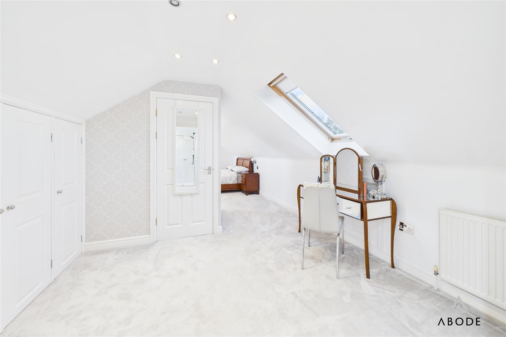 A spacious dressing area adjoins the bedroom, complete with built-in storage and space for further wardrobes or dressing furniture. The suite is completed by a stylish en-suite shower room, appointed with a large glass shower enclosure, modern tiling, wash basin with storage and WC.