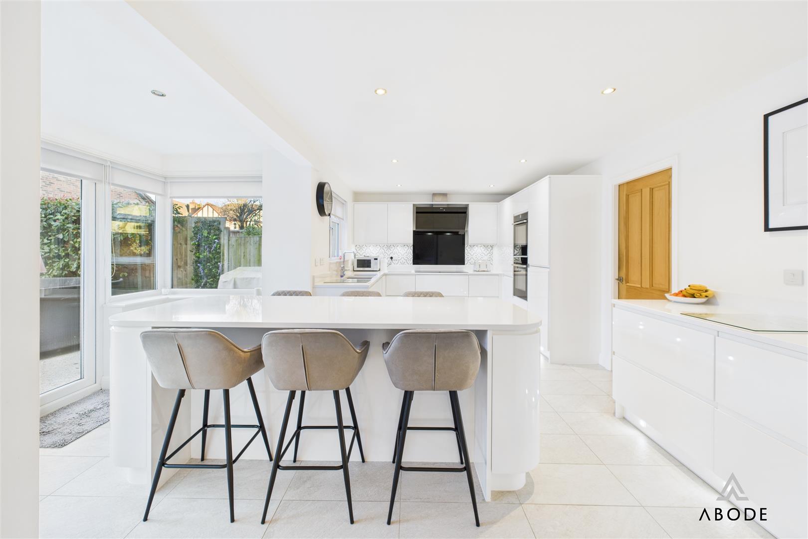 The kitchen is fitted with a comprehensive range of units and granite preparation surfaces, with integrated appliances and good storage. It flows through into the extended kitchen diner across the rear of the property, offering further space for informal dining or seating and enjoying views over the garden.